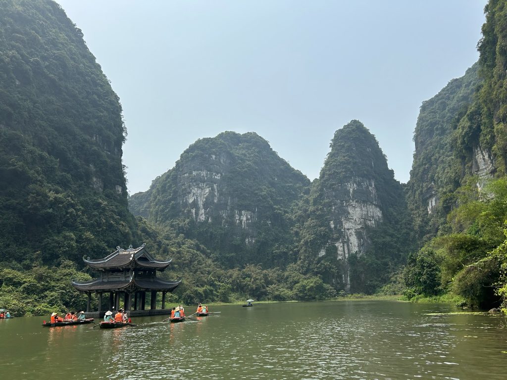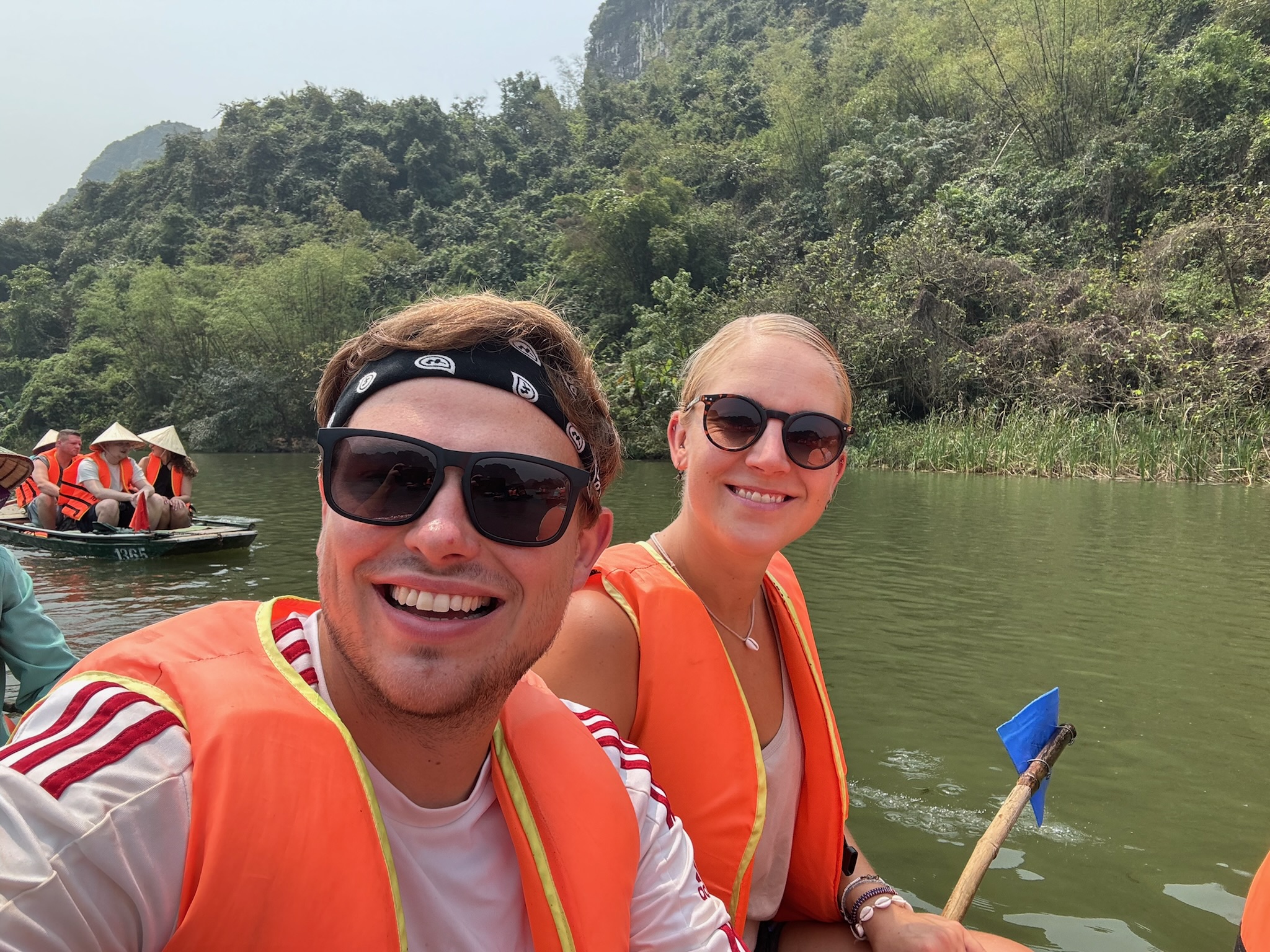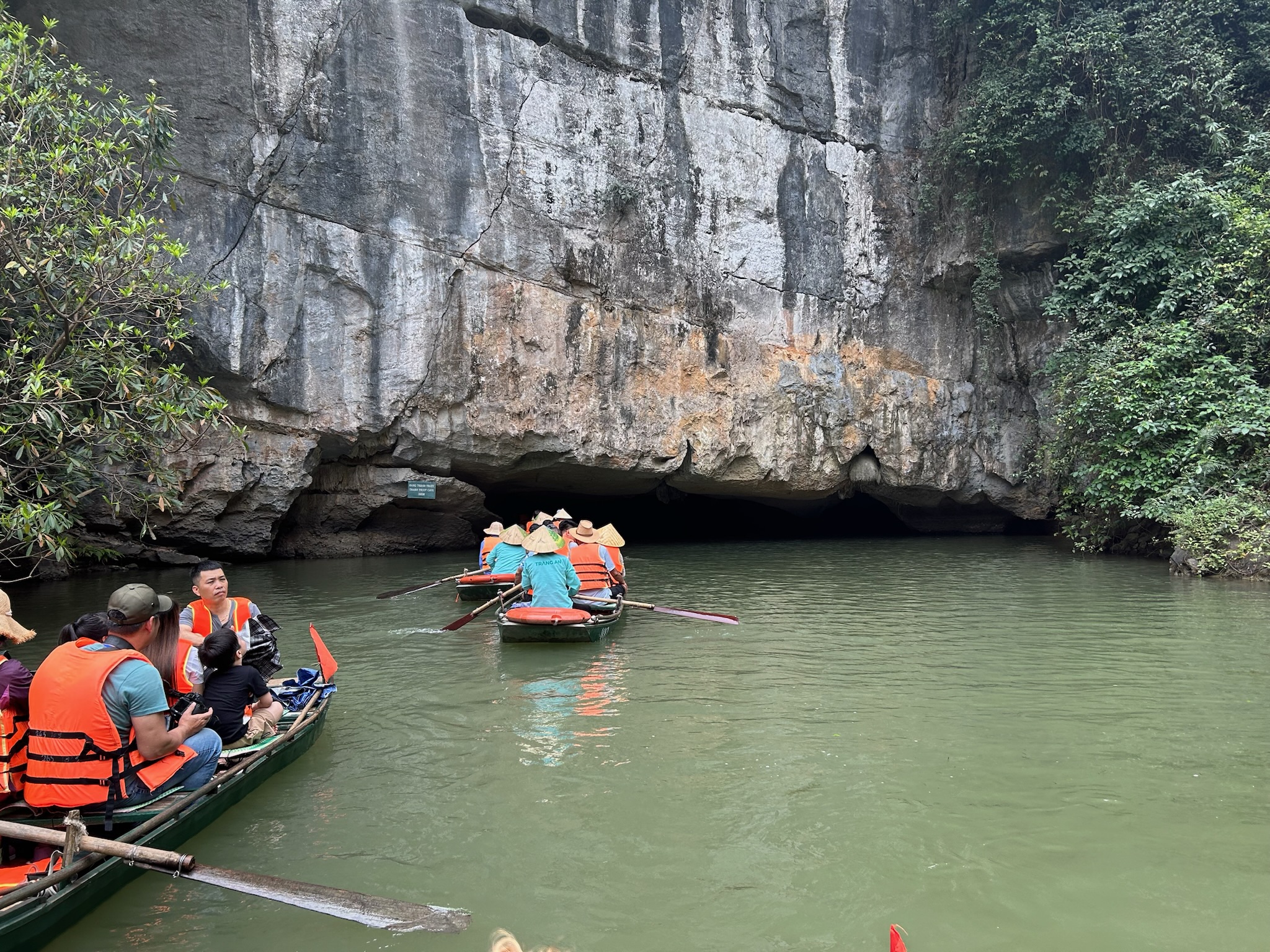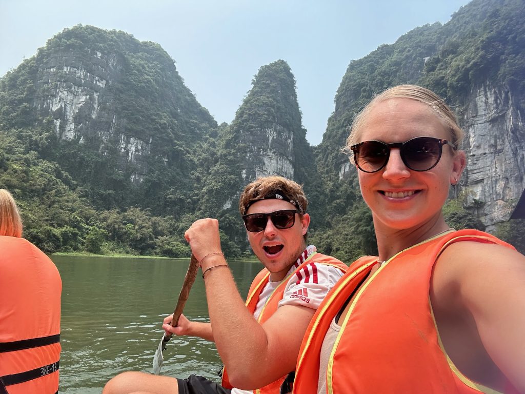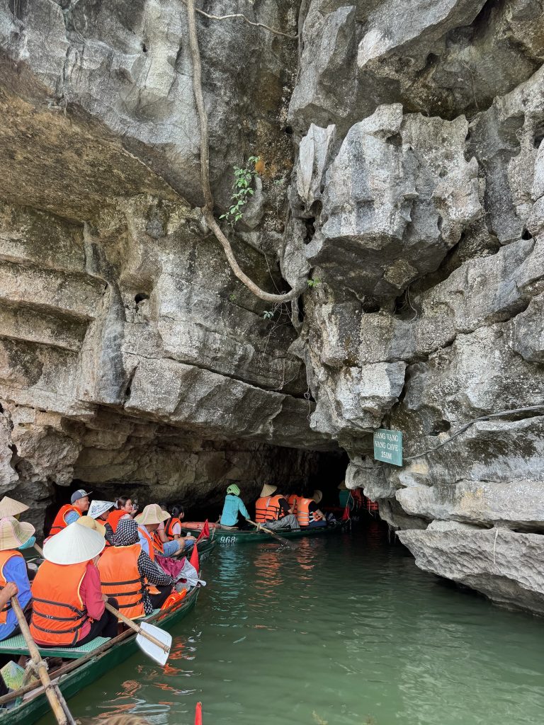 Heute bestellten wir das Frühstück früher, aber kamen leider trotzdem nicht so früh los wie geplant. Heute wollten wir eine der bekannten Bootstouren auf einem Fluss durch die trockene Halong-Bucht und durch Höhlen durch machen. Wir haben gelesen, dass die bekannte Fahrt ab Tam Coc zu überlaufen ist und die Bootsführer*innen zu penetrant sind. Also wollten wir die Fahrt ab Trang An machen, die genau so schön sein soll. Nach einer 15 minütigen Fahrt mit dem Roller kamen wir beim Parkplatz an und kauften uns ein Ticket (ca. 9€ p.P.). Wir konnten uns eine von vier Routen aussuchen und entschieden uns für Route 2. Danach liefen wir zum Bootsanleger und stellten uns an. Es war super viel los und es dauerte von der Ankunft eine Stunde bis wir im Boot saßen. Man musste zu viert in ein Boot und wir trafen in der Schlange zwei Backpackerinnen, mit denen wir nach einer kurzen Absprache zusammen in ein Boot stiegen. Um 11 Uhr ging die Fahrt dann endlich los und wir mussten Schwimmwesten anziehen. Die Fahrt dauerte 2,5 Stunden und führte über einen breiten Fluss zwischen den Felsen entlang. Wir fuhren auf der Strecke durch vier flache Höhlen durch, wo man teilweise den Kopf einziehen muss, aber die breit und ausgeleuchtet sind, sodass man keine Platzangst kriegen muss. Außerdem kamen wir an drei Tempeln vorbei, an denen wir ausstiegen und ein bisschen Zeit zum besichtigen hatten, aber alle irgendwie ähnlich waren. Unsere Bootsführerin konnte kein Englisch aber bat uns mit Paddeln zu helfen, was Marco und ich bei der langen Fahrt auch gerne taten – die Arme macht das ja bestimmt den ganzen Tag lang.