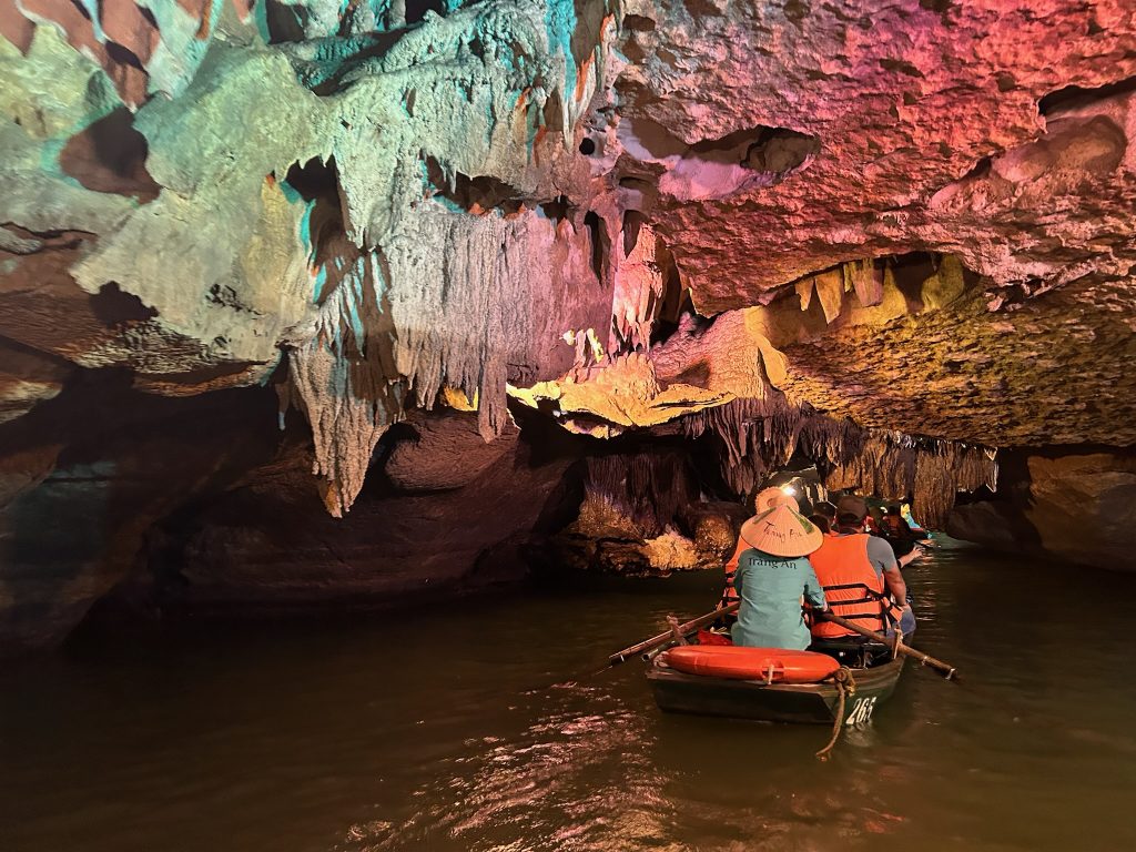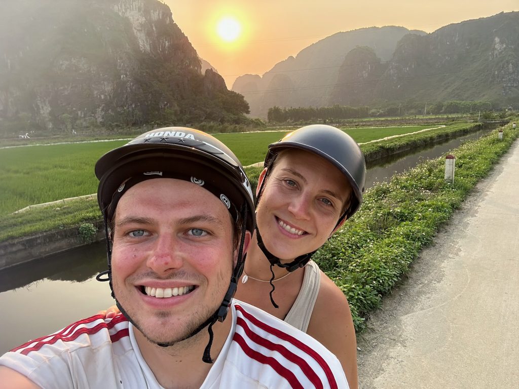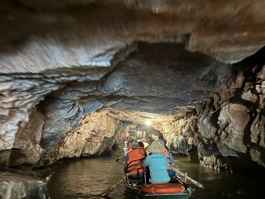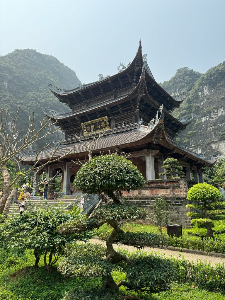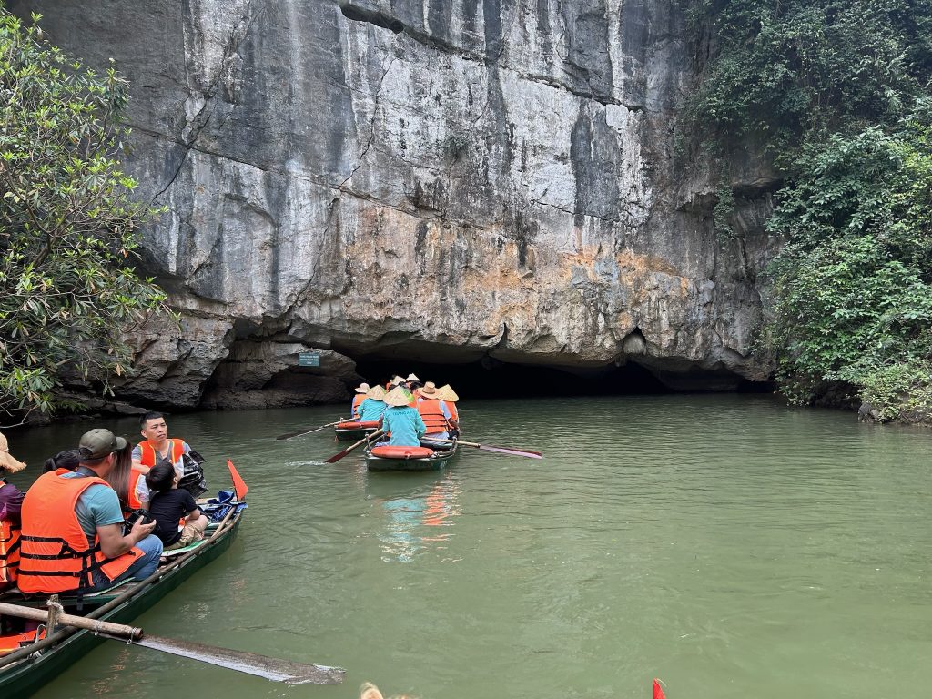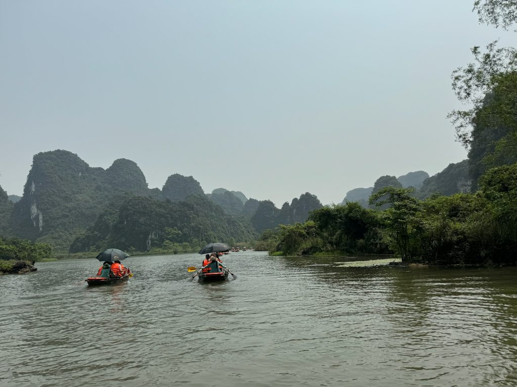 Heute bestellten wir das Frühstück früher, aber kamen leider trotzdem nicht so früh los wie geplant. Heute wollten wir eine der bekannten Bootstouren auf einem Fluss durch die trockene Halong-Bucht und durch Höhlen durch machen. Wir haben gelesen, dass die bekannte Fahrt ab Tam Coc zu überlaufen ist und die Bootsführer*innen zu penetrant sind. Also wollten wir die Fahrt ab Trang An machen, die genau so schön sein soll. Nach einer 15 minütigen Fahrt mit dem Roller kamen wir beim Parkplatz an und kauften uns ein Ticket (ca. 9€ p.P.). Wir konnten uns eine von vier Routen aussuchen und entschieden uns für Route 2. Danach liefen wir zum Bootsanleger und stellten uns an. Es war super viel los und es dauerte von der Ankunft eine Stunde bis wir im Boot saßen. Man musste zu viert in ein Boot und wir trafen in der Schlange zwei Backpackerinnen, mit denen wir nach einer kurzen Absprache zusammen in ein Boot stiegen. Um 11 Uhr ging die Fahrt dann endlich los und wir mussten Schwimmwesten anziehen. Die Fahrt dauerte 2,5 Stunden und führte über einen breiten Fluss zwischen den Felsen entlang. Wir fuhren auf der Strecke durch vier flache Höhlen durch, wo man teilweise den Kopf einziehen muss, aber die breit und ausgeleuchtet sind, sodass man keine Platzangst kriegen muss. Außerdem kamen wir an drei Tempeln vorbei, an denen wir ausstiegen und ein bisschen Zeit zum besichtigen hatten, aber alle irgendwie ähnlich waren. Unsere Bootsführerin konnte kein Englisch aber bat uns mit Paddeln zu helfen, was Marco und ich bei der langen Fahrt auch gerne taten – die Arme macht das ja bestimmt den ganzen Tag lang.