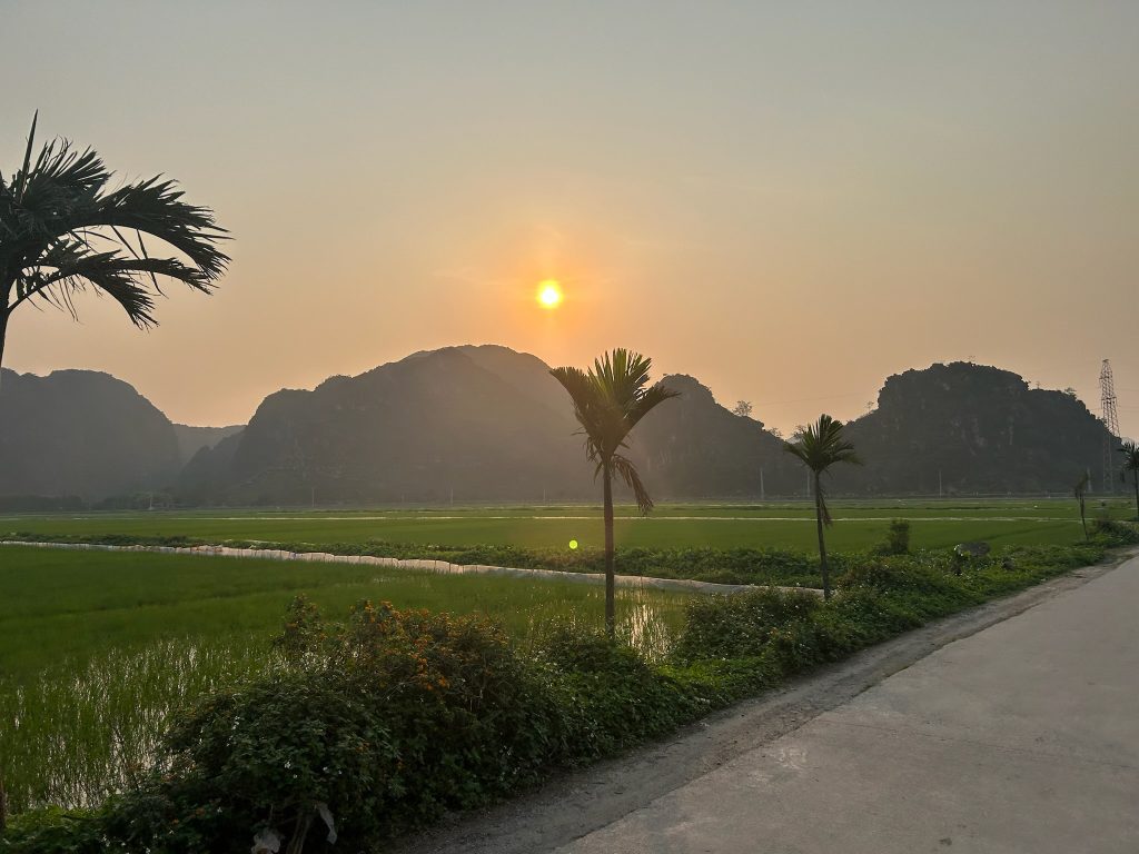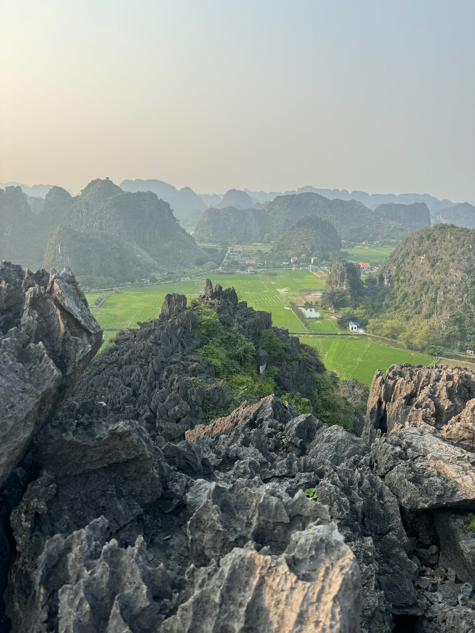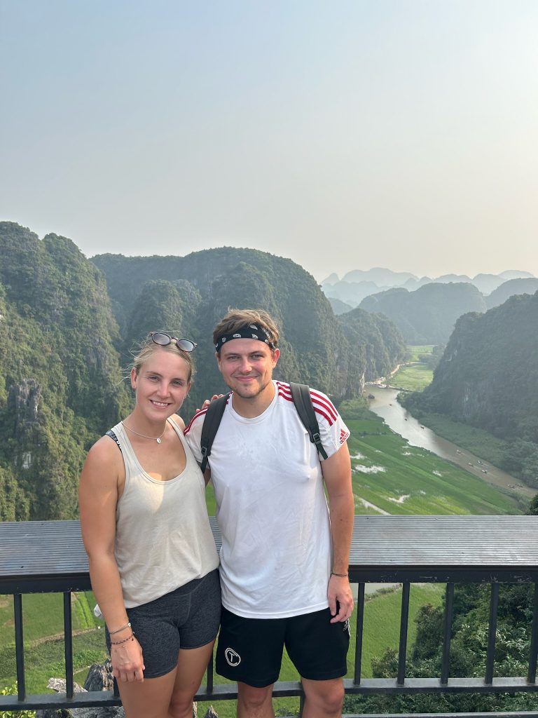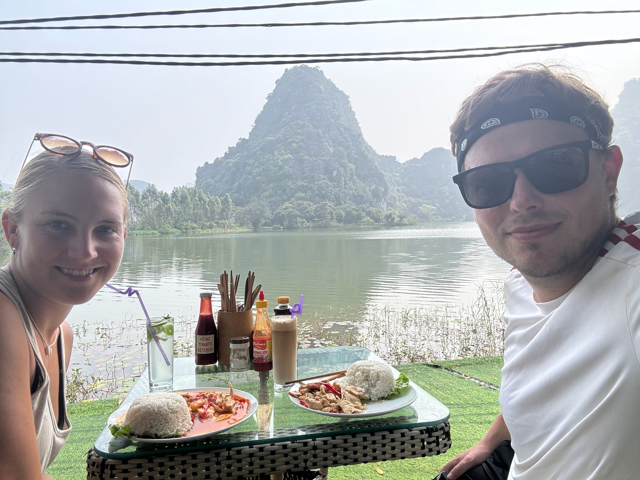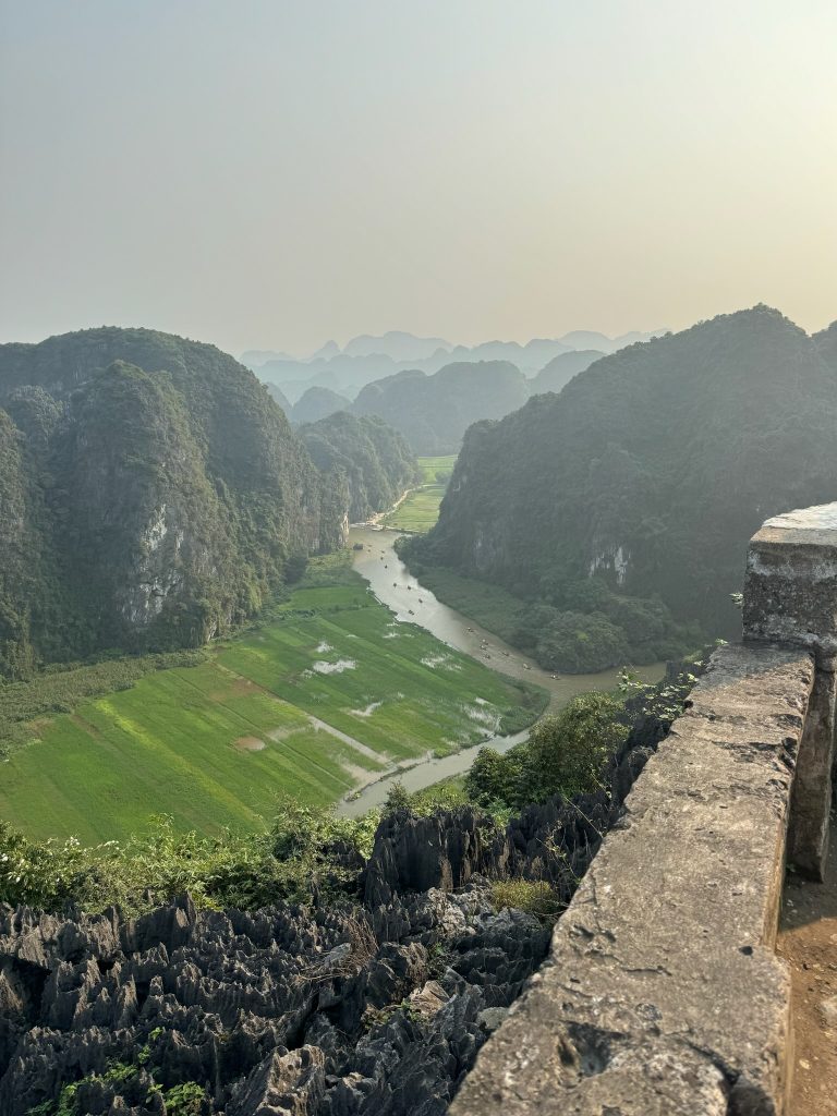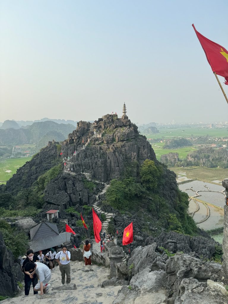 Nach der Bootsfahrt hielten wir an einem Restaurant um die Ecke, mit schöner Aussicht für unser Mittagessen. Auf dem Weg Richtung Tam Coc mussten wir lieber nochmal einen Liter tanken. Unser zweiter Tagespunkt für den Nachmittag war der Hang-Mua-Aussichtspunkt auf dem Berg des Liegenden Drachen. Wir stiegen ein paar hundert Treppenstufen bis zu zwei Aussichtspunkten, von denen man einen tollen Ausblick hatte, unter anderem auf einen Teil der anderen Bootstour ab Tam Coc.