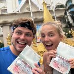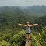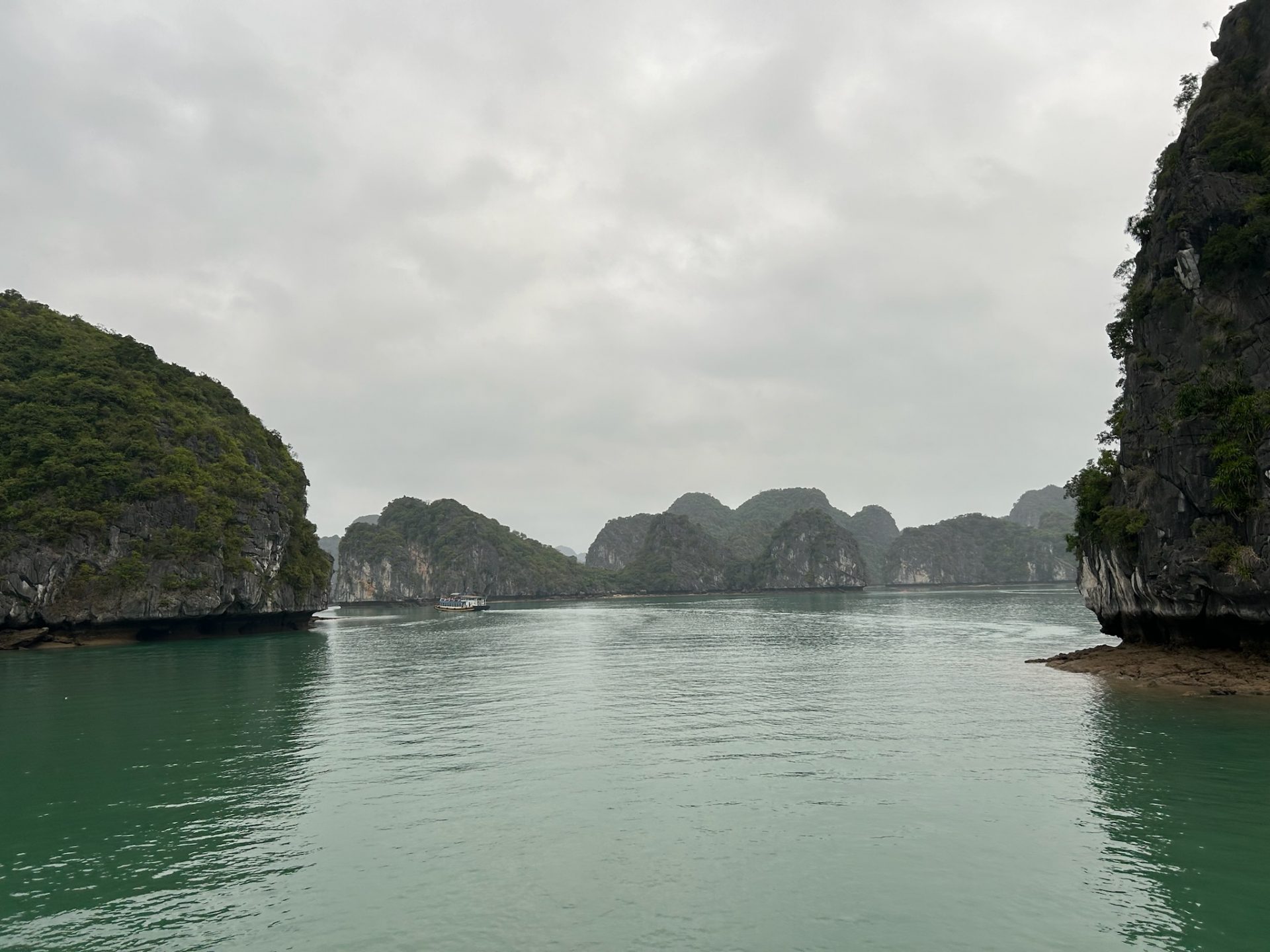 Für heute hatten wir unsere Bootstour in die Halong-Bucht gebucht. Wir mussten um 8 Uhr am Booking Office sein. Da das mit den Frühstückszeiten vom Hotel nicht hingehauen hat, holten wir uns einfach ein Banh Mi to go. Während wir warteten, kaufte ich uns hier noch zwei Bustickets nach Hanoi am nächsten Tag. Wir wurden mit anderen Teilnehmenden von einem Bus und einem Guide abgeholt, haben unterwegs noch andere Gäste eingesammelt und wurden zu dem Hafen in der Nähe gebracht. Unser Guide besorgte die Tickets und verteilte uns Bändchen. Dann ging es um 8:30 Uhr aufs Boot. Die Fahrt ging zuerst durch die Lan Ha Bay – die aber genau so aussieht wie die Halong Bay. Also eine schöne Fahrt an den vielen Felseninseln vorbei. Teilweise, weiter draußen schwamm nur ganz schön viel Müll im Wasser, was echt schade ist. Es waren nur wenige andere Boote unterwegs, also nicht so überlaufen, wie wir es uns vorgestellt hatten. Der erste Stop war ein Felsen mit einer kleinen vorgelagerten Sandbank. Wir konnten vom Boot springen und zu dem Strand schwimmen. Da heute mal wieder nicht die Sonne schien, ist nur Marco ins Wasser gesprungen, weil ich nicht den ganzen Tag in nassen Badesachen verbringen wollte.