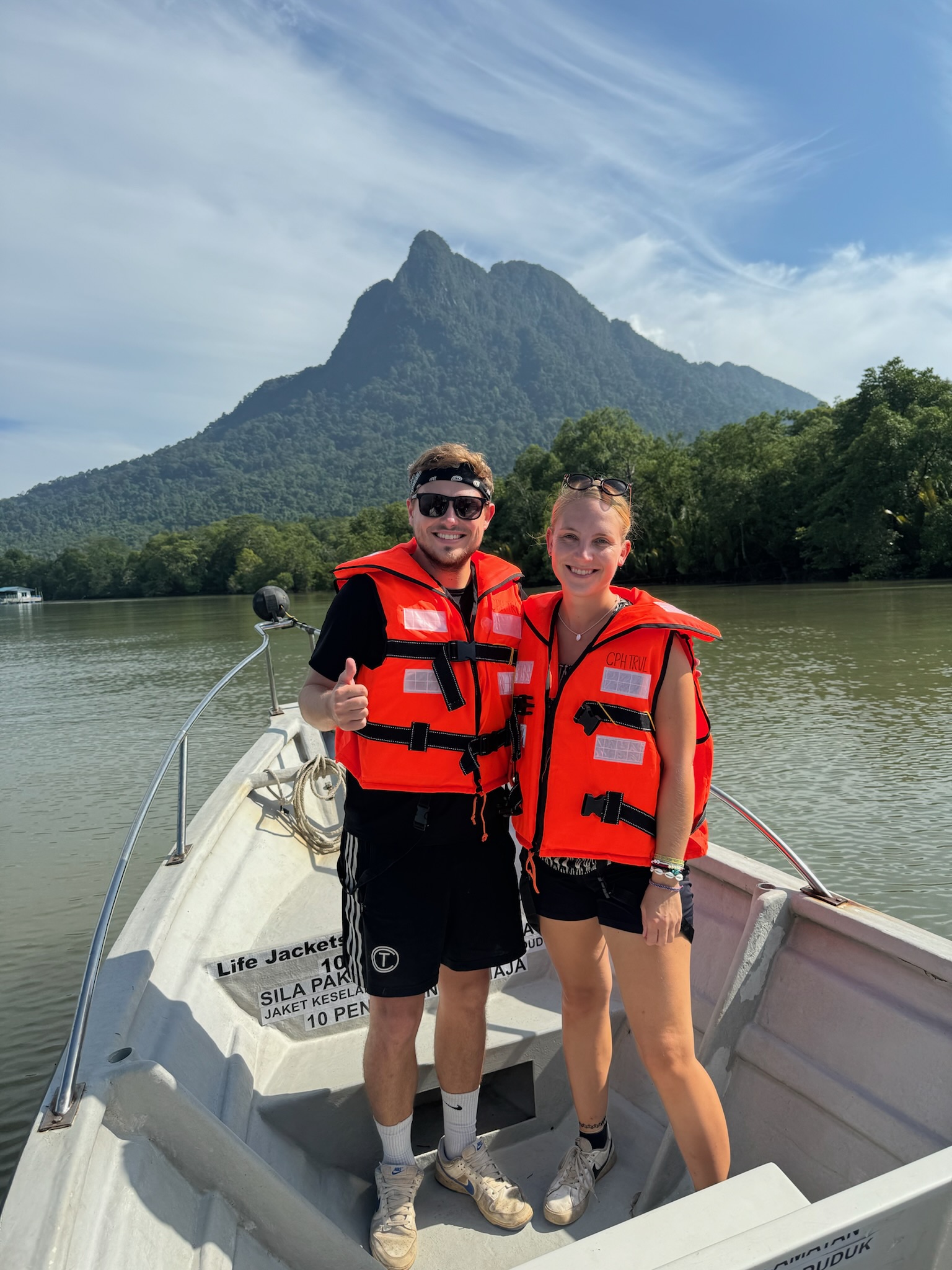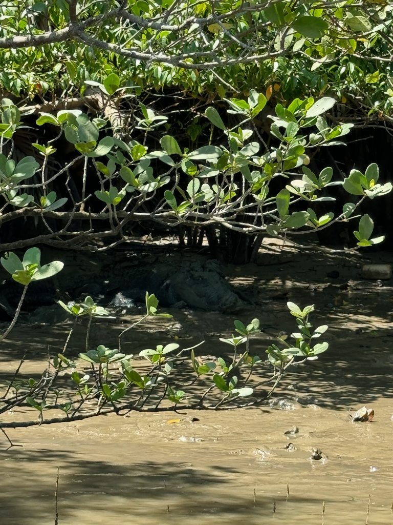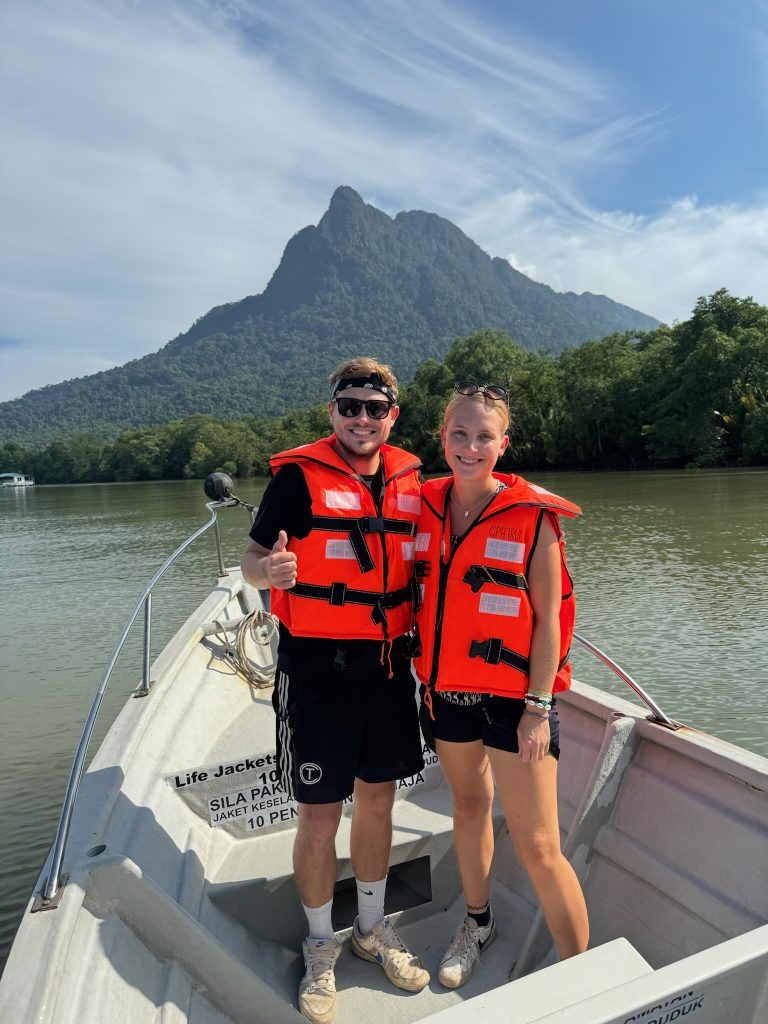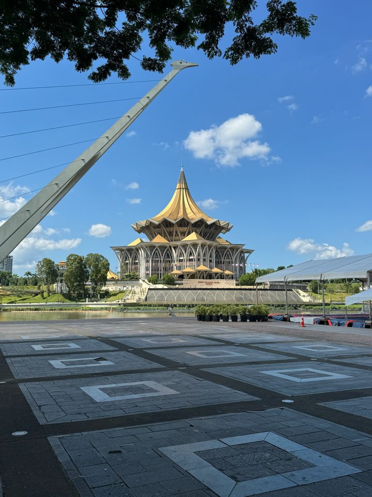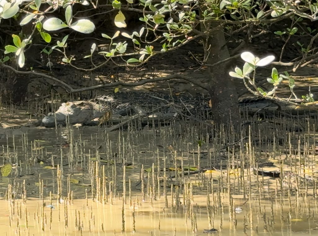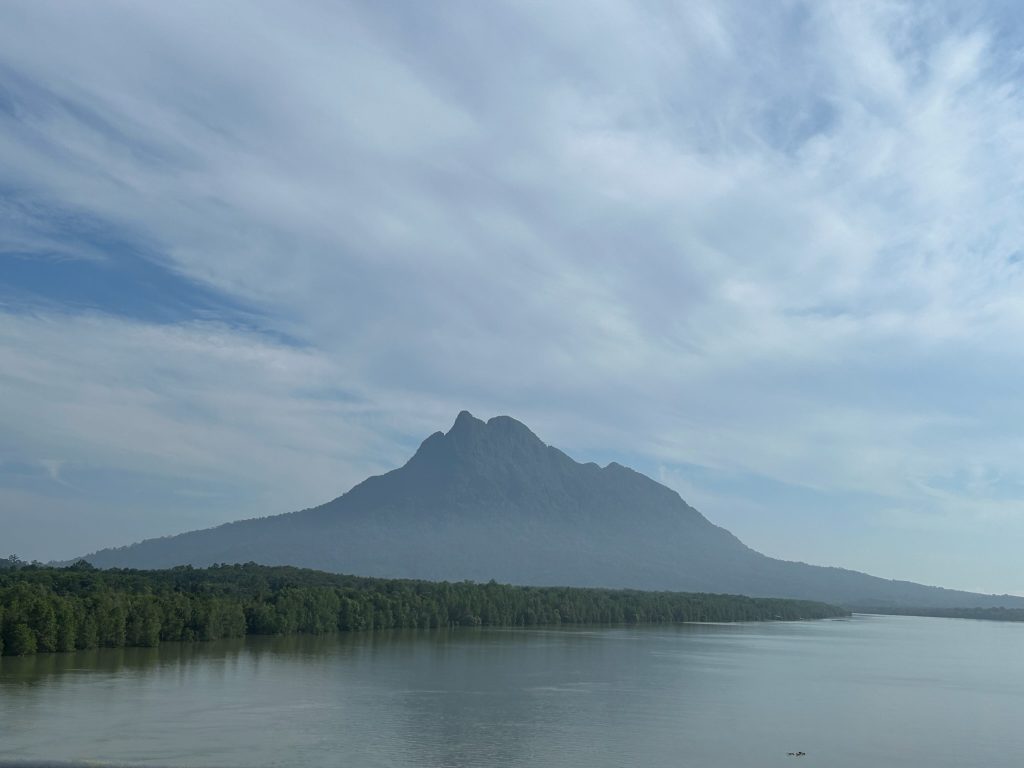 Für heute hatten wir eine Bootstour zum Wildlife Watching in den Kuching Wetlands gebucht (40€ p.P.). Um 8:45 Uhr wurden wir vorm Hotel abgeholt. Da kein anderer die Tour gebucht hatte, waren wir nur zu zweit mit unserem Guide und hatten somit eine private Tour. Wir mussten ca. 30 Minuten nach Norden fahren. Während der Fahrt erzählte uns der Guide, dass es unwahrscheinlich ist, die Nasenaffen zu sehen, da sie eher am Nachmittag rauskommen, weil es ihnen tagsüber zu heiß ist. Na toll, das sollten sie vielleicht in ihrer Tour-Beschreibung mal anpassen. Am Fluss stiegen wir in ein Boot und hatten keine großen Hoffnungen für heute. Wir fuhren auf dem Fluss entlang bis ins offene Meer und kamen dabei am Mount Santubong vorbei. Hier gibt es auch einen Nationalpark, in dem man eine Wanderung machen kann, sowie eine Bergbesteigung, aber dorthin hatten wir keinen öffentlichen Bus gefunden und wollten ersatzweise diese Tour machen. Unser Guide meinte, morgens sei die Chance Delfine zu sehen größer, aber anfangs sah es gar nicht gut aus. Wir schipperten durch die Bucht und den Fischern hinterher und später haben wir dann noch ein paar Irawadi-Delfine gesehen. Auf dem Rückweg, als wir wieder auf dem Fluss Richtung Bootsanleger waren, haben wir dann noch zwei Krokodile am schlammigen Ufer gesehen, da der Wasserstand gesunken war. Hat sich die Fahrt doch gelohnt heute – die Landschaft war dazu auch mega schön. Um kurz nach 12 Uhr wurden wir wieder am Hotel abgesetzt und ruhten uns kurz aus.