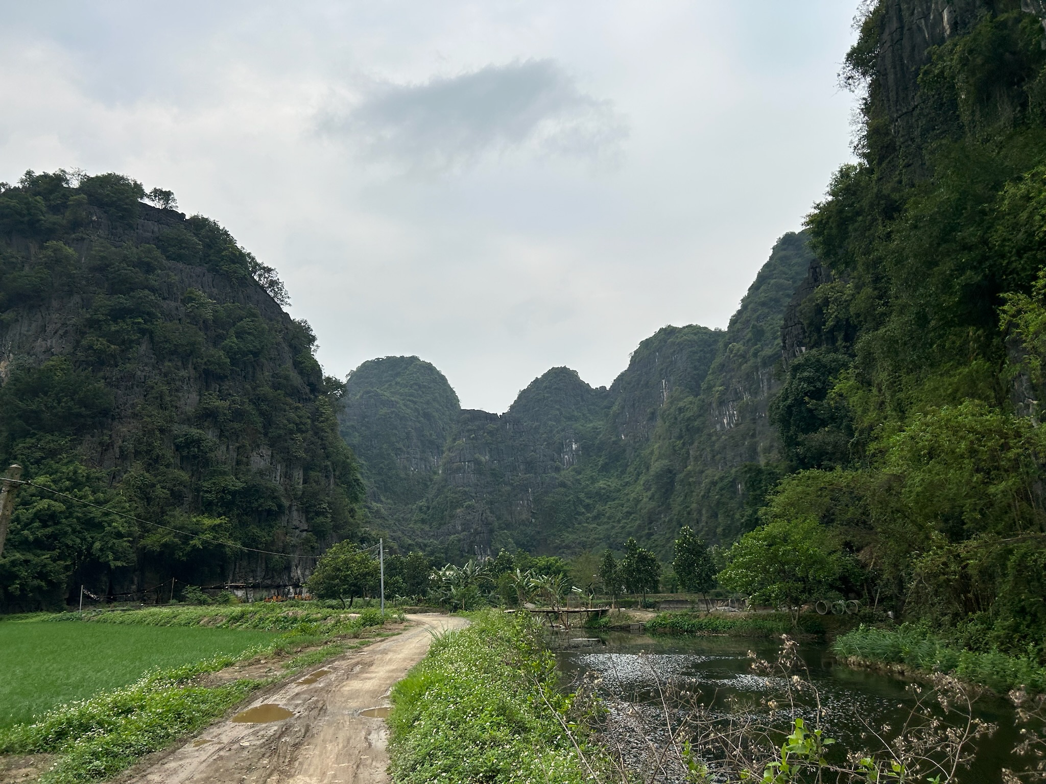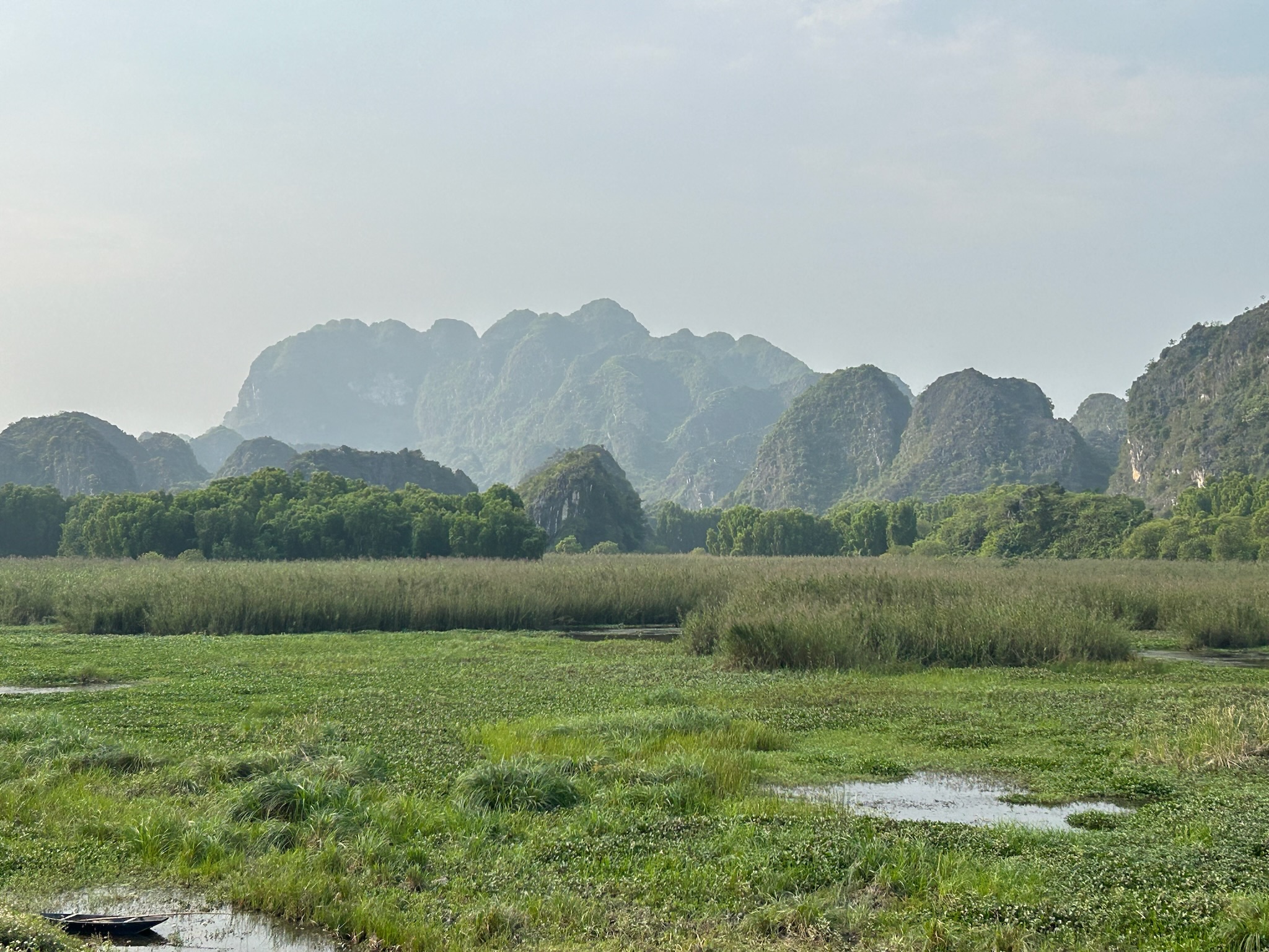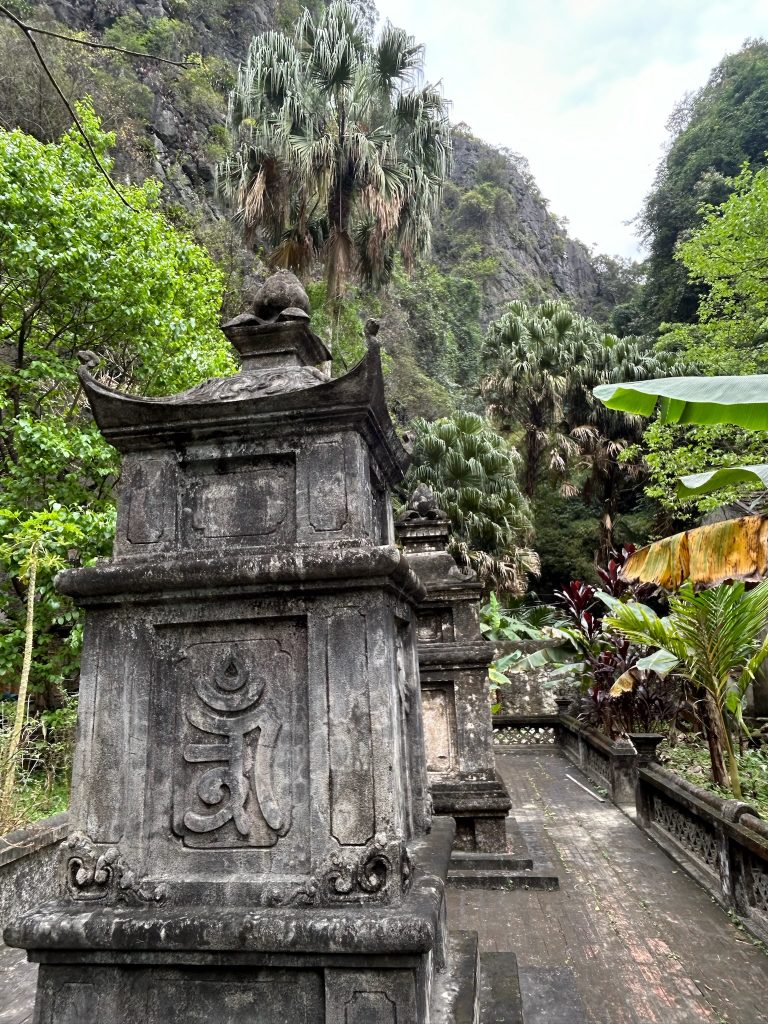 Für 9 Uhr hatten wir Frühstück bestellt, welches inklusive war und uns aufs Zimmer gebracht wurde. Es war sehr simpel mit einem Baguette, einem Omelett und einem schwarzen Kaffee. Danach fuhren wir erst mal in die Stadt zu einem Bankautomaten, Geld abheben und den Roller volltanken. Wir hielten noch an einem Brillengeschäft, wo Marco endlich eine Sonnenbrille gefunden hat. Heute wollten wir mit dem Roller einfach bisschen durch die schöne Gegend mit den Kalksteinbergen fahren, die auch als trockene Halong-Bucht bezeichnet wird. Zuerst fuhren wir ca. 15 Minuten Richtung Tam Coc im Südwesten, hier ist das Touristen-Zentrum mit vielen Restaurants und Läden. Wir fuhren am Gewässer vorbei, wo die bekannten Bootstouren starten, und die Straße weiter aus dem Ort raus durch grüne Felder bis zur Bich Dong Pagode. Hier machten wir einen kurzen Stop für die Besichtigung der Pagode an einem Felsen bis in eine Höhle hinein.