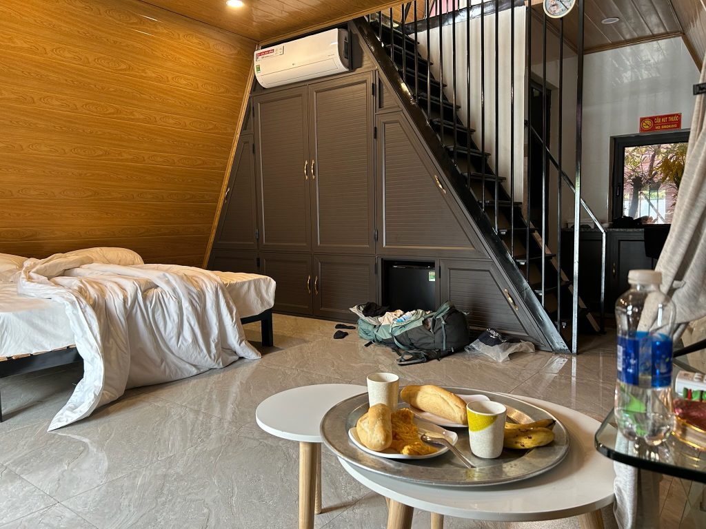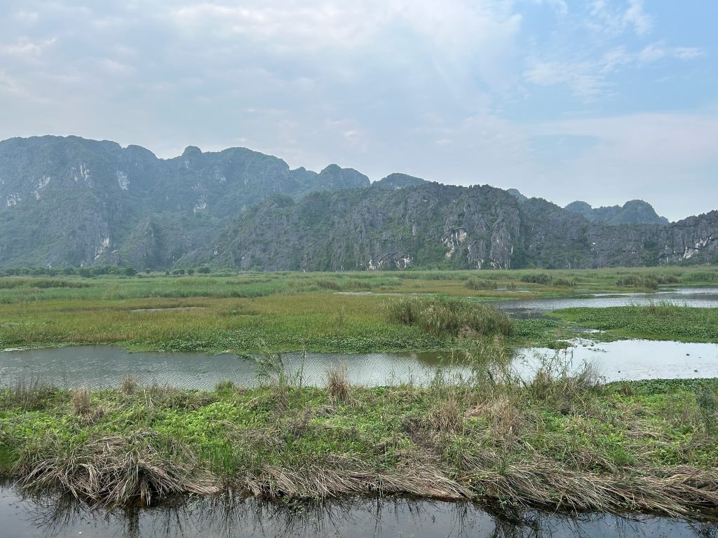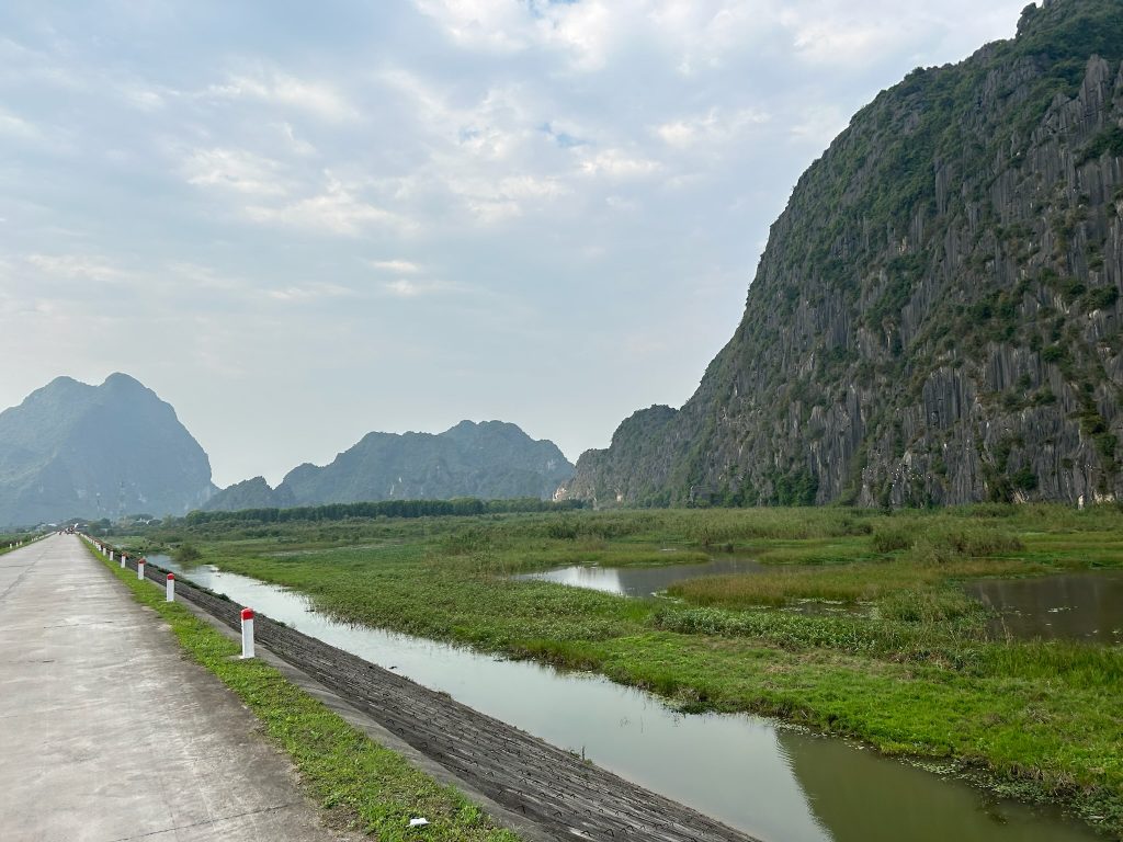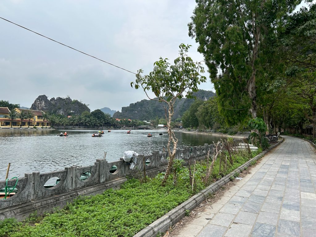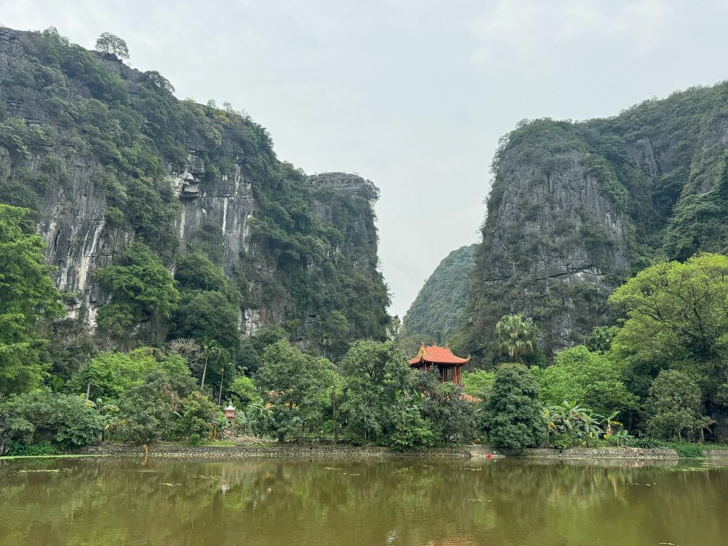 Für 9 Uhr hatten wir Frühstück bestellt, welches inklusive war und uns aufs Zimmer gebracht wurde. Es war sehr simpel mit einem Baguette, einem Omelett und einem schwarzen Kaffee. Danach fuhren wir erst mal in die Stadt zu einem Bankautomaten, Geld abheben und den Roller volltanken. Wir hielten noch an einem Brillengeschäft, wo Marco endlich eine Sonnenbrille gefunden hat. Heute wollten wir mit dem Roller einfach bisschen durch die schöne Gegend mit den Kalksteinbergen fahren, die auch als trockene Halong-Bucht bezeichnet wird. Zuerst fuhren wir ca. 15 Minuten Richtung Tam Coc im Südwesten, hier ist das Touristen-Zentrum mit vielen Restaurants und Läden. Wir fuhren am Gewässer vorbei, wo die bekannten Bootstouren starten, und die Straße weiter aus dem Ort raus durch grüne Felder bis zur Bich Dong Pagode. Hier machten wir einen kurzen Stop für die Besichtigung der Pagode an einem Felsen bis in eine Höhle hinein.