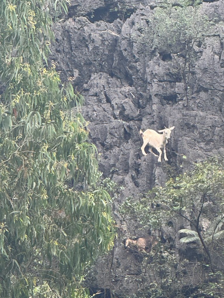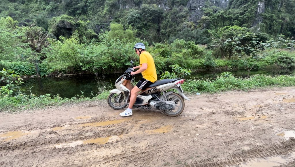 Danach fuhren wir weiter, bis wir zu einem Park kamen, wo man Eintritt zahlen musste, der uns aber nicht interessierte. Also drehten wir wieder um. Kurz vor dem Ort Tam Coc bogen wir nochmal links ab, um auf einem Weg zwischen Felsen lang zu fahren. Dabei haben wir Bergziegen gesehen, die am steilen Berghang rumliefen. Die zweite Hälfte des Weges war super schlammig, sodass ich absteigen musste. Marco hat den Roller souverän rausmanövriert – sogar ohne groß dreckig zu werden. Er wurde sogar von einem Fahrer hinter uns (ebenfalls junges, deutsches Pärchen) gelobt, dafür dass er keinen Motorradführerschein hat. In Tam Coc gönnten wir uns dann erst mal einen Mittagssnack. Unterwegs haben wir an den Straßen ein paar Mal Stände gesehen, an denen in einem Stück gebratene Ziegen auf dem Tisch standen. Nur hier in der Region haben wir auf den Speisekarten der Restaurants auch Gerichte mit Ziegenfleisch gesehen (aber nicht probiert).