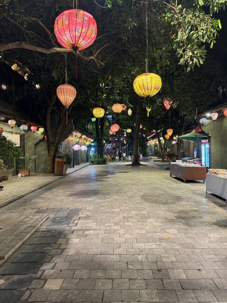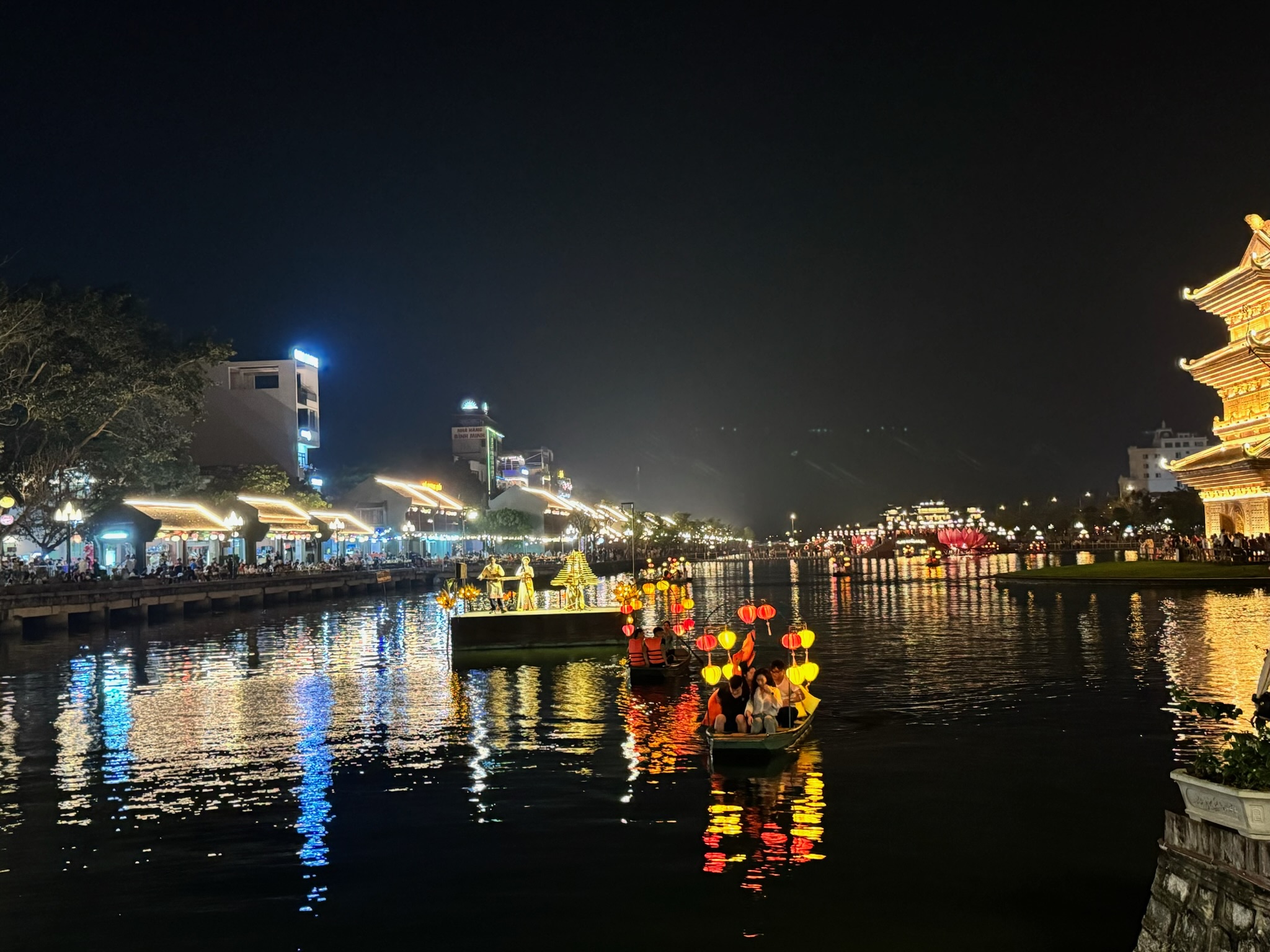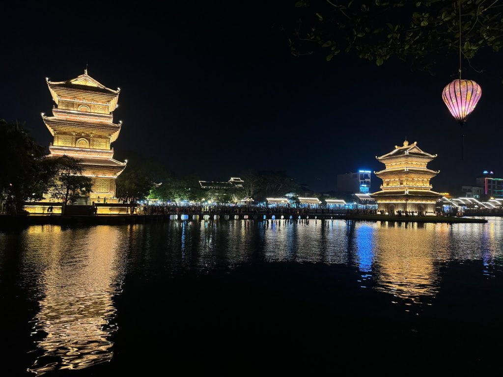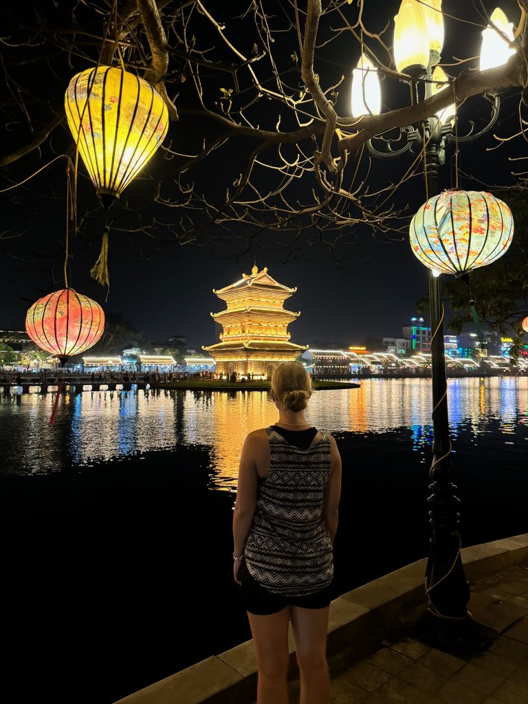 Zum Abendessen fuhren wir nochmal los, an einen See in der Stadt. Hier war zufällig ein kleines Fest mit vielen Lichtern, einem Markt, Ständen und Livemusik auf dem Wasser. Wir liefen einmal an der Promenade entlang und suchten uns ein Restaurant aus. Hier hatten wir mal wieder leckeres Fleisch – was leider auch eher seltener ist in Vietnam. Danach liefen wir noch mal über den Markt, über eine Brücke auf eine Insel bis zur Pagode und am anderen Ufer zurück. Im Zimmer buchten wir dann noch die nächste Fahrt (Bus und Fähre) und eine Unterkunft für unseren nächsten Ort auf der Insel Cat Ba.
