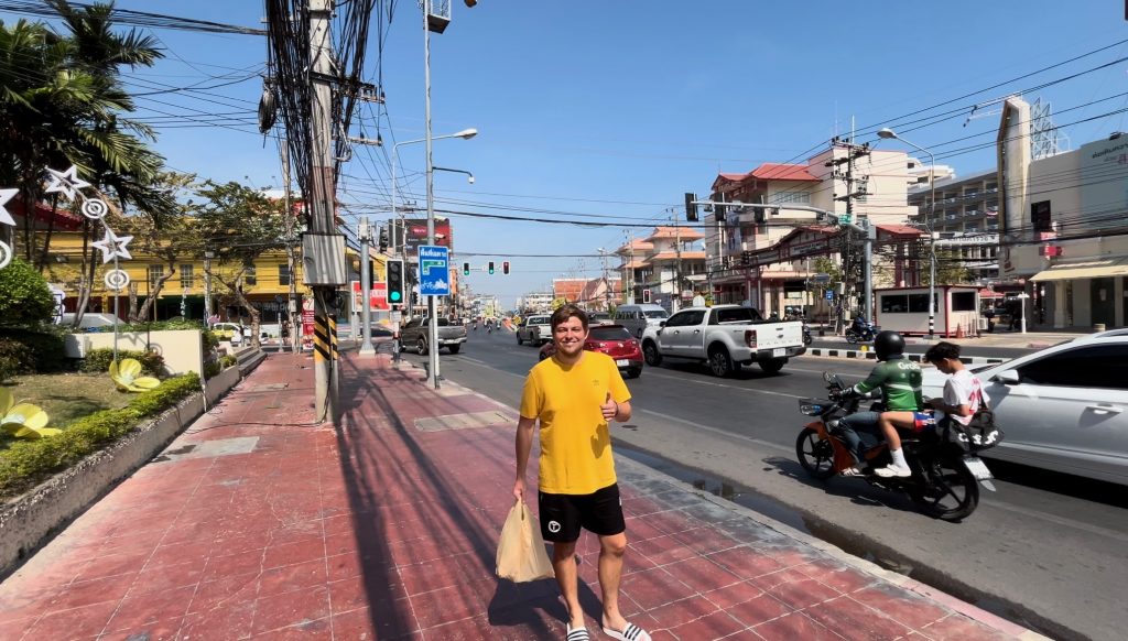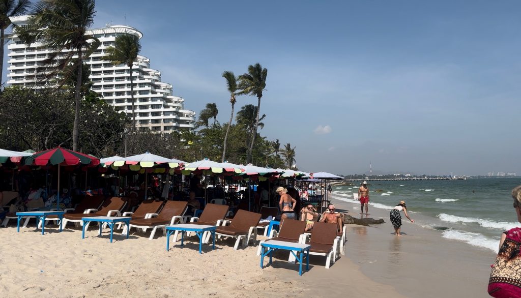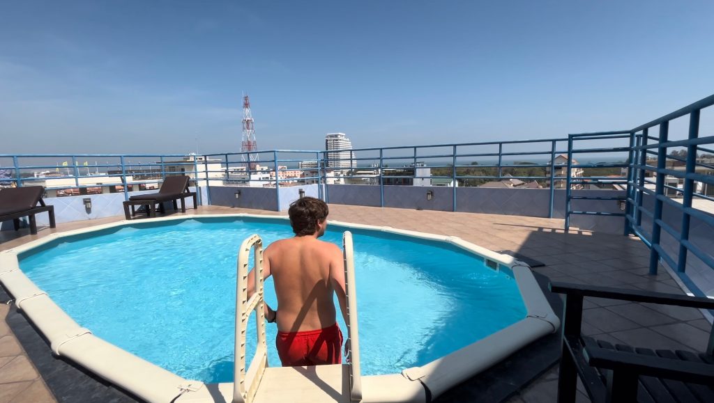 Für heute haben wir eine Elefanten-Safari im Kuri Buri Nationalpark gebucht. Wir wollten hier in Thailand gerne Elefanten sehen und haben uns für diese andere (Elefanten leben im Nationalpark komplett frei und man hat keine Garantie, sie zu sehen) und deutlich teurere Variante entschieden, da wir oft gelesen haben, man soll andere Elefanten Sanctuarys für die Touristen nicht unterstützen. Es mag ihnen dort hoffentlich besser gehen als vorher und sie können eh nicht mehr ausgewildert werden, aber müssen immer noch Sachen für die Touristen machen, die sie vielleicht nicht wollen. Da wir erst am Nachmittag abgeholt wurden, konnten wir nach der anstrengenden Reise ausschlafen. Wir suchten uns ein Lokal zum Frühstücken in der Stadt – hier kostet ein Frühstücks-Set (Toast mit Ei und Obst) nur noch die Hälfte als auf den Inseln. Von hier liefen wir kurz zum Strand runter für einen kurzen Blick nochmal aufs Meer. Danach kauften wir uns im Supermarkt noch Proviant für den Ausflug, weil wir nicht wussten, wann wir das inklusive Essen bekommen würden. Wir gingen zurück ins Hotel und Marco testete noch den Rooftop-Pool. Danach setzten wir uns noch ein Stündchen in die Hotel-Lobby (in unserem Zimmer war das WLAN leider zu schlecht…), um einen Bus und eine Unterkunft in Bangkok ab dem nächsten Tag zu buchen.
