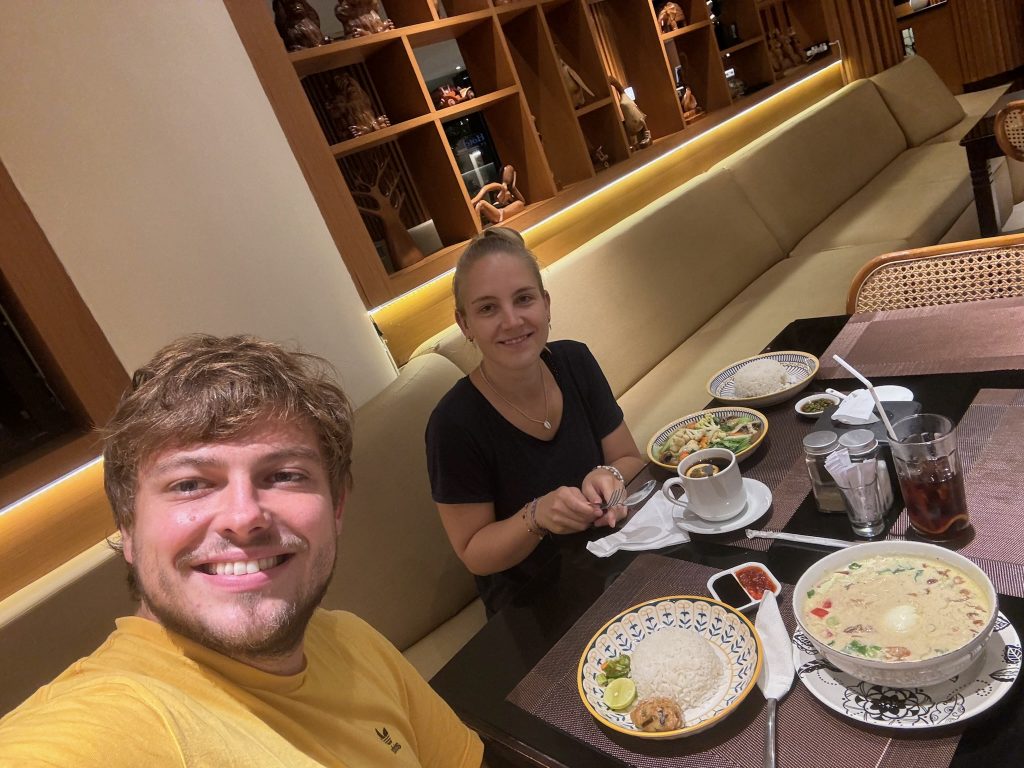 Am nächsten Tag stellten wir uns einen Wecker zum Frühstück, welches wir inklusive hatten. Danach legten wir uns nochmal hin, es war auch leider recht laut im Hotel in der Nacht. Heute wollte ich mich nochmal ausruhen. Abends aßen wir im hoteleigenen Restaurant, für Marco gab’s direkt das erste einheimische Gericht. Danach setzten wir uns mit unserem Getränk noch kurz in den Außenbereich des Hotels zum Akklimatisieren 😀