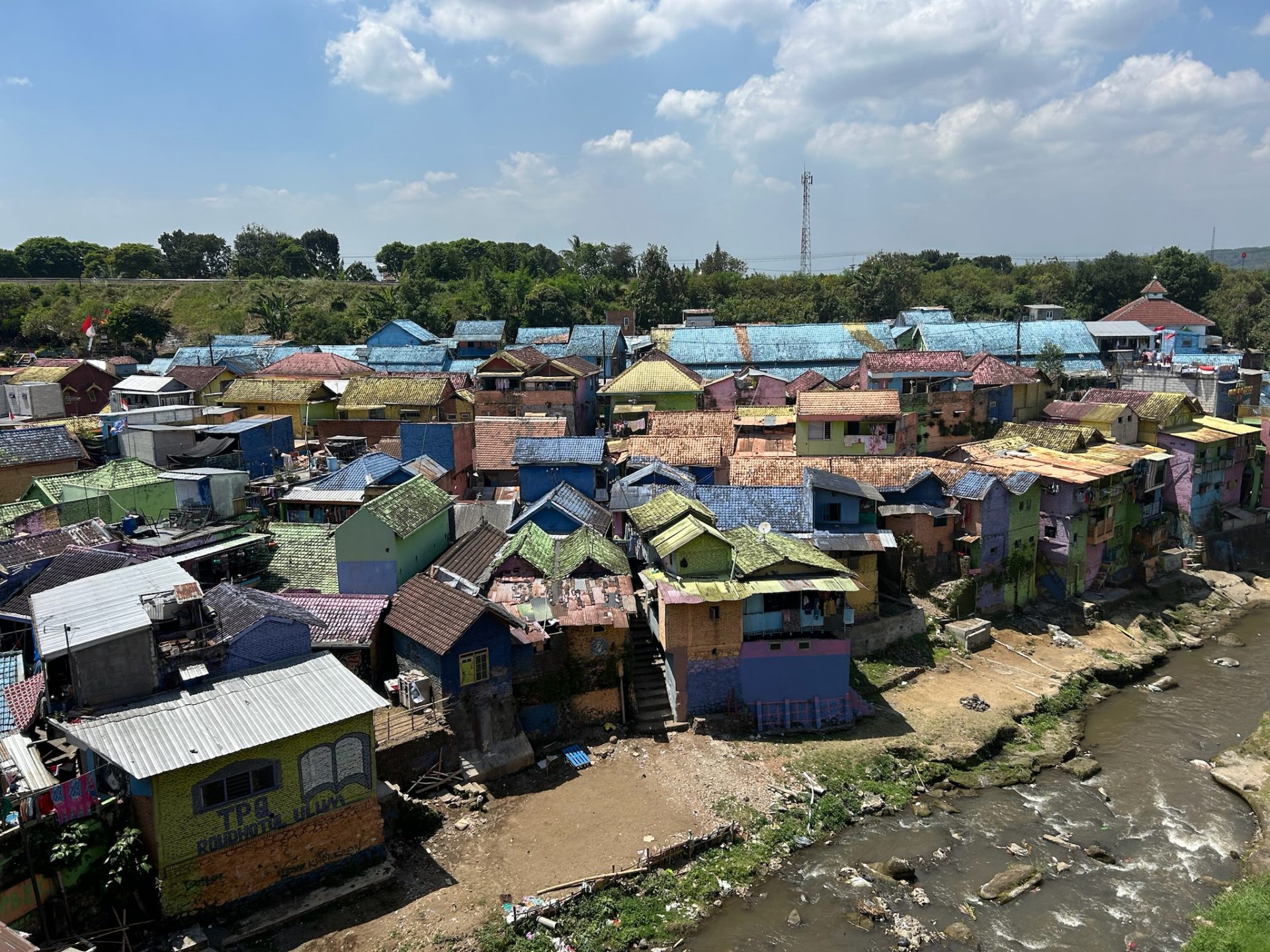 Danach gingen wir ein paar Minuten weiter zur bunten Stadt „Kampung Warna Warni Jodipan“, die an den Hängen eines Flusses liegt. Wir zahlten 60 Cent Eintritt und liefen die engen Gassen und Treppen durch den Stadtteil, bis wir zu einer Fußgängerbrücke kamen. Auf der anderen Seite des Flusses konnten wir wieder zurück zur Hauptstraße laufen.