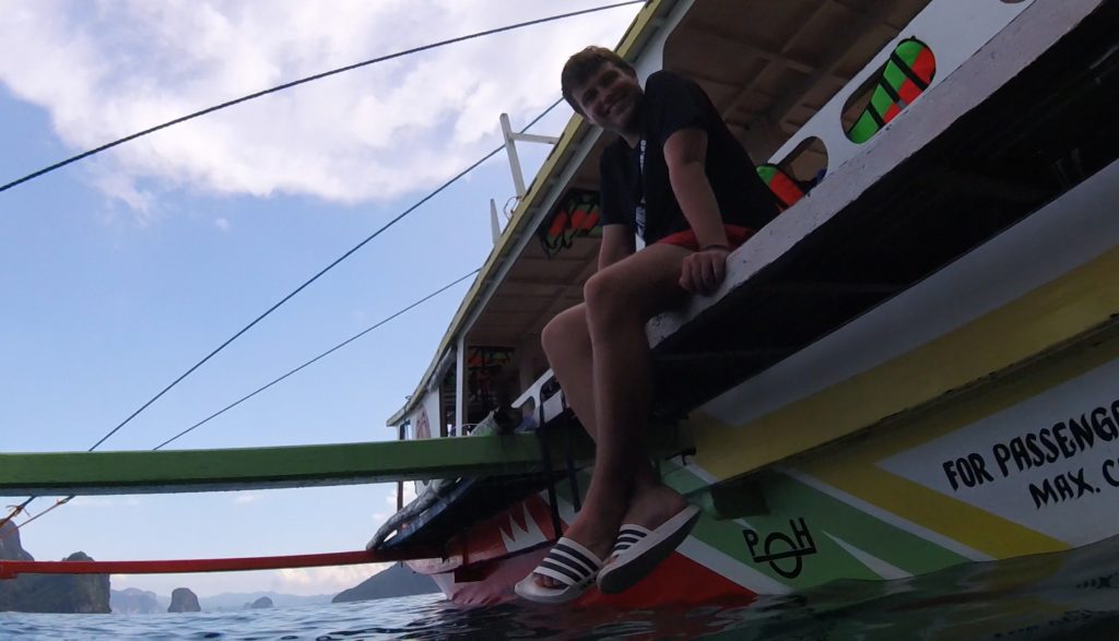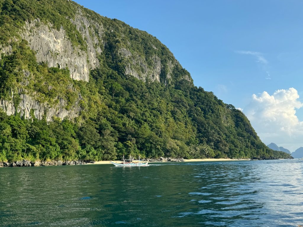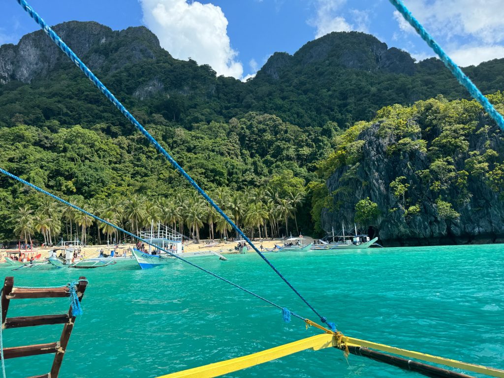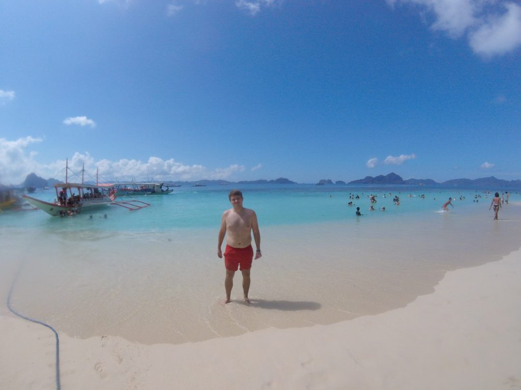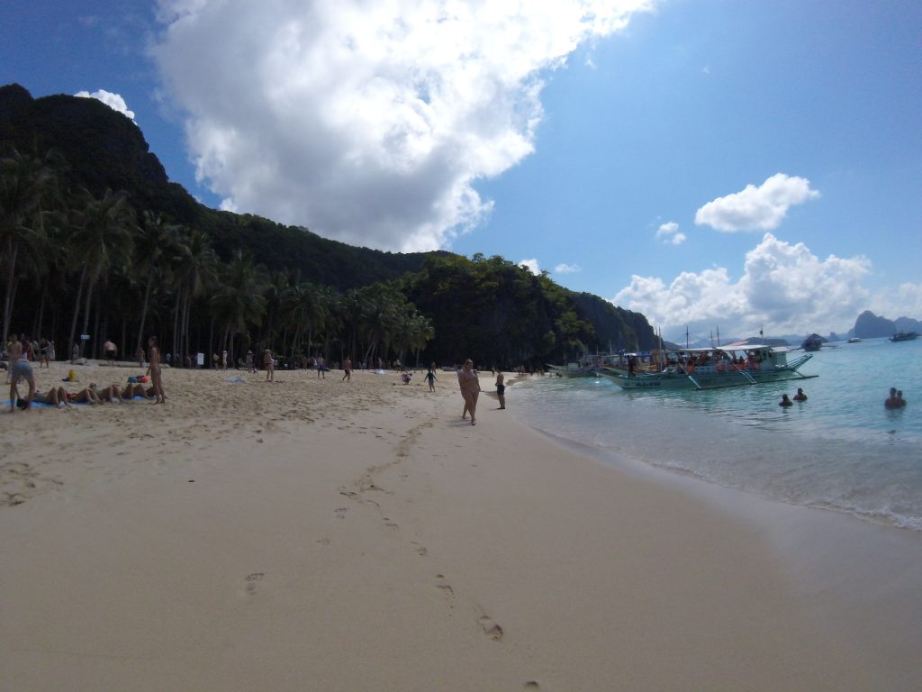 Für heute hatten wir die Bootstour A (19€ p.P.) gebucht. Auf 7:30 Uhr hatten wir Frühstück im Hotel bestellt und es gab Omlette mit Toast und Pancakes. Um 8:30 Uhr wurden wir, zusammen mit einem anderen Pärchen mit einem Tricicle (Bezeichnung hier für Tuk Tuk) abgeholt und in die Stadt gebracht. Der Fahrer war auch unser Tourguide und führte uns zu einem Büro, wo wir ein Boot zugewiesen bekamen, und anschließend zu deren Büro am Strand. Dort mussten wir noch bis 9:30 Uhr warten, bis es endlich auf‘s Boot ging. Währenddessen wurden wir alle zwei Minuten von Verkäufern angesprochen, die am Strand voller Touristen entlangliefen. Gegen 10 Uhr fuhren wir dann endlich los. Der erste Stopp war der Seven Commando Beach, ein traumhafter Strand mit Palmen und türkiesem Wasser – aber auch voller Leute.