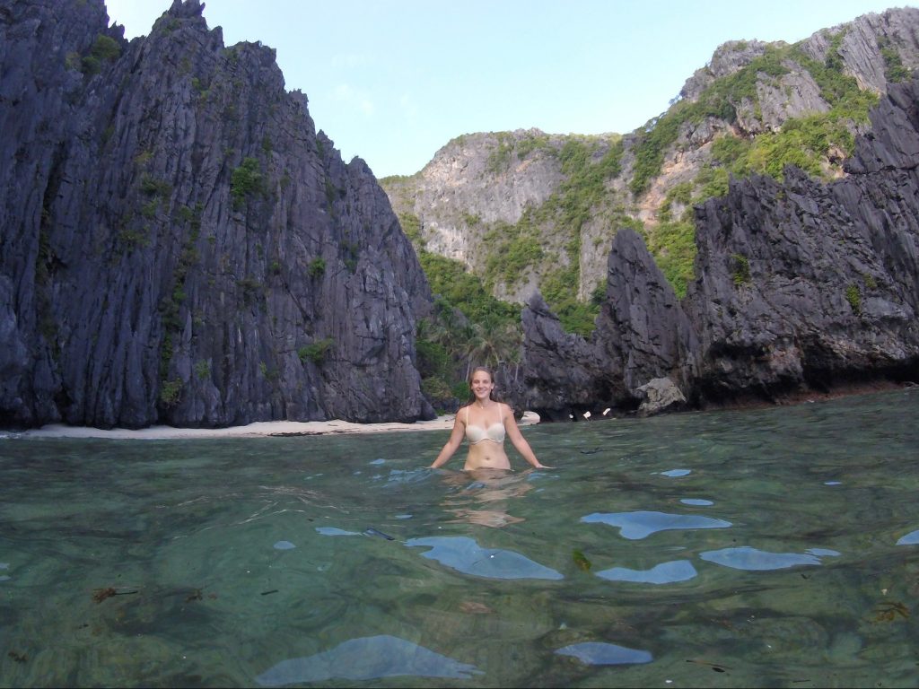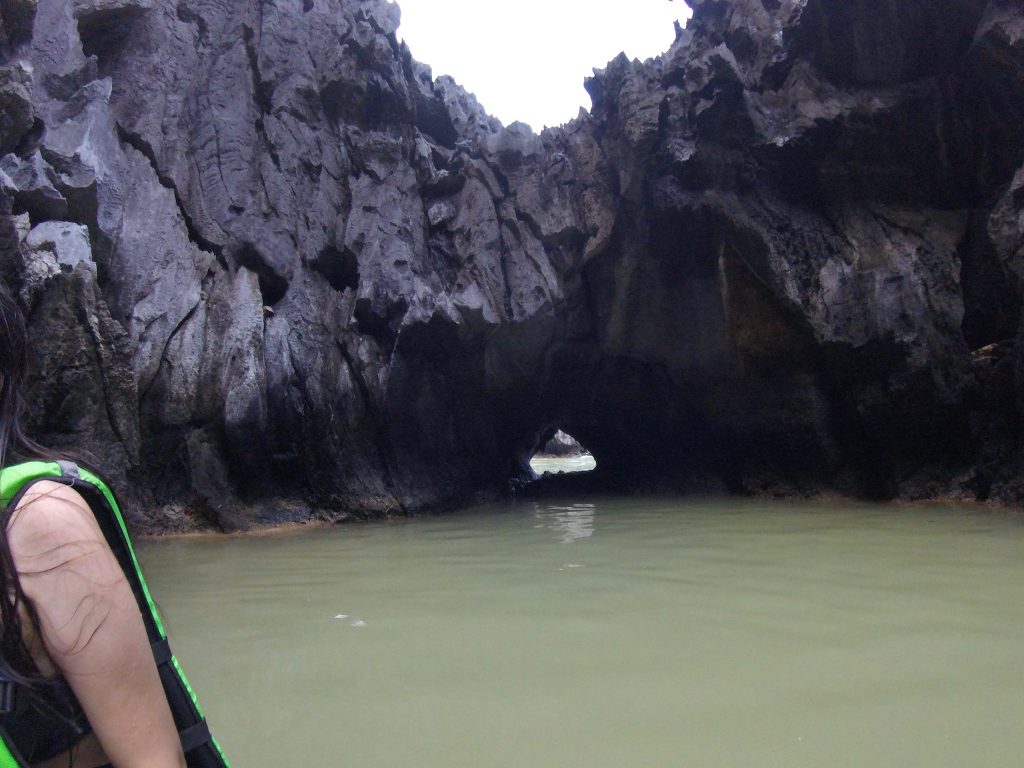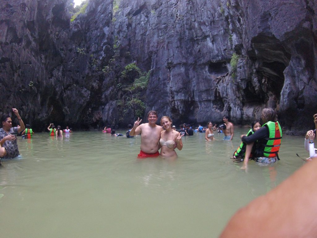 Der letzte Stopp war die Secret Lagoon. Wir mussten hin schwimmen und den Rest bei recht starken Wellen über die Steine bis zur Felswand laufen, was mit unseren Latschen nicht ganz so einfach war. Man musste durch ein Loch in der Felswand klettern und kam in eine kleine Lagune, mit hüfthohem Wasser, von hohen Felswänden umschlossen.