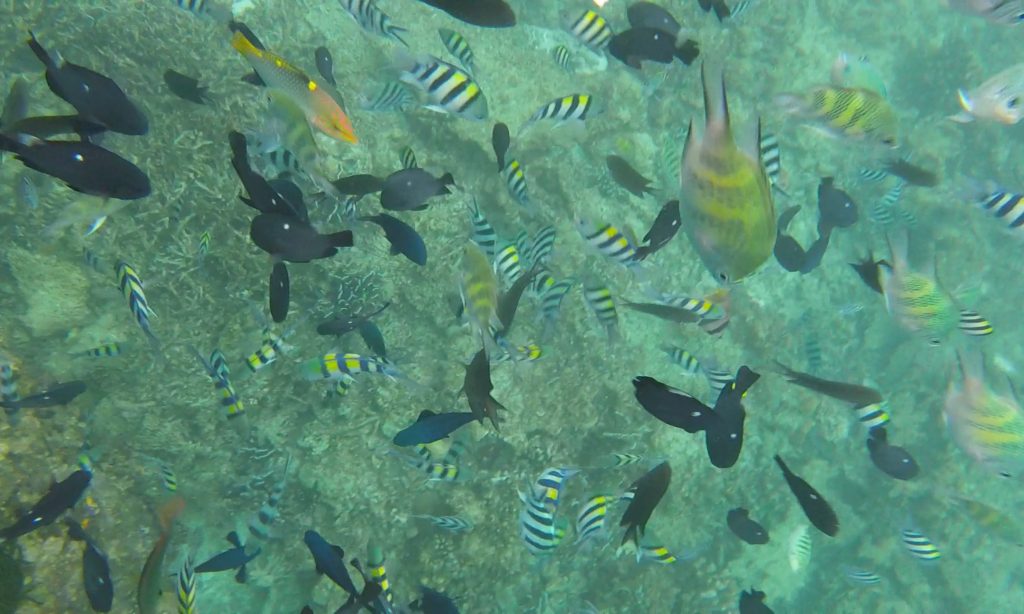 Als wir los wollten, fing es kurz an zu regnen. Wir fuhren nicht weit, nur um die Ecke zu einem Schnorchel-Spot.