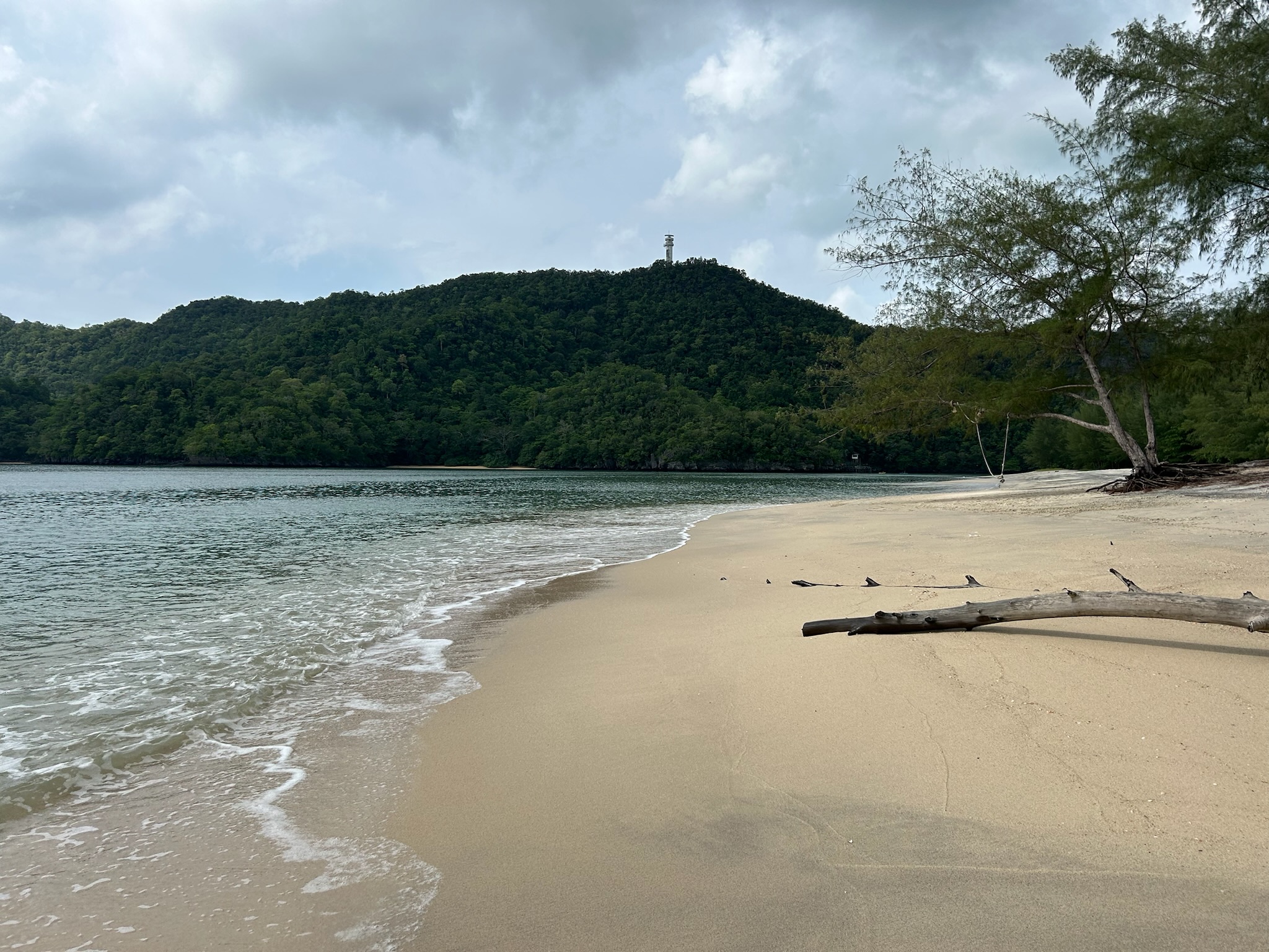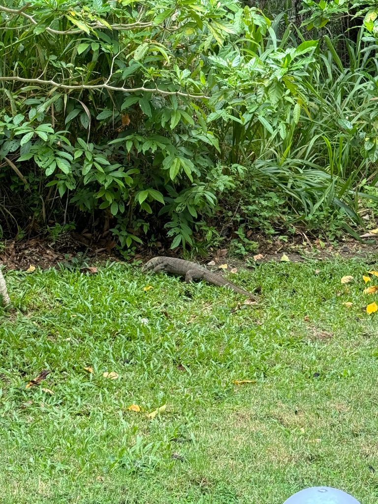Nach einer kurzen Pause ging es weiter, wir mussten ein Stück den Berg entlang zurück zur Hauptstraße fahren und dort nochmal tanken. Es ging weiter an der Nordküste entlang nach Osten mit einem Stop am Strand. Unser Ziel war ein Café an dem nördlichsten Strand. Was wir bei GoogleMaps nicht gesehen hatten war, dass das Café auf dem Grundstück eines Resorts liegt. Wir wurden als Besucher rein gelassen, parkten und gingen zu dem Café. Dabei sahen wir am Straßenrand jeweils auf dem Hin- und dem Rückweg einen Varan. Wir setzten uns in das Café am Strand mit Blick in die Bucht aber da die Auswahl nicht so groß war wie im Internet, gab’s ein kleines Sandwich.