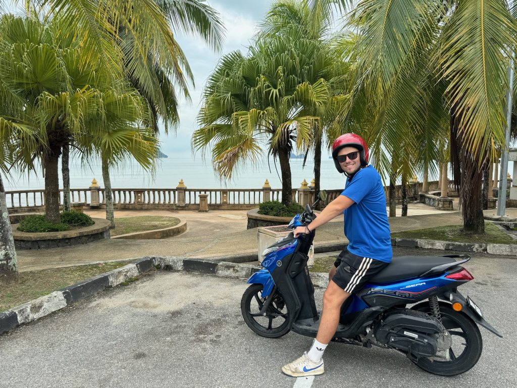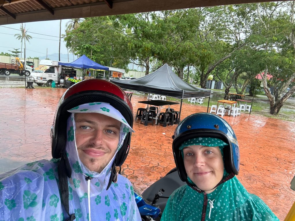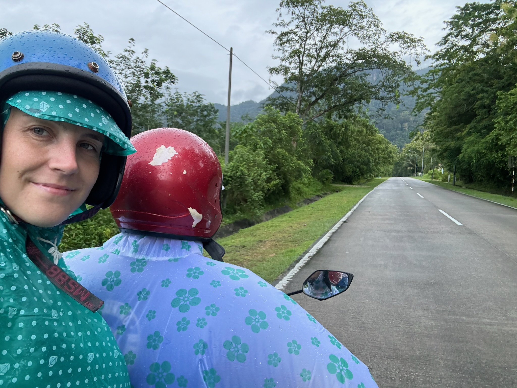 Beim Frühstück heute haben wir mal eine andere Affenart gesehen, vermutlich Brillenlanguren. Heute wollten wir es wagen und endlich mal einen Roller leihen, um die Insel zu erkunden. Nach dem Frühstück packten wir unsere Regencapes ein und liehen uns einen Roller (7€) bei dem einheimischen Restaurant an unserer Ecke, dessen Besitzer uns jeden Morgen nett grüßte und zum Frühstück einlud. Um 10 Uhr fuhren wir los, aber mussten natürlich erst wieder tanken. Als wir wieder unterwegs waren und gerade um den Flughafen herum fuhren, fing es heftig an zu regnen. Wir hielten an, zogen unsere Ponchos an und stellten uns unter einen Baum. Aber da dieser ziemlich durchlässig war, entschieden wir, weiter zu fahren. Aber der Regen war zu heftig, dass man kaum gucken konnte, also hielten wir bei der nächsten Gelegenheit unter einem Dach auf einem Platz. Hier saß eine Familie zum Essen und wir kamen mit einem Australier ins Gespräch, der ebenfalls mit seinem Roller wartete. So ein Regen muss man auch mal erlebt haben…