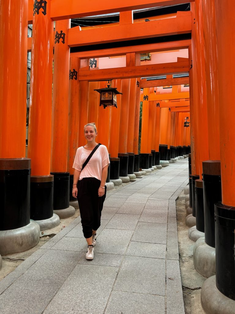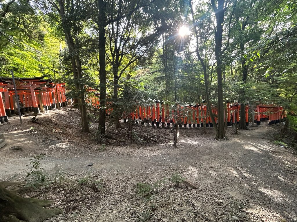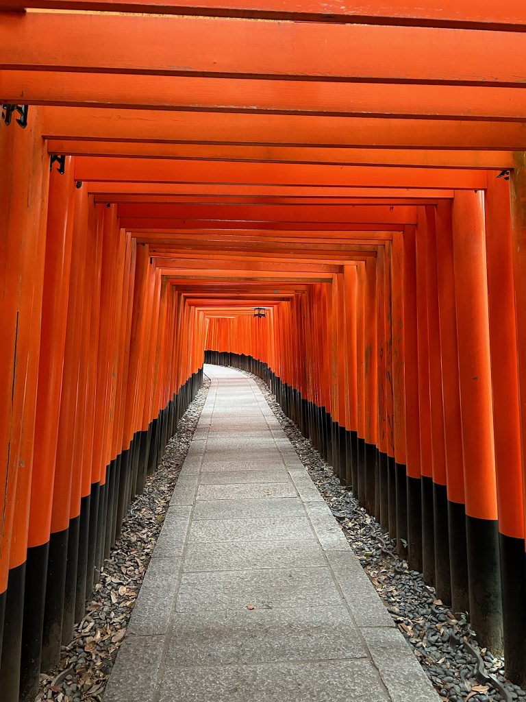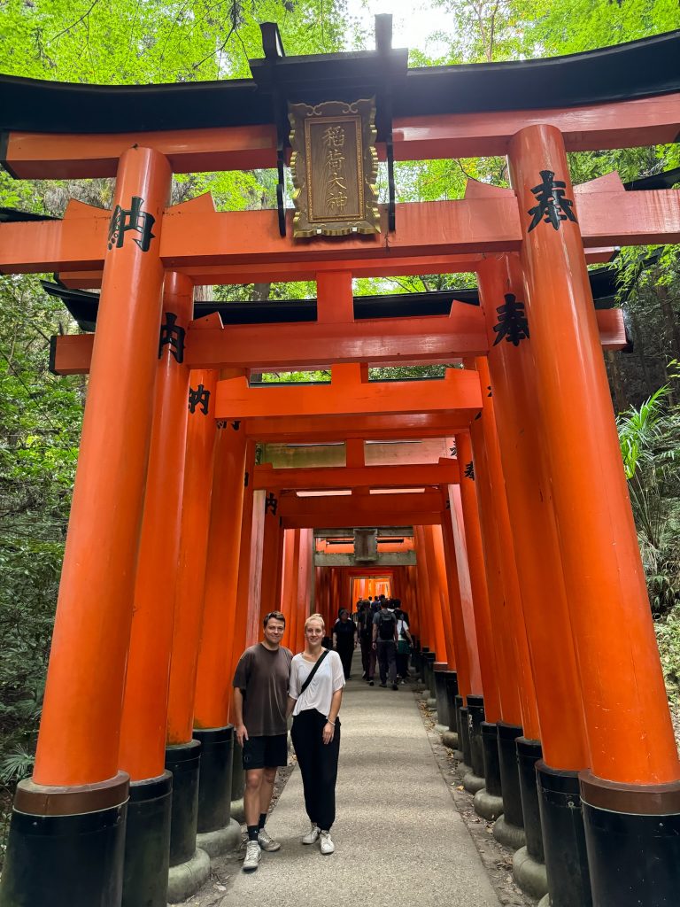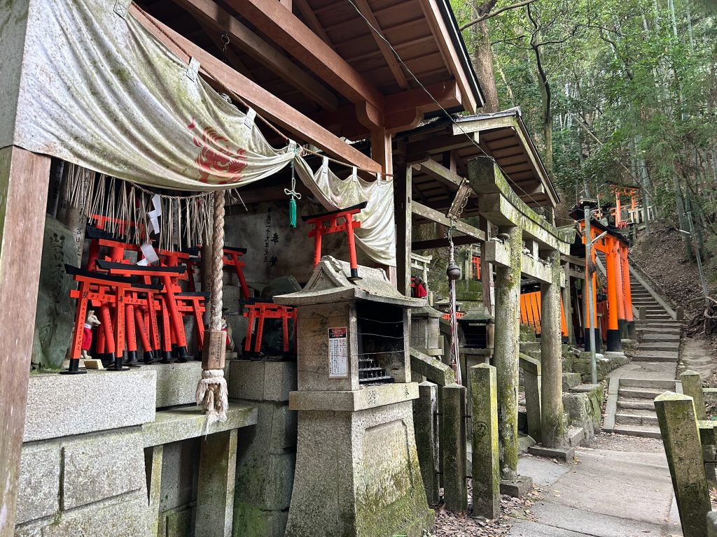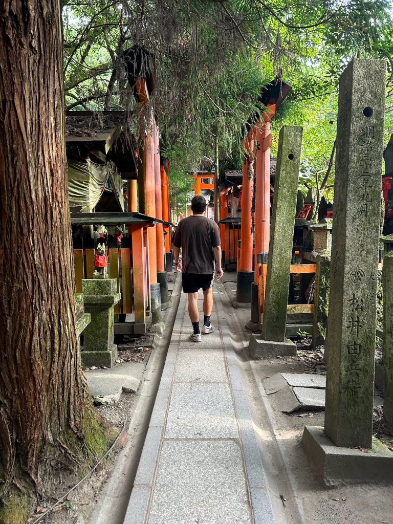 Heute wollten wir nochmal früher bei dem Fushimi-Inari Schrein mit den roten Torii sein und liefen um kurz nach 7 Uhr los. Für die Strecke brauchten wir zu Fuß 30 Minuten und unterwegs gab’s für jeden Rest Toast und eine Banane zum Frühstück. Heute war es irgendwie schwül und da wir uns beeilt hatten, kamen wir etwas durchgeschwitzt an. Aber es hat sich gelohnt, denn es waren vergleichsweise nur wenige Menschen schon hier. Wir liefen durch einige Gänge aus großen und kleinen Torii, die mal weiter und mal enger auseinander standen, durch den Wald den Berg hoch und kamen dabei an einigen Gebetsstätten mit Altaren und Opfergaben vorbei. Auf der Rückseite des Berges führte der Weg wieder runter zum Haupttempel.