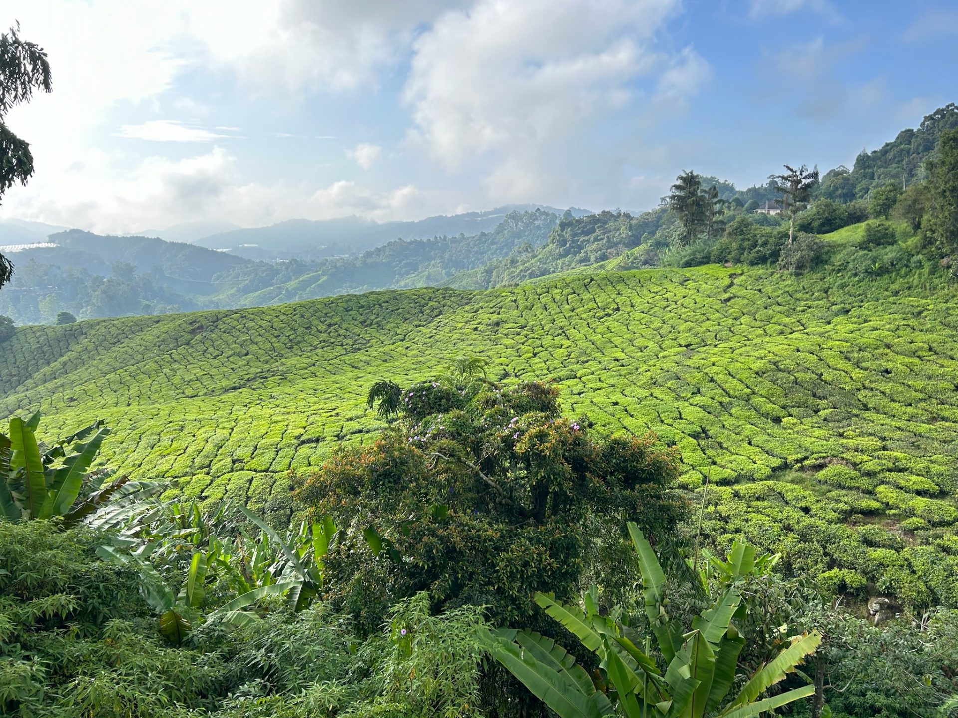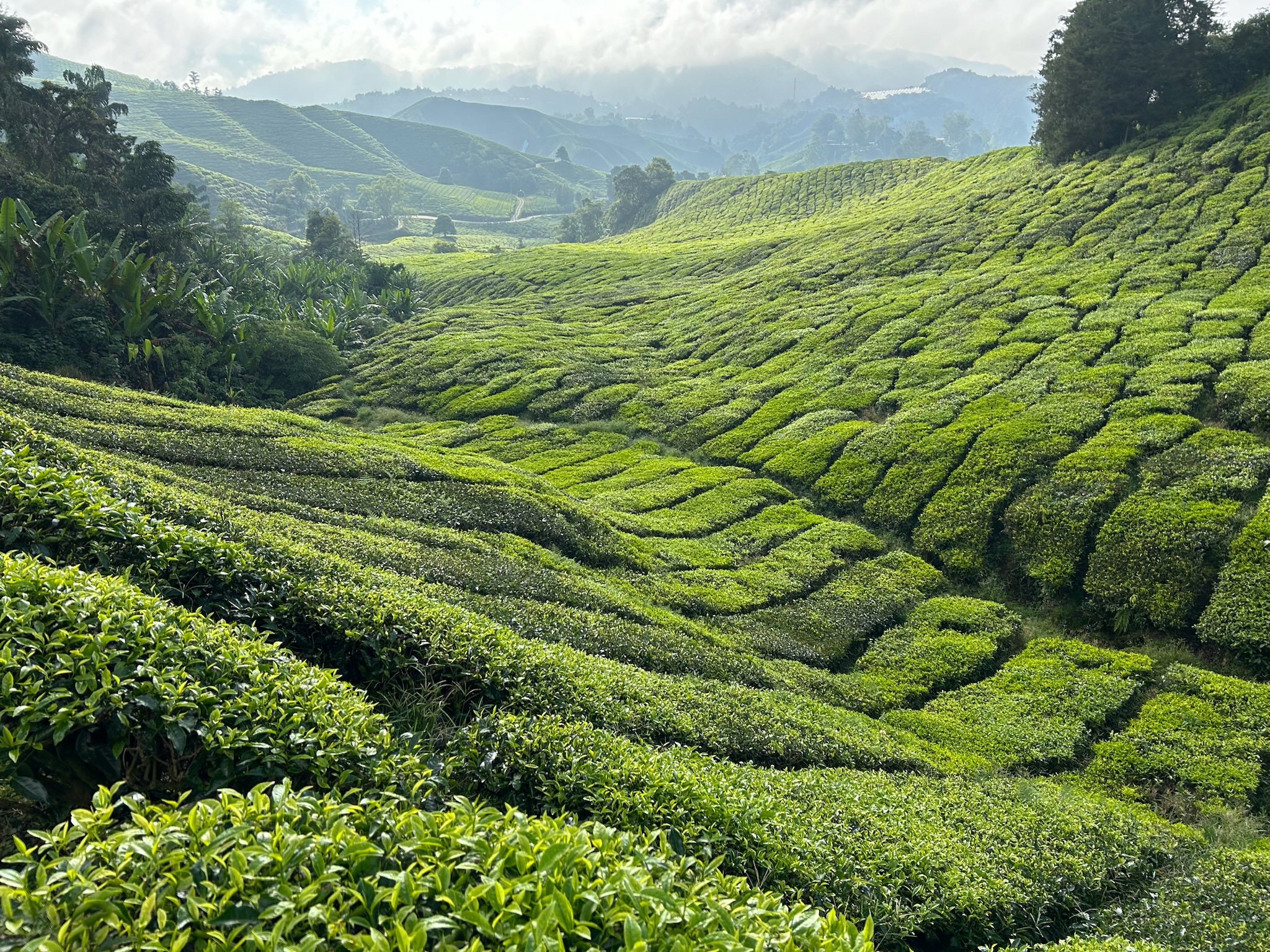 Marco fühlte sich heute morgen leider nicht fit genug, um die Tour mitzumachen, also fuhr ich alleine. Um 8 Uhr wurde ich mit einem älteren französischen Pärchen vor unserem Hostel mit einem Jeep abgeholt. Wir fuhren noch bei zwei weiteren Unterkünften vorbei, um den Rest der kleinen Gruppe einzusammeln. Dann ging es los den Berg hoch, durch den Ort Brinchang und an vielen Gewächshäusern, Farmen und Märkten vorbei. Der erste Spot war an einer Teeplantage mit dem Blick ins grüne Tal und auf die umliegenden Berge. Dort erklärte uns unser Guide ein paar Fakten über den Teeanbau, die Sorten in den Cameron Highlands, die Ernte usw. Danach ging es zur nahegelegenen BOH-Tee-Fabrik mit angrenzendem Café. Dort kam ich mit zwei deutschen Backpacker-Jungs ins Gespräch. In der Fabrik konnten wir kostenlos einen kleinen Rundgang machen und uns die einzelnen Schritte der Verarbeitung ansehen, mit den Maschinen, die schon seit 1935 genutzt werden (wenn ich es mir richtig gemerkt habe).