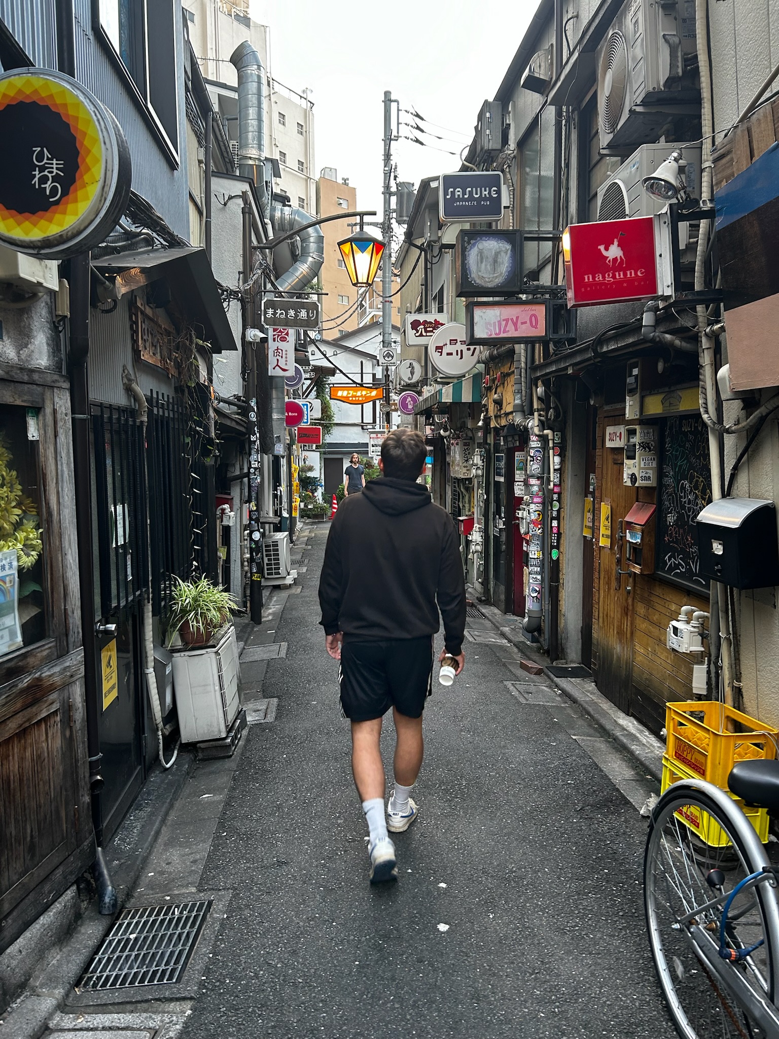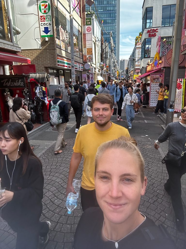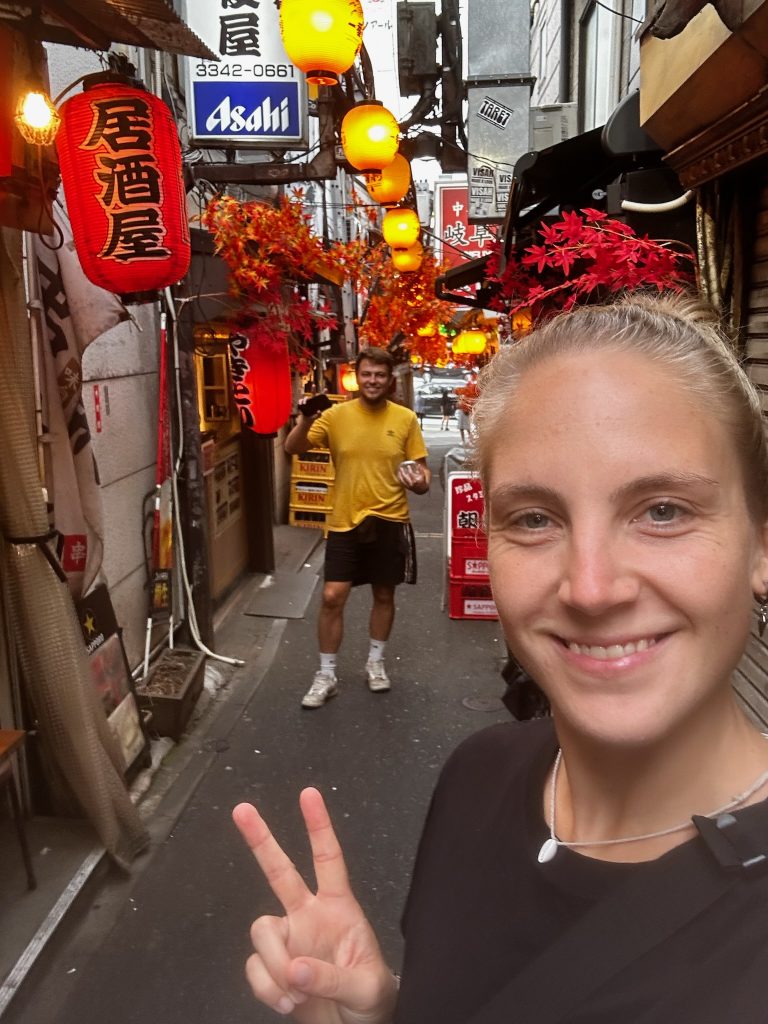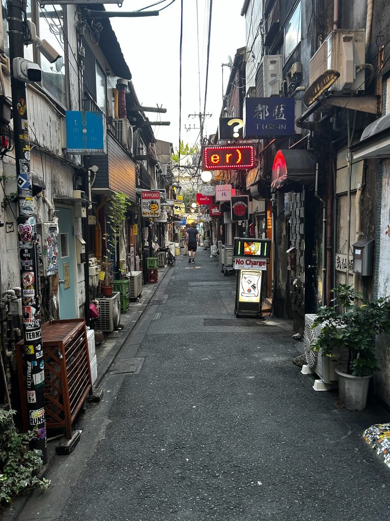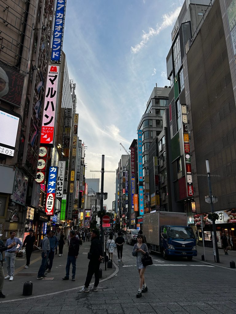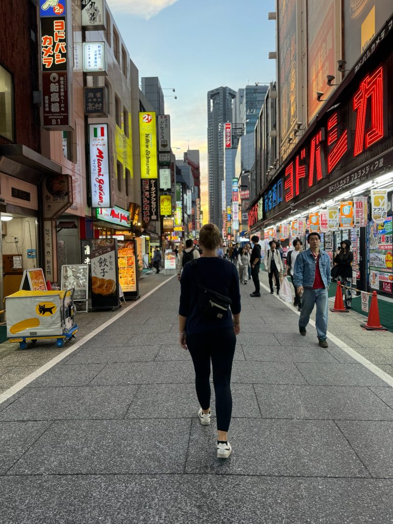 Im Shinjuku-Viertel sind zwei Bereiche mit sehr engen Gassen aus kleinen Häusern mit kleinen Kneipen und Lokalen, in die geschätzt maximal 5-7 Leute reinpassen. Es gibt Shopping-Straßen mit bunten Leuchtreklamen und ein Rotlicht-Viertel. Hier gab‘s auch viele Wechselstuben, wo wir unsere restlichen Yuan umtauschten.