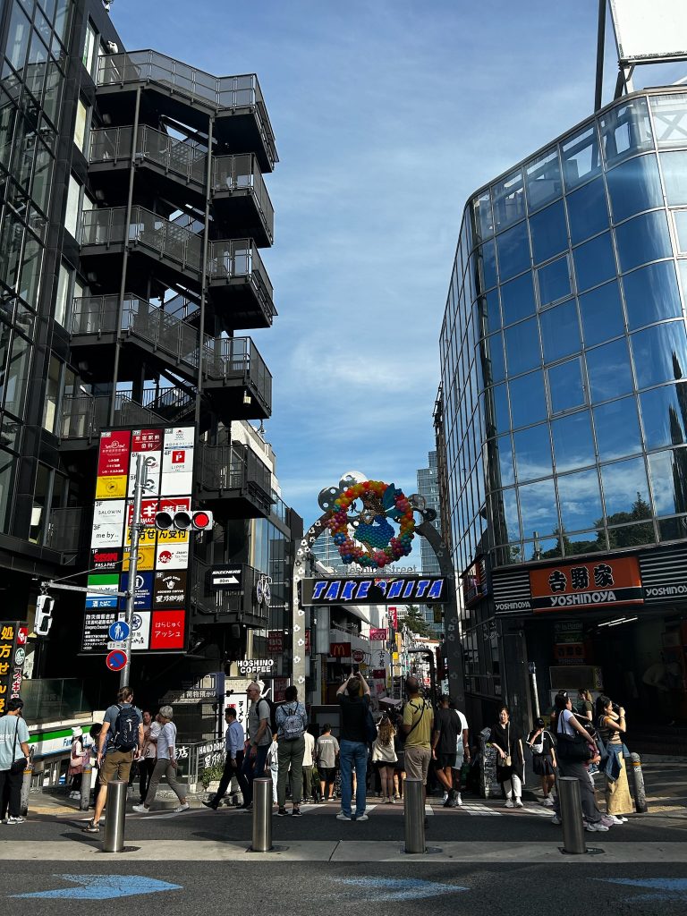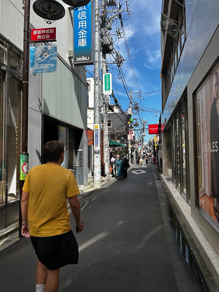 Wir liefen 20 Minuten zu einem Café, aber sie boten kein Frühstück mehr an. Also stiegen wir dort in die Metro, fuhren ins Harajuku-Viertel und liefen ein paar Minuten zum rausgesuchten Café. Vor der Tür war schon wieder eine Schlange, aber wir beschlossen, uns diesmal anzustellen. Wir mussten zwar nur kurz warten aber die Bedienung hat lange gedauert. Gut gesättigt, machten wir uns auf den Weg und bummelten durch das hippe „Jugend-Viertel“ mit vielen Klamotten-Läden. Über eine Shopping-Straße mit Souvenirläden und Essensständen ging es raus aus dem Viertel.