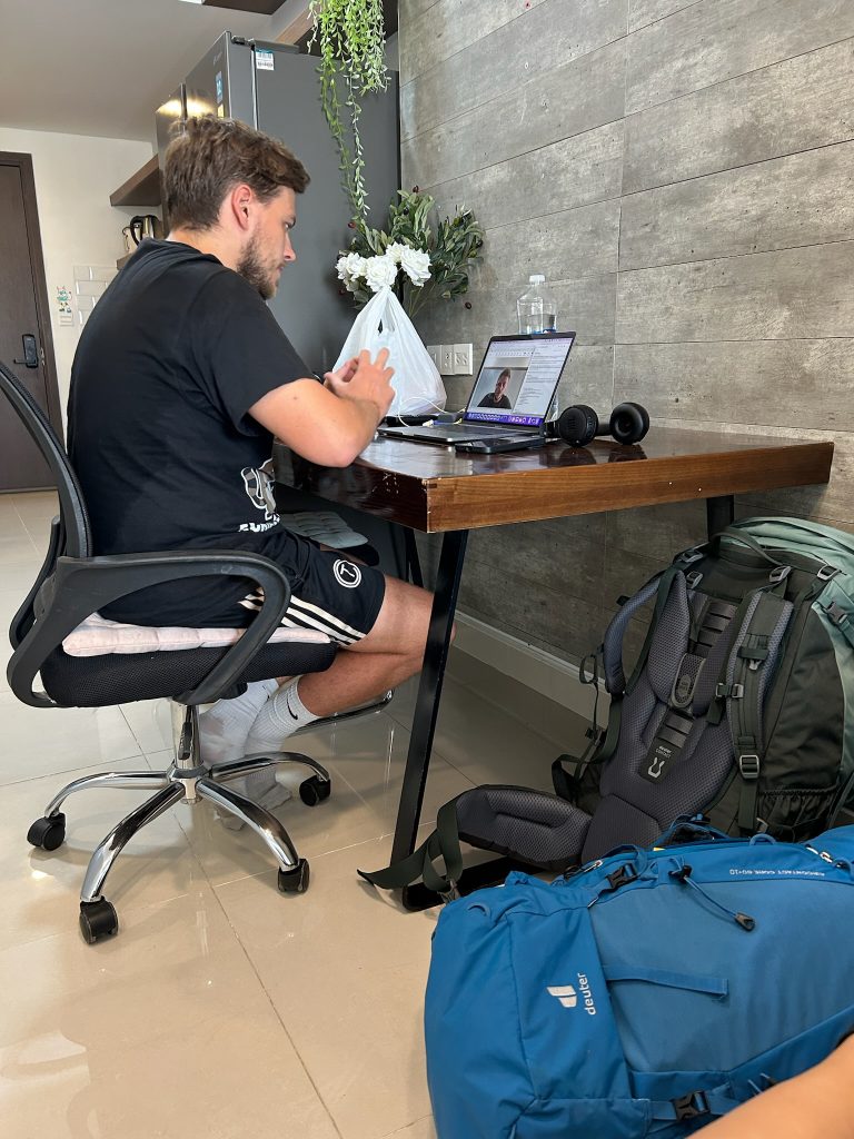 Nebenbei waren wir mit der Gastgeberin in Kontakt. Es war nämlich wichtig, dass wir um 14 Uhr reinkamen, weil Marco um 14:30 Uhr einen wichtigen Online-Termin mit einem potentiellen Kunden von empirio hatte, aber sie waren noch nicht fertig mit putzen und haben versucht, uns zu vertrösten. Als wir aber erklärt haben, warum es uns so wichtig ist, wollte sie uns früher reinlassen. Also holten wir unser Gepäck beim Hotel ab, waren pünktlich um 14 Uhr vor der Lobby des Hochhauses und gingen mit der Gastgeberin rein. Sie führte uns in das Apartment und übergab uns die Chipkarte, mit der man nur in das Gebäude und die Wohnung kommt. Währenddessen war eine Dame noch am putzen, was uns nicht störte aber wir hoffen, dass wir sie nicht gestört haben. Aber 15/20 Minuten später war sie schon, rechtzeitig vor Marcos Termin, fertig. Für die gleiche Zeit hatte ich mich mit einer Freundin zu einem Video-Telefonat verabredet.