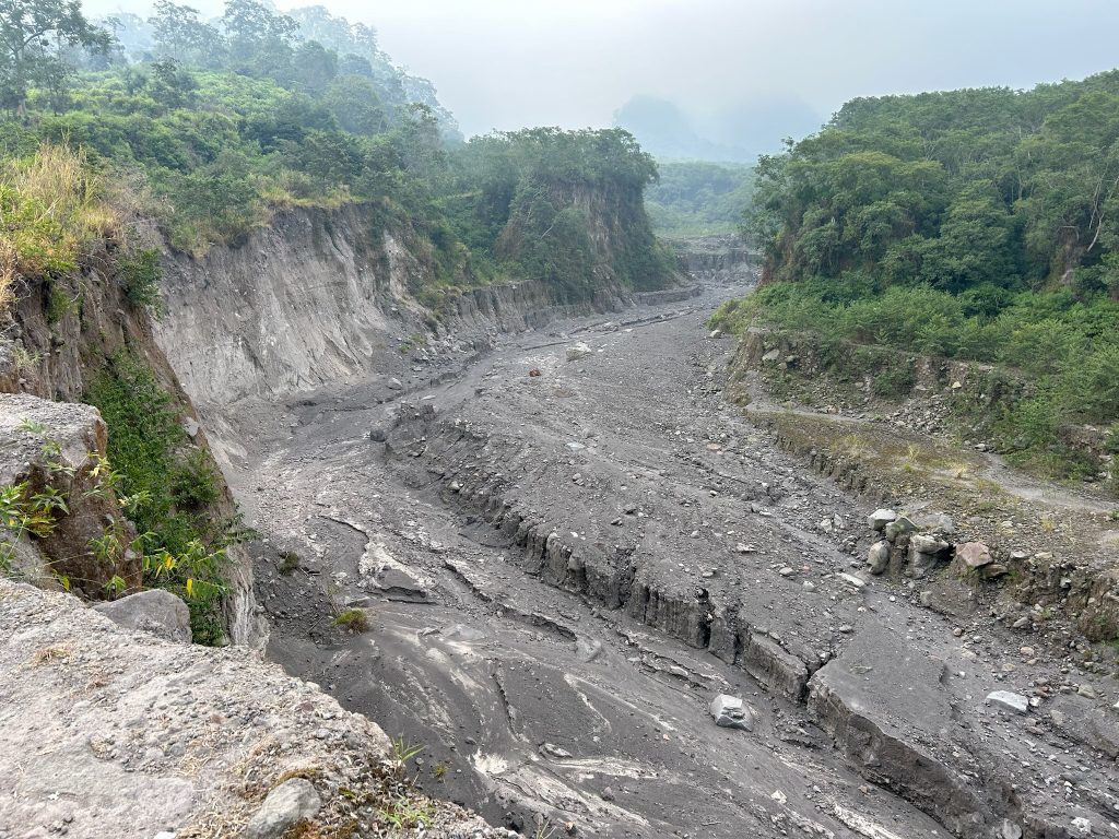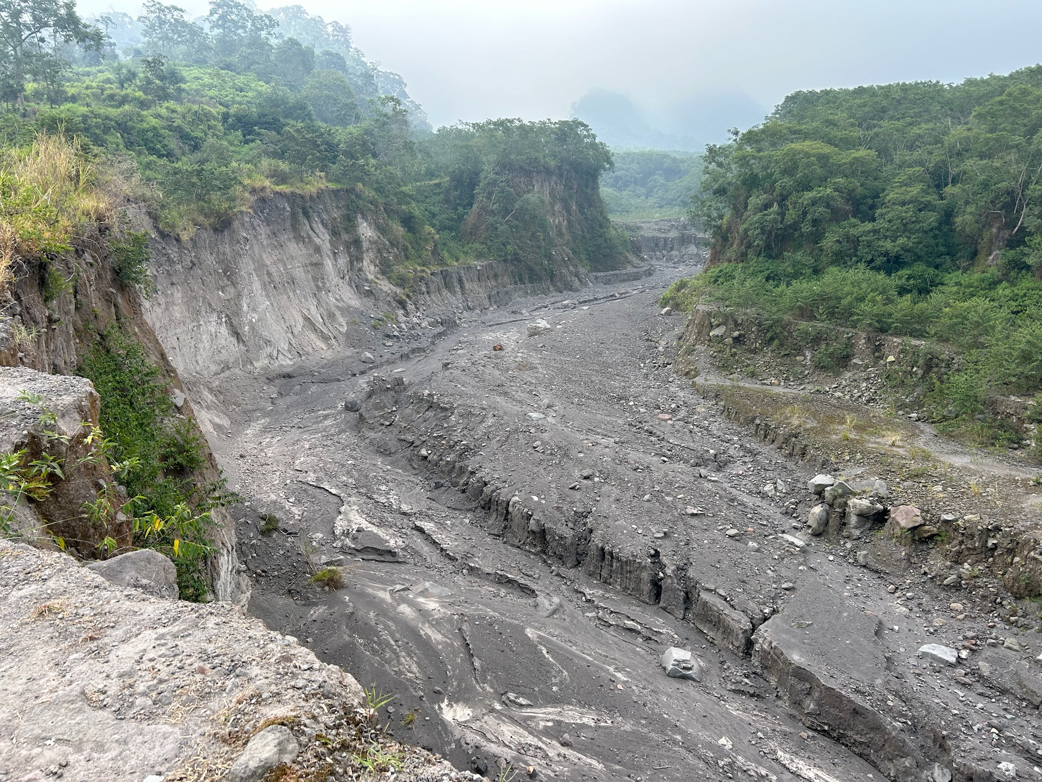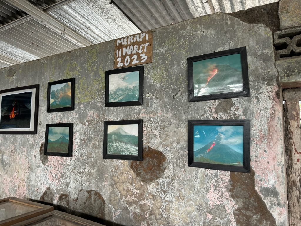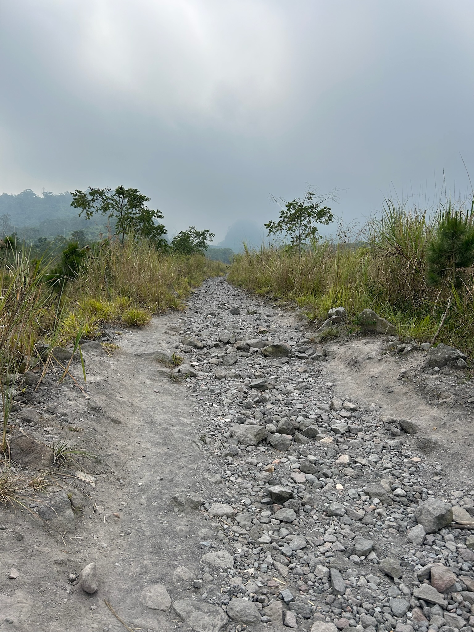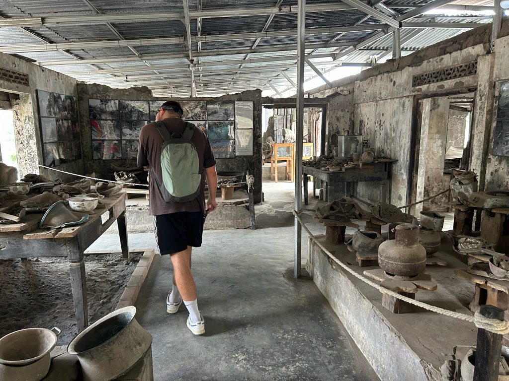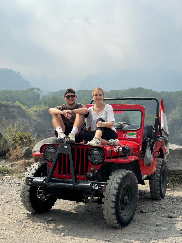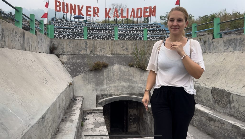 Für heute hatten wir eine Jeep Tour durch die Lava Landschaft des Merapi Vulkans geplant. Wir suchten uns einen der vielen Anbieter raus und reservierten vorsichtshalber per WhatsApp. Die Fahrt nach Norden, immer geradeaus den Berg hoch dauerte ca. 1 Stunde. Um 12:30 Uhr kamen wir an, bezahlten unser Ticket für eine mittellange Tour (2 Std., 30€) und stiegen in einen roten Jeep. Die Fahrt ging teilweise über Asphaltstraßen, teilweise über sehr holprige Schotterwege. Der erste Stop war ein Bunker ein paar Kilometer vom Vulkan entfernt. Leider hatten wir heute Pech und der Vulkan lag in den Wolken. Während der Tour erklärte uns der junge und freundliche Fahrer einiges. Wir erfuhren, dass der Merapi Vulkan gerade Level 3 von 4 hat und kontinuierlich etwas Lava ausströmt, allerdings auf seiner Westseite. In dem Bunker sind beim Ausbruch 2006 zwei flüchtende Männer gestorben, weil der Bunker nicht für die heiße Gaswolke ausgelegt ist, wodurch es 200 Grad in dem Bunker wurde… Wir konnten hinter dem Bunker ein Stück weiter laufen bis wir zu einem Canyon, einem ausgetrocknetem Flussbett kamen. Theoretisch waren wir dem Vulkan so nah aber konnten ihn leider nicht sehen. Unterwegs zum nächsten Stop hielten wir an einem Foto-Spot, wo der Fahrer ein paar Fotos von uns machte. Dabei lichteten sich ein wenig die Wolken, sodass wir den Vulkan erahnen konnten.