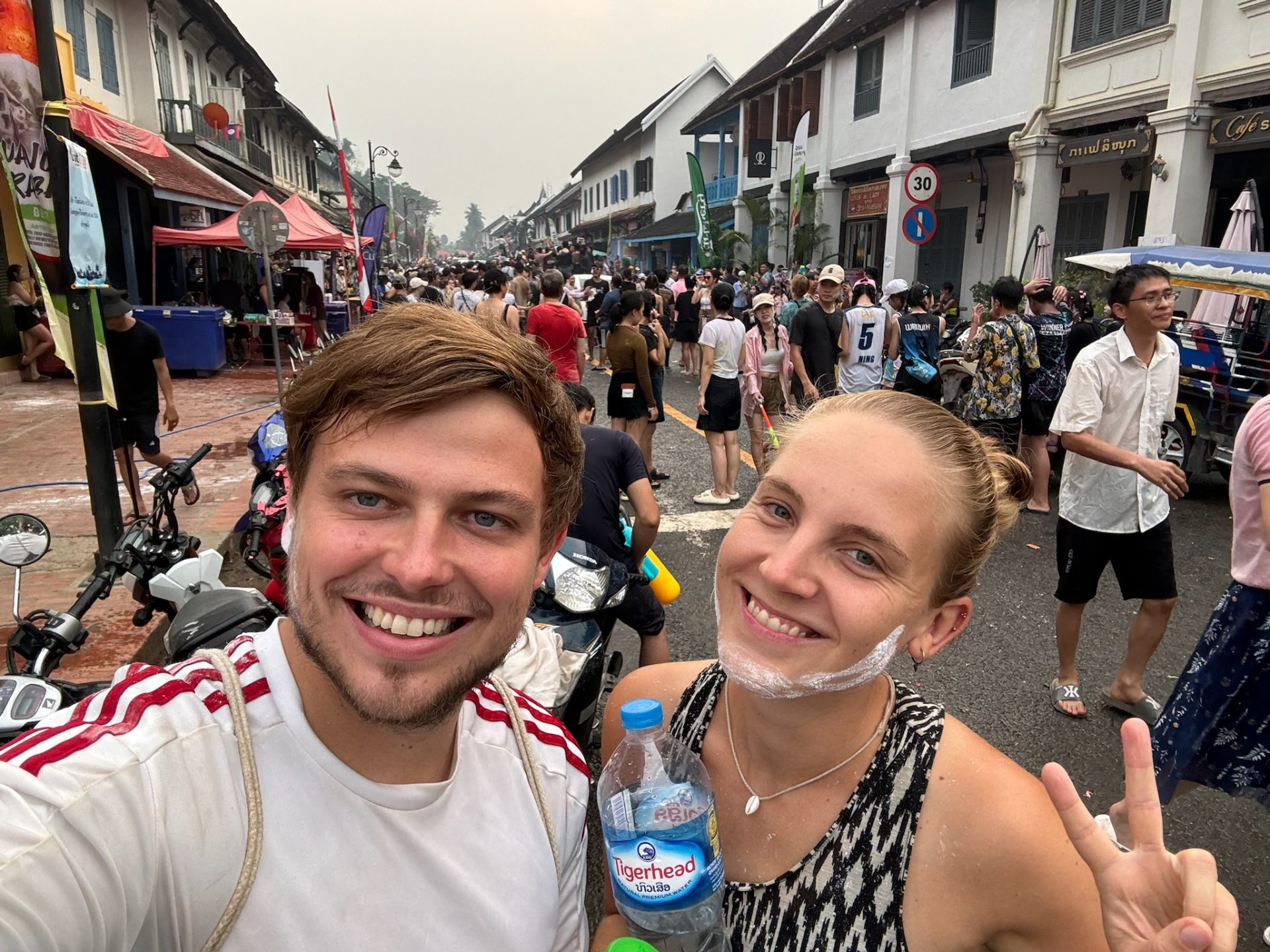 Wir setzten uns in den Frühstücksbereich auf der überdachten Terrasse vor der Rezeption. Das Frühstück konnten wir uns von einer Karte aussuchen. Danach setzten wir uns wieder ins Zimmer zum Recherchieren und Arbeiten. Mittags setzten wir uns dann mit den Laptops in das Café um die Ecke, erst auf ein Getränk und später noch für einen Mittagssnack. Auf 15:30 Uhr mussten wir zurück, da Marco noch ein Meeting hatte. Um 17 Uhr liefen wir dann nochmal los, um die historische Altstadt nördlich des Phousi Hill zu erkunden, und folgten einem Auto- und Rollerkorso. Unser Hotel liegt ziemlich zentral südlich des Phousi Hill. Es liegt somit in der Nähe einer Straße, wo schon viel abgeht, aber hier entdeckten wir, das hier die RICHTIGE Party auf der Hauptstraße der Stadt abgeht. Die ganze Straße war einfach voll mit Menschen, vorwiegend junge Leute, und der Korso mittendrin. Auf den Ladeflächen der Pick ups standen und feierten die Leute. Am Rand standen Tische, an denen die Leute tranken, und Musikboxen. Wir liefen erst einmal außen herum am Mekong lang und begaben uns dann in die Partymeute. Die Straße war so voll, dass man kaum vorwärts kam. Außer mit Wasser wird man auch mit Babypuder auf den Wangen beschmiert. Später am Abend fing es dann an zu regnen, sodass wir uns auf den Rückweg machten. Wir waren zwar schon bis auf die Unterhose nass aber es wurde dann tatsächlich etwas kalt. Außerdem bekamen wir Hunger und setzten uns in den Pub bei uns um die Ecke. Später in der Nacht hat es dann noch heftig gewittert.