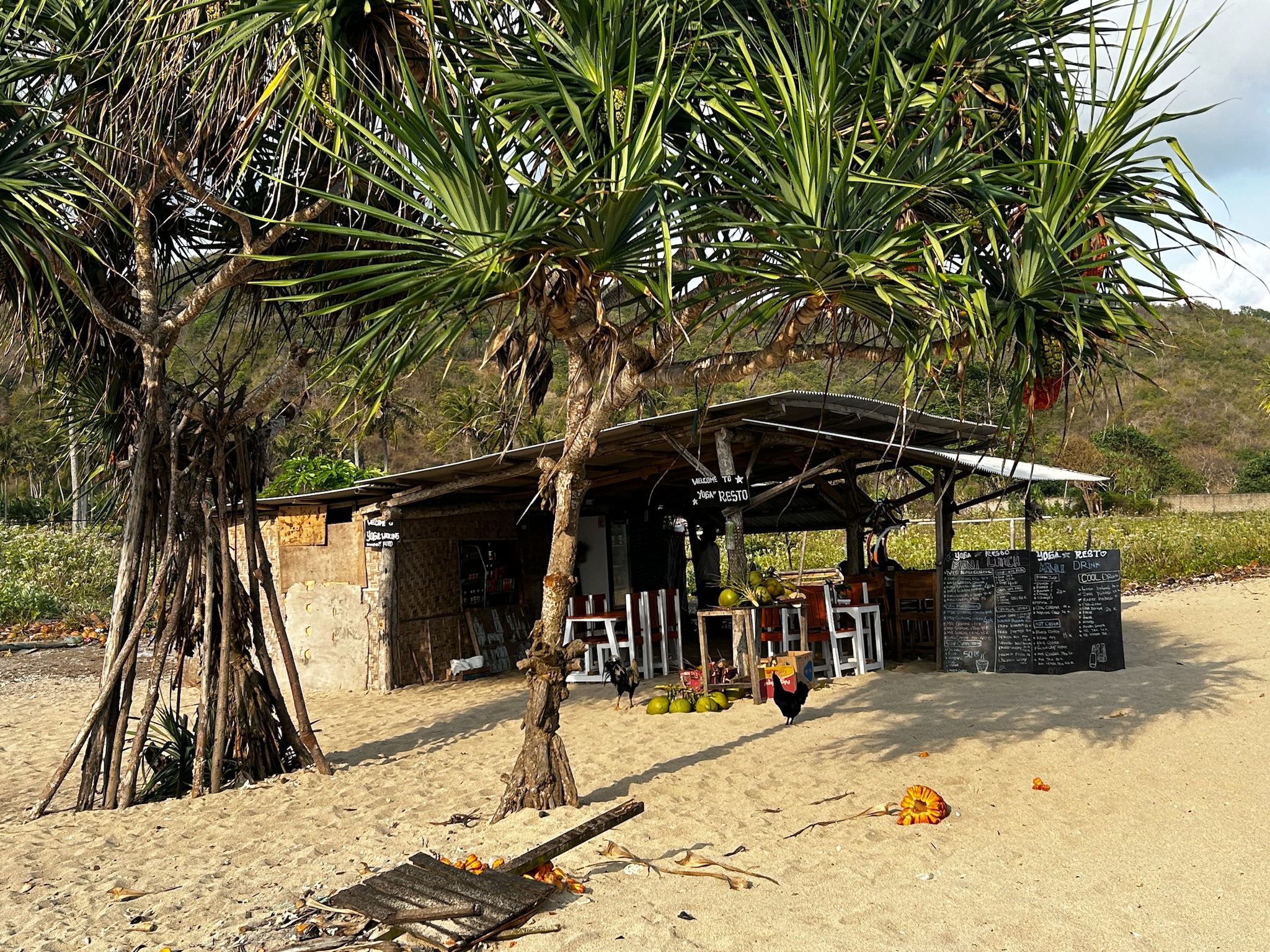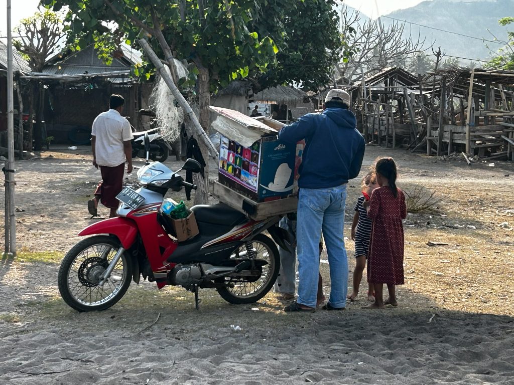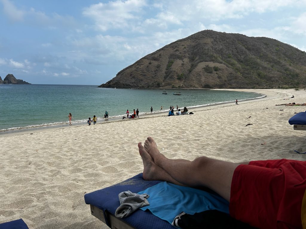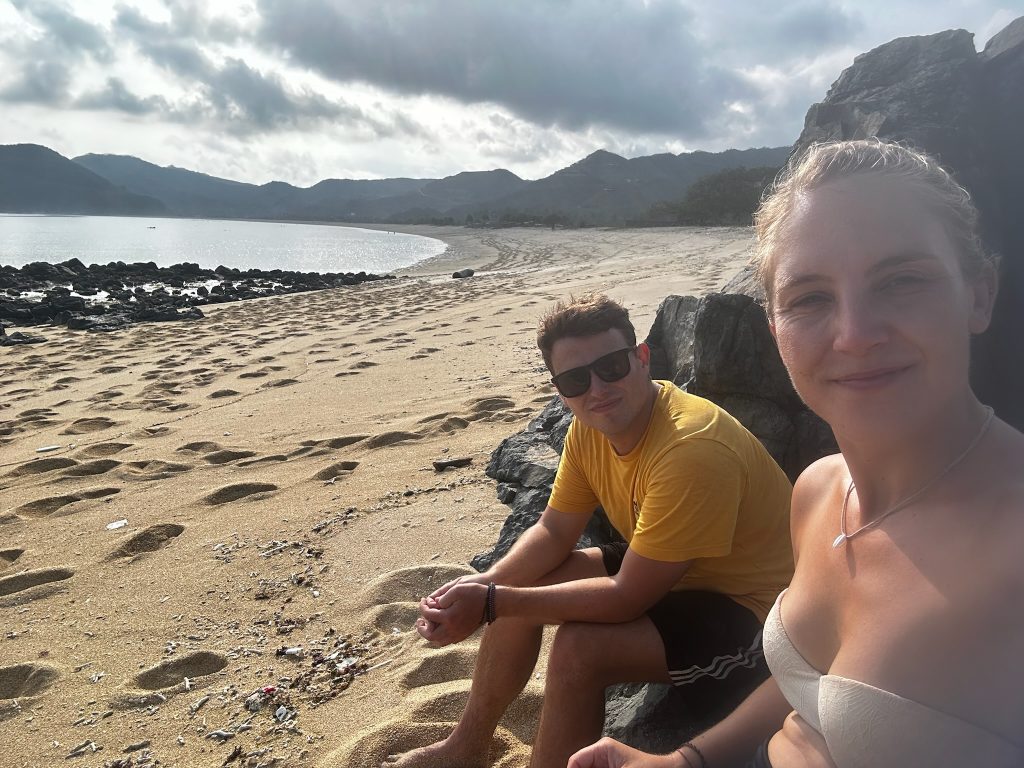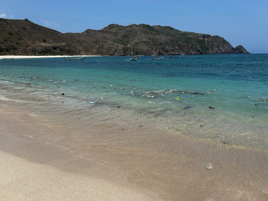 Heute frühstückten wir im Tribe und tauschten auf dem Rückweg zum Hotel 20€ in einer Wechselstube. Später machten wir uns auf den Weg zum Pantai Mawun in einer Bucht, die 15 Minuten westlich von Kuta liegt. Beim Ortsausgang wollten wir nochmal zwei Flaschen auftanken lassen und haben dabei gemerkt, dass wir unser Geld vergessen haben, also ist Marco nochmal zum Hotel zurückgefahren – gut, dass wir hier schon tanken wollten. Am Mawun Beach waren einige Beachbars mit Strandliegen. Am Anfang war der Strand und das Wasser leider super vermüllt. Als wir den Strand entlang gingen, wurde es besser, wir suchten uns eine Hütte aus und bestellten uns ein Getränk. Wir entschieden uns, für zwei Stündchen auf die Liegen zu legen. Hier liefen sehr viele Kinder herum, die Armbänder verkaufen wollten, die Touristen belagern und immer die gleichen Fragen stellen…