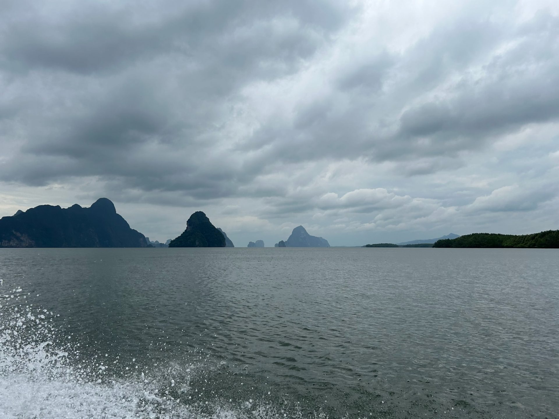 Der Surakul Pier, von dem unsere heutige Bootstour startete, liegt ganz in der Nähe des Tempels. Dort angekommen wurden wir mit anderen Gruppen zusammen zu unserem Longtail-Boot geleitet, in das ca. 40 Leute passen. Nachdem alle eine Rettungsweste bekommen haben und eingestiegen sind, ging die Fahrt los, erst Mal über einen Fluss durch einen Mangroven-Wald raus aufs Meer. Wir fuhren auf beeindruckende bewaldete Felsen zu, die in der Bucht verteilt sind. Die Fahrt auf dem offenen Meer war recht rasant, sodass man teilweise gut nassgespritzt wurde.