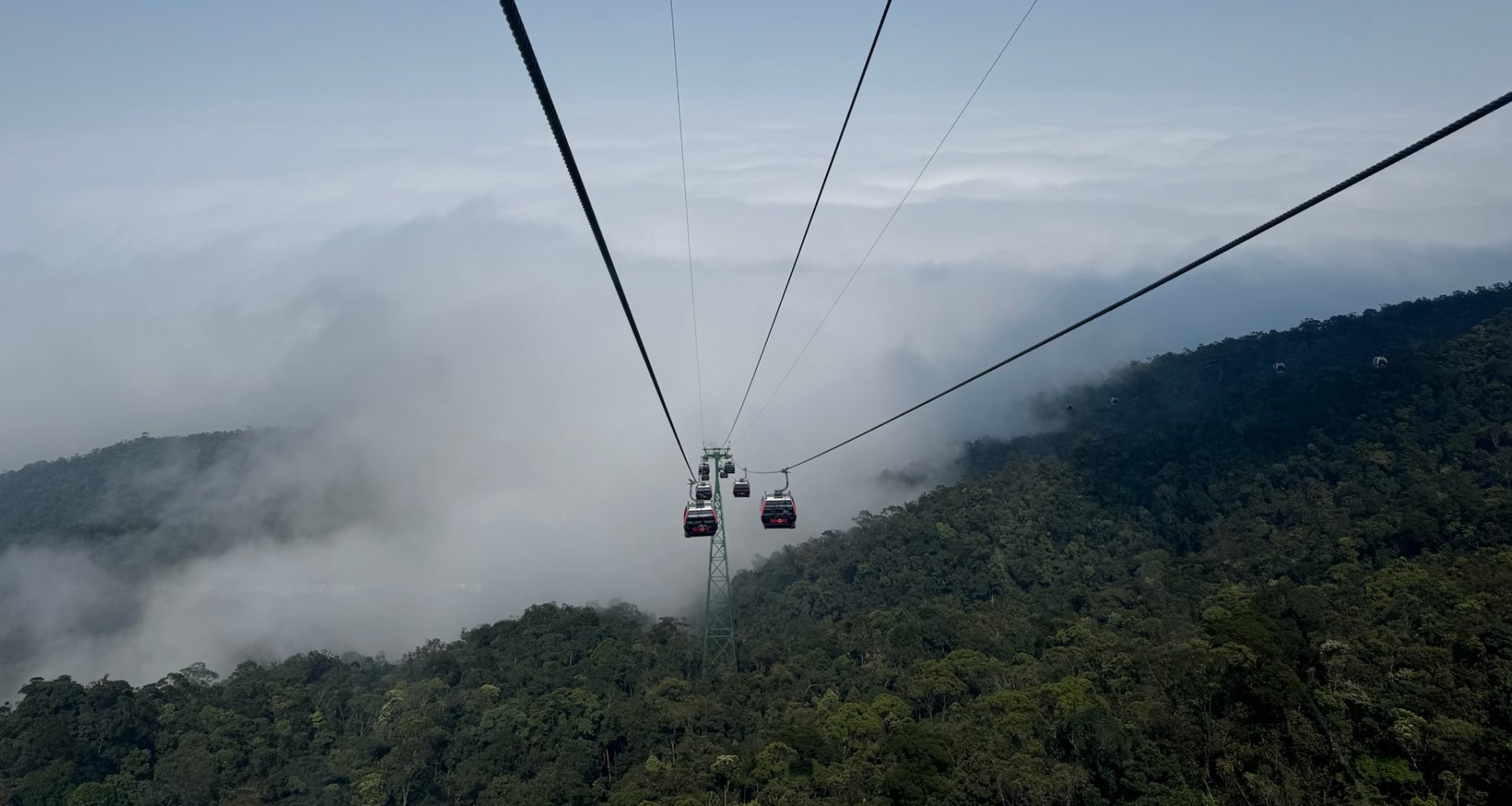Heute sind wir wieder um 8 Uhr aufgestanden und in ein süßes Café Frühstücken gefahren. Nach einem Zwischenstop im Hotel fuhren wir 30 Minuten zum Ba Na Hill im Westen. Hier gibt es eine Art Vergnügungspark für Erwachsene. Wir wussten nicht wirklich, was uns erwartet. Nachdem wir uns ein Ticket (33€ pro Person) gekauft haben, stiegen wir in die Seilbahn nach oben. Die Fahrt dauerte 20-30 Minuten und wir sind mal wieder durch die Wolken gefahren. Oben angekommen, besichtigten wir zuerst eine bekannte Sehenswürdigkeit von Da Nang, die Goldene Brücke, wo man kaum vorwärts kam durch die vielen Leute.