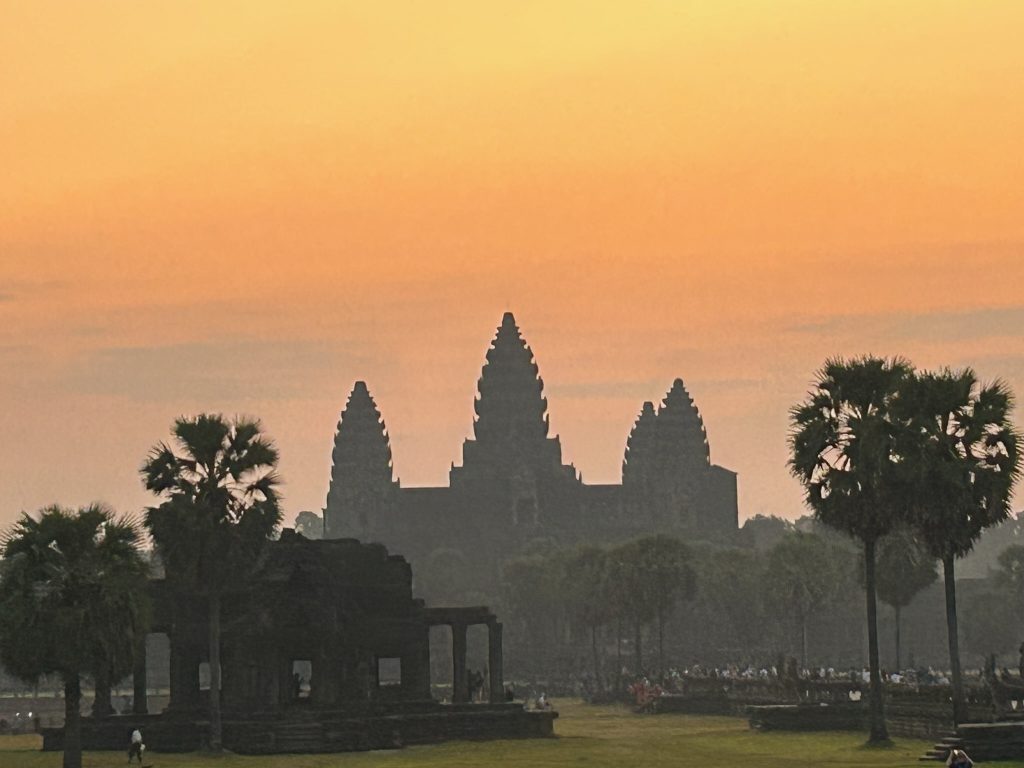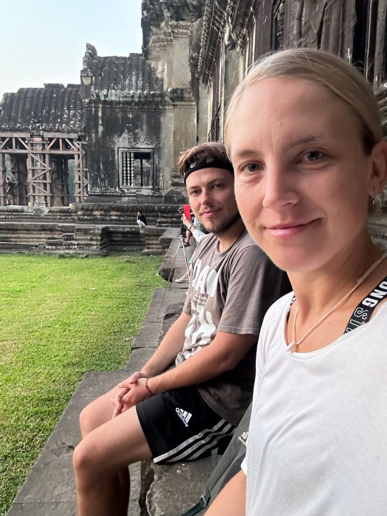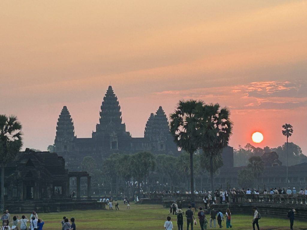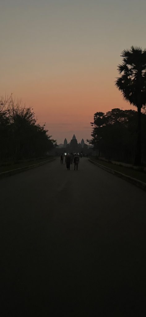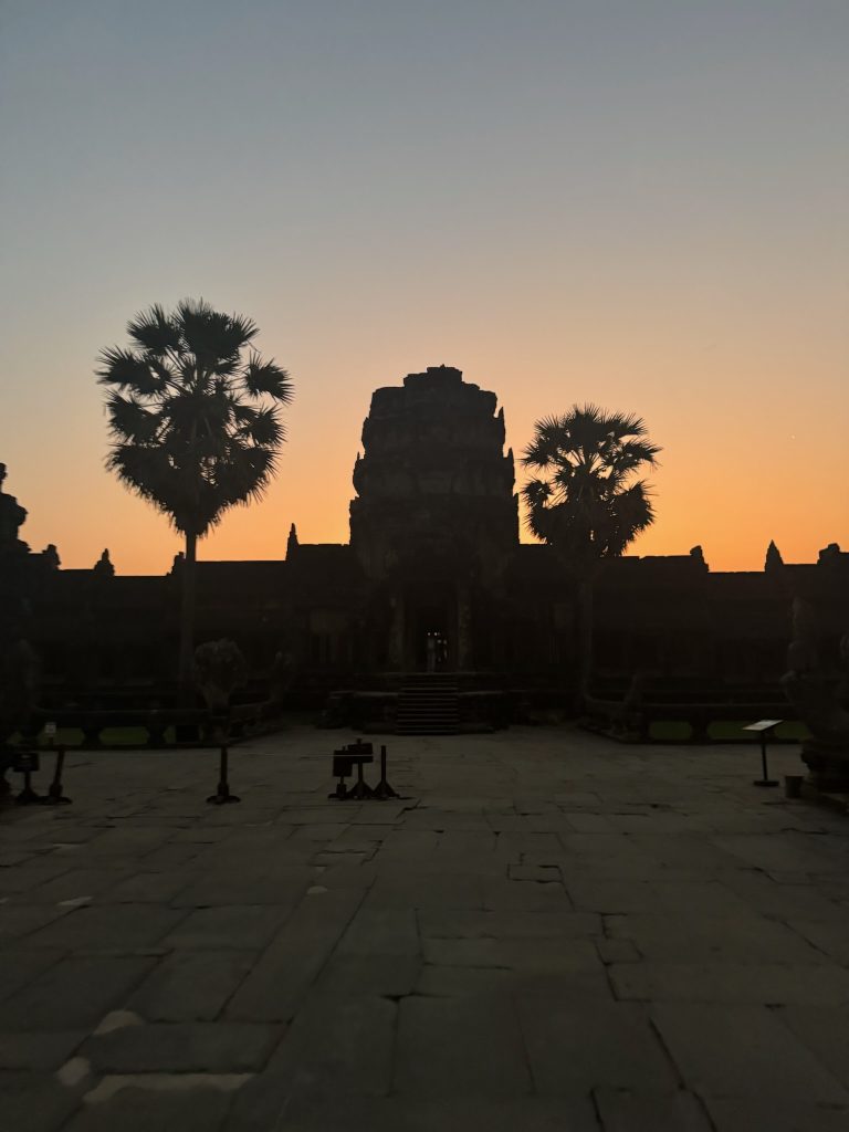 Wir beschlossen jetzt immer nur Halbtages-Erkundungen in der Tempelanlage zu machen, weil es ab Mittags bei 36 Grad einfach zu heiß dafür wird. Heute wollten wir uns nochmal den Sonnenaufgang bei Angkor Wat anschauen aber diesmal von einem anderen Spot aus. Also fuhren wir um 5:45 Uhr los. Wir setzten uns diesmal auf die erhöhten Mauern des Eingangstors mit Blick nach Osten. Von hier war es ein besserer Platz, den Sonnenaufgang zu beobachten und dabei gab es Croissant und Obst zum Frühstück. Danach machten wir noch ein paar Fotos und gingen zurück zum Roller.