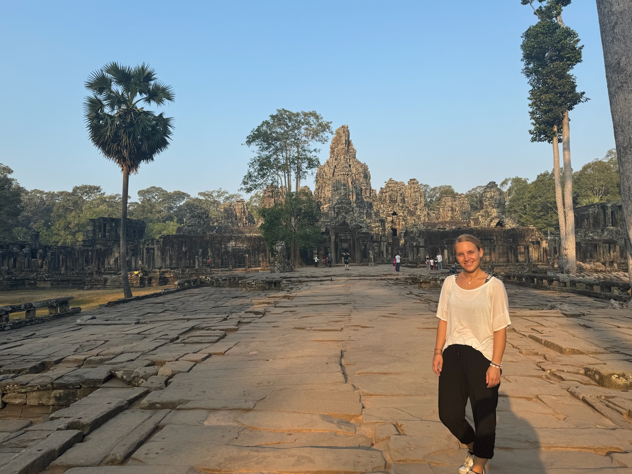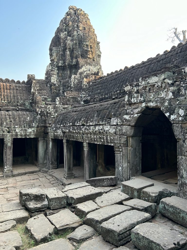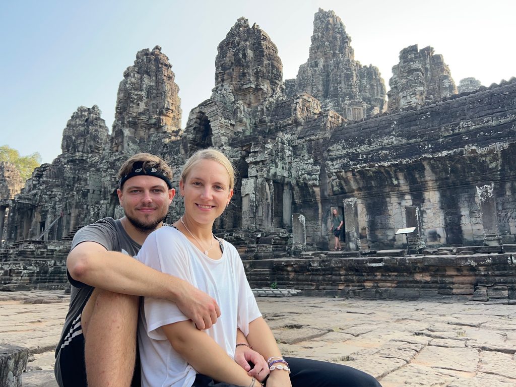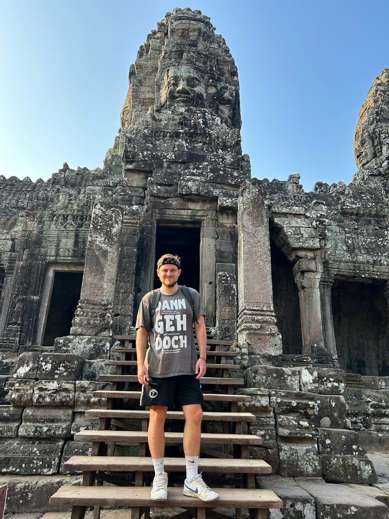 Heute wollten wir den Bayon-Tempel in der ehemaligen Hauptstadt Angkor Thom besichtigen. Um die Uhrzeit war hier zum Glück noch nicht so viel los. Wir erkundeten den Tempel mit mehreren Ebenen, Treppen und Innenhöfen. Das besondere und beeindruckende hier sind die Türme mit den vielen Gesichtern aus Stein in jede Himmelsrichtung.