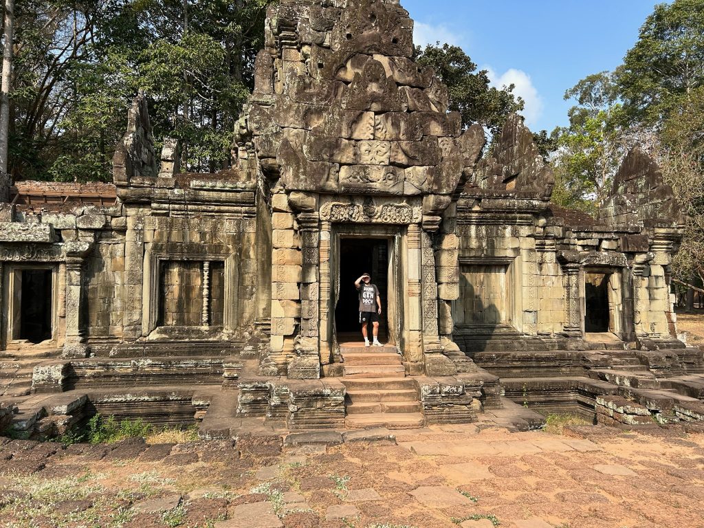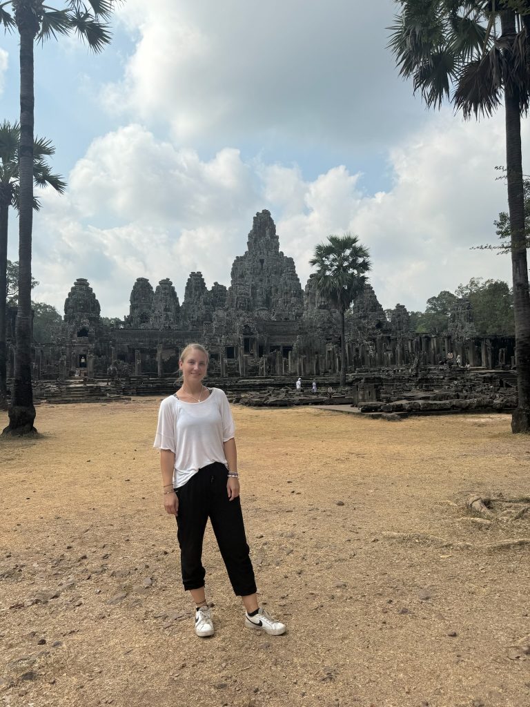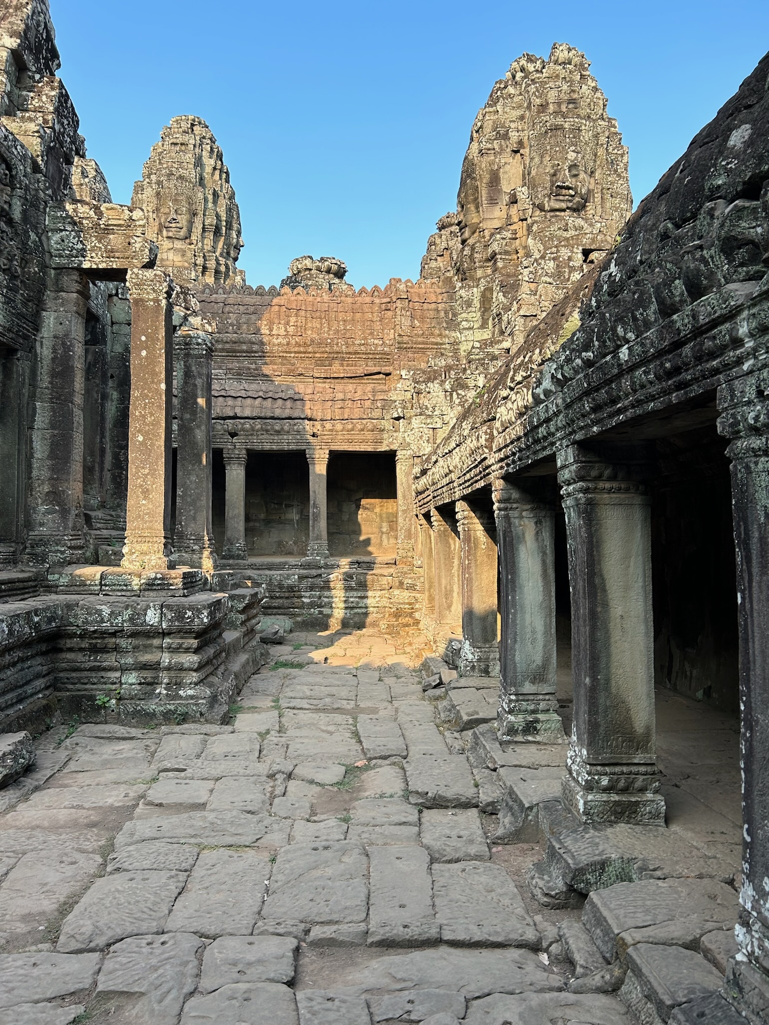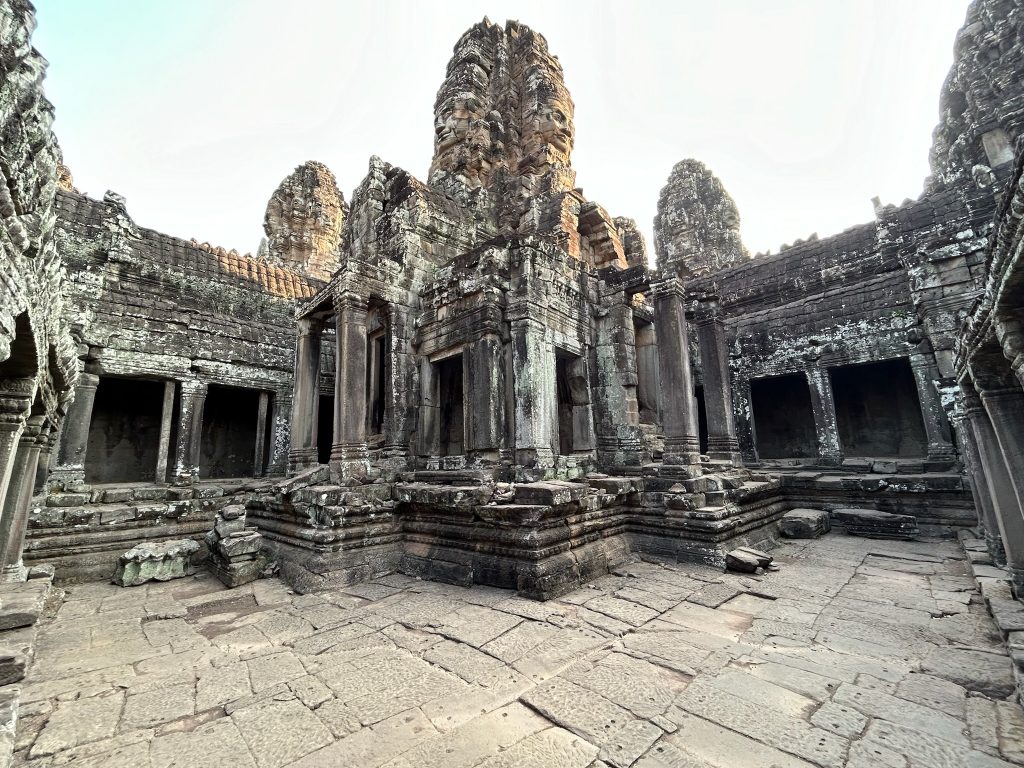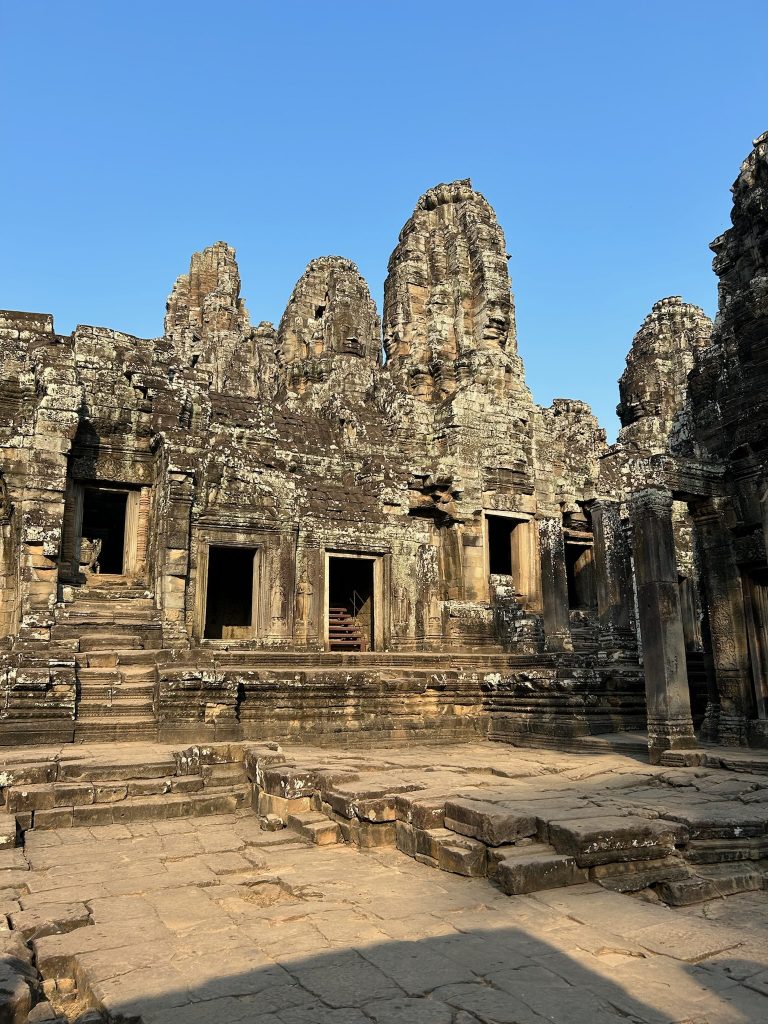 Heute wollten wir den Bayon-Tempel in der ehemaligen Hauptstadt Angkor Thom besichtigen. Um die Uhrzeit war hier zum Glück noch nicht so viel los. Wir erkundeten den Tempel mit mehreren Ebenen, Treppen und Innenhöfen. Das besondere und beeindruckende hier sind die Türme mit den vielen Gesichtern aus Stein in jede Himmelsrichtung.