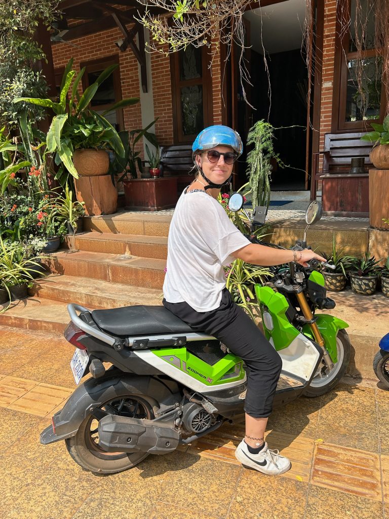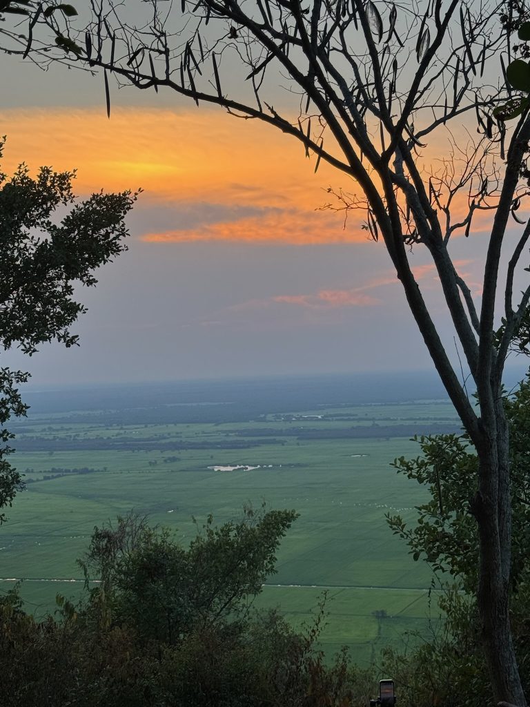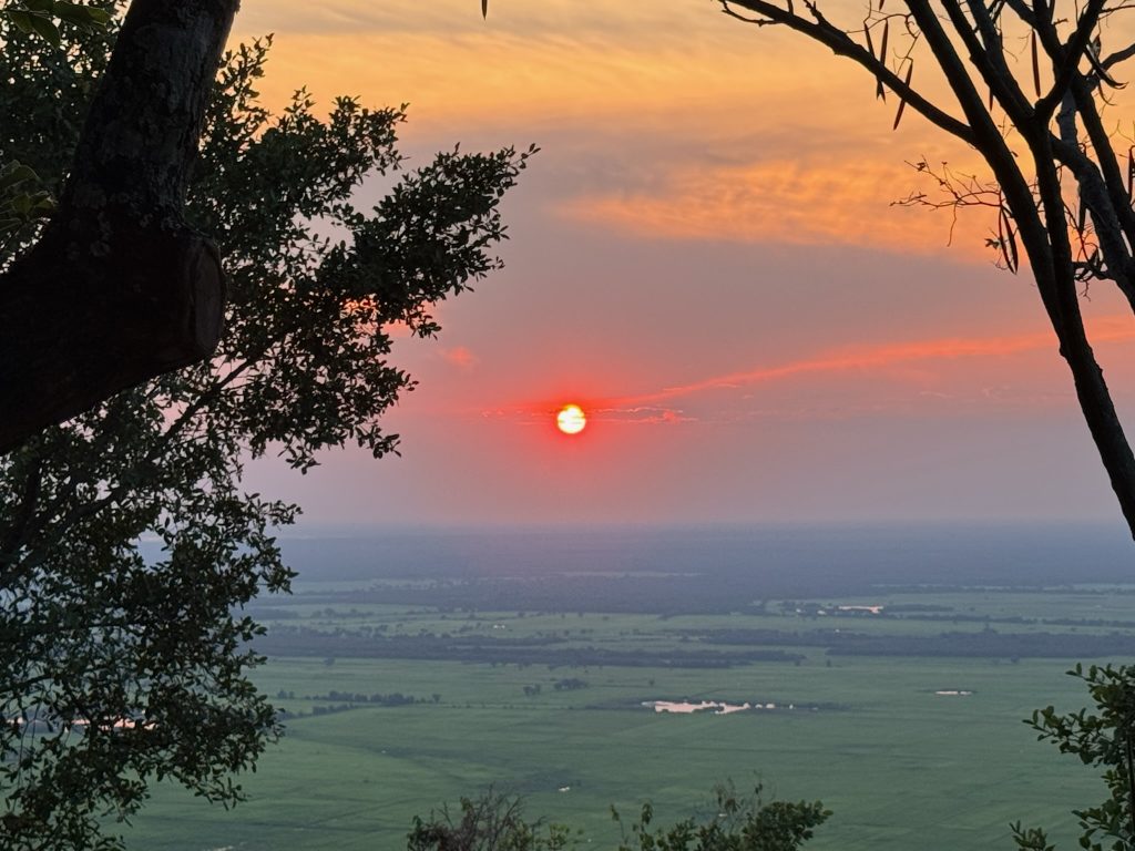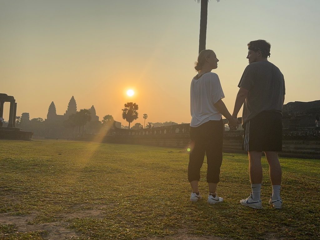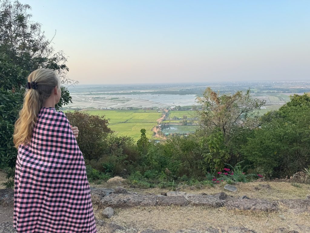 Nach einer Dusche in unserer Unterkunft fuhren wir am frühen Abend ca. 30 Minuten Richtung Tonlé Sap See. Dabei fuhren wir durch ein Dorf, das auf Stelzen gebaut war. Leider kamen wir nicht direkt ans Wasser, durch die Schranke kamen anscheinend nur befugte Personen. Also fuhren wir auf den nahegelegenen Berg Phnom Kraom, um von hier den Sonnenuntergang anzuschauen. Was wir nicht wussten – um zu dem Spot zu kommen, mussten wir durch einen Tempel durch und ich hatte keine langen Sachen dabei. Also musste ich mir vor Ort ein Tuch für 1 $ leihen. Der Sonnenuntergang war schön bei dem Kontrast zu der grünen Landschaft.
