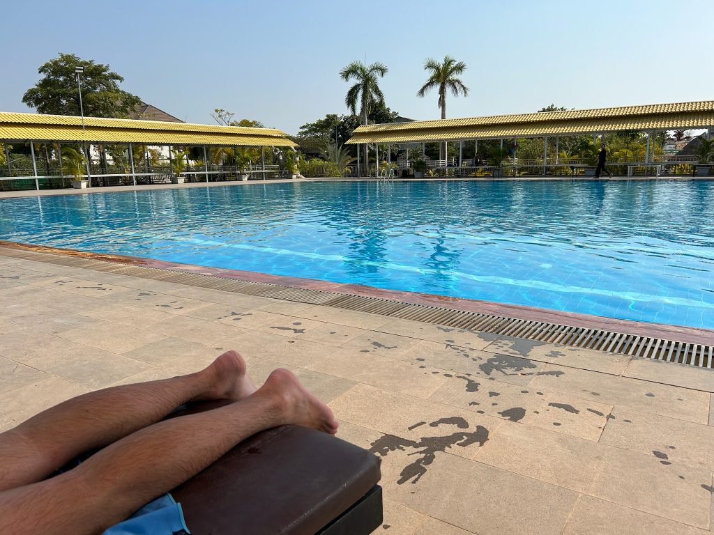 Gegen 11 Uhr fuhren wir wieder in unser Lieblingscafé für ein richtiges Frühstück. Bei einem Zwischenstopp im Zimmer buchten wir unsere Unterkunft in Phnom Penh für unsere letzte Nacht in Kambodscha. Dann fuhren wir in die Stadt, um einen Stand zu suchen, wo man Bustickets kaufen kann, um eins nach Kratie zu kaufen. Danach fuhren wir in das Freibad von Siem Reap. Wir dachten, wenn wir keinen Pool haben, könnten wir uns hier abkühlen aber das Wasser war natürlich super aufgeheizt. Hier verweilten wir ca. 2,5 Stunden und waren fast alleine.
