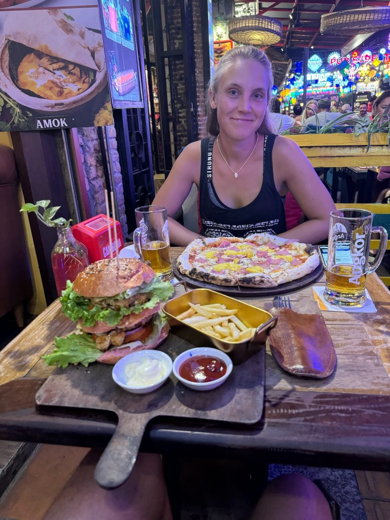 Danach fuhren wir zurück in die Stadt, nochmal in die Pubstreet zum Abendessen. Wir setzten uns einfach in das Restaurant vom Vorabend, hier gab es für mich eine Pizza und für Marco einen Burger mit Krokodil-Fleisch. Krass wie lange ein Tag ist, wenn man so früh aufsteht 😀