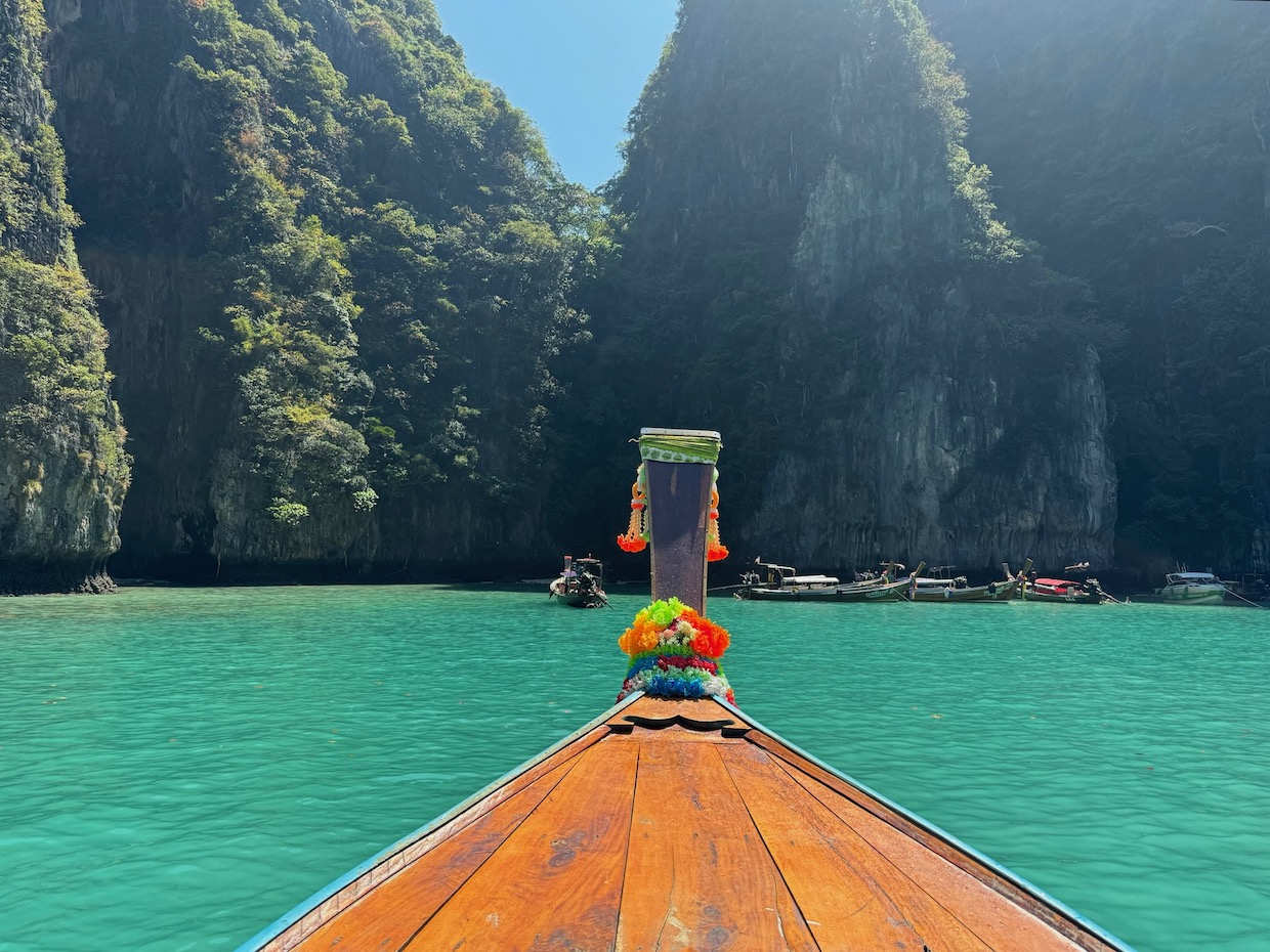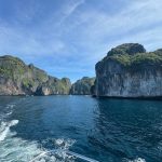 Der nächste Spot war die bekannte Maya Bay der Insel Koh Phi Phi Leh. Wir fuhren in die Bucht und hielten neben den anderen vielen Longtail-Booten. Hier konnten wir uns nochmal abkühlen aber zum schnorcheln war es hier nicht besonders, sodass wir nach einem kurzen Aufenthalt weiterfuhren. Wir entschieden uns auch dagegen, den Strand der Bucht zu Fuß zu betreten, da der Strand schon viel zu überlaufen war und uns der Blick vom Boot auf die schöne Bucht ausgereicht hat, vom Strand aus hätte man auch nicht mehr gesehen.