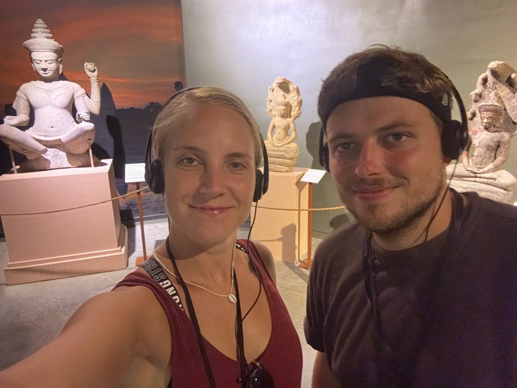 Da wir immer noch nicht 100%ig fit waren, wollten wir ausschlafen und den Tag langsam angehen. Wir wollten über unsere Unterkunft einen Roller mieten. Dafür brauchten wir erst mal wieder Bargeld, also lief Marco zum nächsten Bankautomaten. Dieser hat zum ersten Mal nur Dollar ausgegeben. Über die Nummer von der Vermietung hat sich leider keiner gemeldet. Also fuhren wir mit einem Tuk Tuk über Grab in die Stadt, erst mal in ein Frühstückslokal. Von dort liefen wir 10 Minuten zu Fuß zum Nationalmuseum. Wir liefen dort ca. 3,5 Stunden mit einem Audioguide durch die Ausstellungsräume. Wir dachten, wir machen heute lieber noch was entspanntes in klimatisierten Räumen aber irgendwie war es doch noch anstrengend.