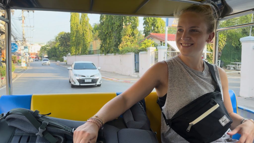 Heute ging es weiter mit dem Bus nach Bangkok. Wir checkten um 8 Uhr aus und liefen Richtung Strand, weil wir dort am Vortag einige Tuk Tuks stehen sahen. Erst das zweite Mal, dass wir einen Tuk Tuk Fahrer ansprechen. Wir fuhren 10 Minuten bis zum Abfahrtpunkt an einem Shopping Center und holten unsere Tickets. Im Einkaufszentrum gingen wir nochmal auf Toilette, aber alles andere hatte noch geschlossen und wir brauchten noch Frühstück. Wir hatten in der Nähe eine „German Bakery“ gesehen, also rennt Marco in 20 Minuten zu dem Bäcker. Da sie aber nichts Fertiges hatten, lässt er sich noch Baguettes belegen und war gerade so rechtzeitig zurück…Um 9 Uhr war Abfahrt. Nach vier Stunden Fahrt erreichten wir Bangkok – sogar eine Stunde früher als geplant, mit einer kurzen Pause an einer Raststätte.