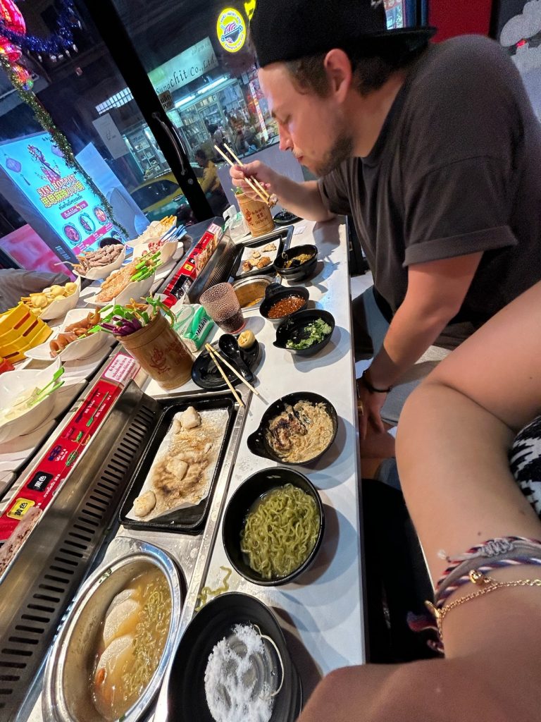 Unser Hotel haben wir mal wieder praktisch ausgesucht – es lag direkt an einer Bahnstation. Nach dem Einchecken ruhten wir uns erst mal im Zimmer aus. Das Zimmer war mega modern, sodass wir uns gleich wohlfühlten und oh mein Gott, wir hatten mal wieder weiche Betten und gutes WLAN. Das Zimmer hatten wir für eine Woche gebucht. Abends wollten wir dann nochmal los, eigentlich in eine Skybar aber hatten es uns dann auf dem Weg nochmal anders überlegt und wollten lieber erst mal ein Restaurant für unser Abendessen suchen. Von der Hauptstraße abgebogen, sind wir wohl in einem chinesisch geprägten Stadtteil gelandet. Also probieren wir zum ersten Mal ein chinesisches (rotierendes) Buffet. Wir konnten uns eine Basis-Suppe aussuchen und an uns vorbei fuhren Fleisch, Gemüse, Nudeln und andere exotische Sachen, die wir in der Suppe kochen oder auf einer Platte daneben braten konnten. Für mich war nicht soo viel dabei aber Marco hat es gefeiert. Danach machten wir den Verdauungsspaziergang zurück ins Hotel.