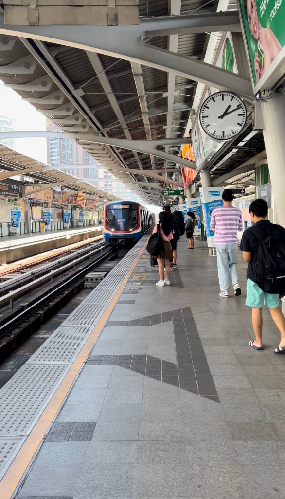 Da standen wir nun, Mitten in Bangkok. Wir wurden mal wieder einfach an einer Straße rausgelassen. Wir dachten erst dran mit einem Taxi zum Hotel zu fahren aber wir sahen vor uns direkt eine Bahnstation. Also warum nicht gleich rein ins Getümmel, mit Google Maps heutzutage ja kein Problem. Wir kauften uns für ein paar Cent eine Fahrkarte bzw. einen Chip und folgten der Wegbeschreibung von Google. Wir mussten einmal umsteigen, noch 40 Minuten fahren und dabei die ganze Zeit mit unseren schweren Rucksäcken stehen, weil die Metro natürlich voll war.