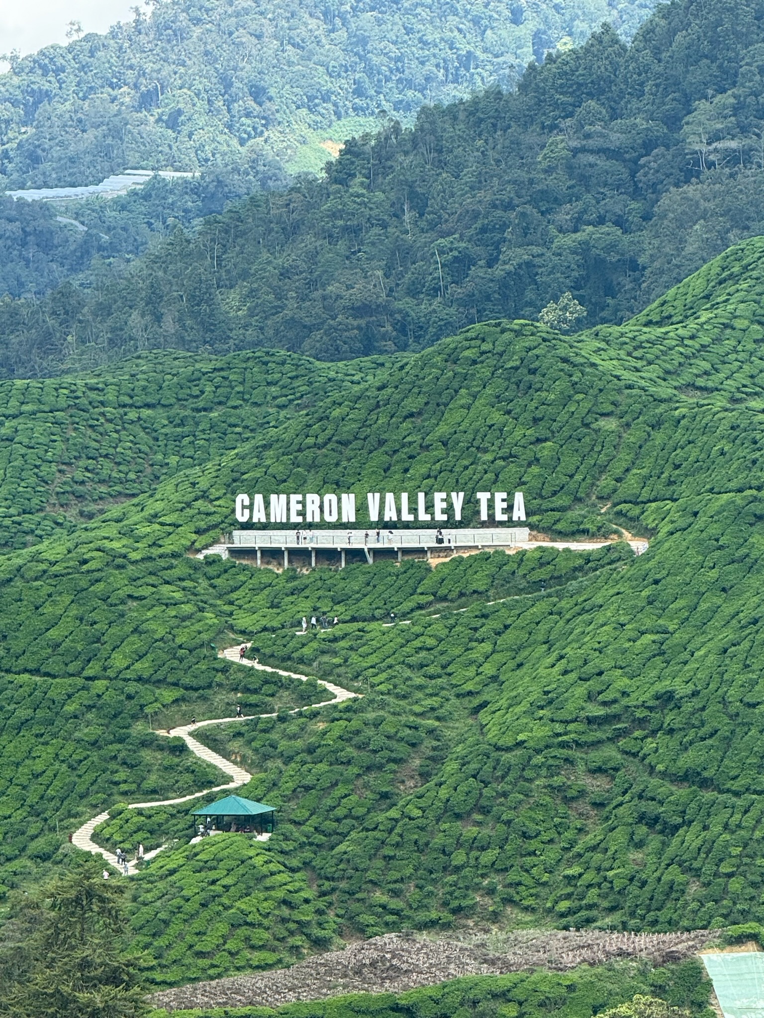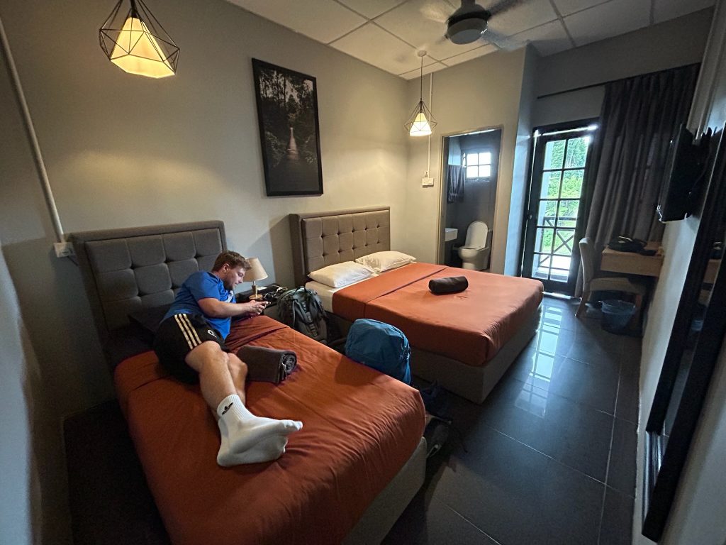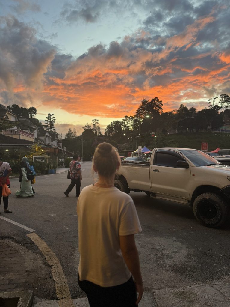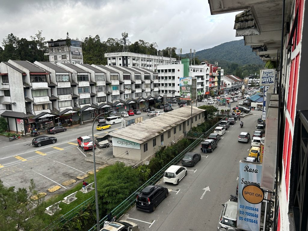 Um 12:30 Uhr ging die Fahrt los in die Cameron Highlands und dauerte ca. 4,5 Stunden. Unterwegs hielten wir noch, um weitere Fahrgäste (vermutlich aus dem Norden) einzusammeln. Gegen 17 Uhr kamen wir in Tanah Rata an deren Booking Office im Stadtzentrum an – und nicht wie gedacht am Busbahnhof. Dadurch mussten wir nur ein paar Minuten zu unserem Hostel laufen. Nachdem wir eingecheckt und uns über unser modernes Zimmer (die letzten Tage war es ja eher „simpel“) gefreut hatten, ließen wir uns an der Rezeption über Touren in dem Gebiet beraten. Danach gingen wir in eine coole Eckbar für unser Abendessen. Hier in den Cameron Highlands ist es aufgrund der Höhenlage (zwischen 1.000 und 2.000 m Höhe) deutlich angenehmer von den Temperaturen her. Tagsüber wurden es einfach nur bis zu 26 Grad und abends kühlt es sich auf 22 Grad runter – das war eine willkommene Abwechslung für uns.