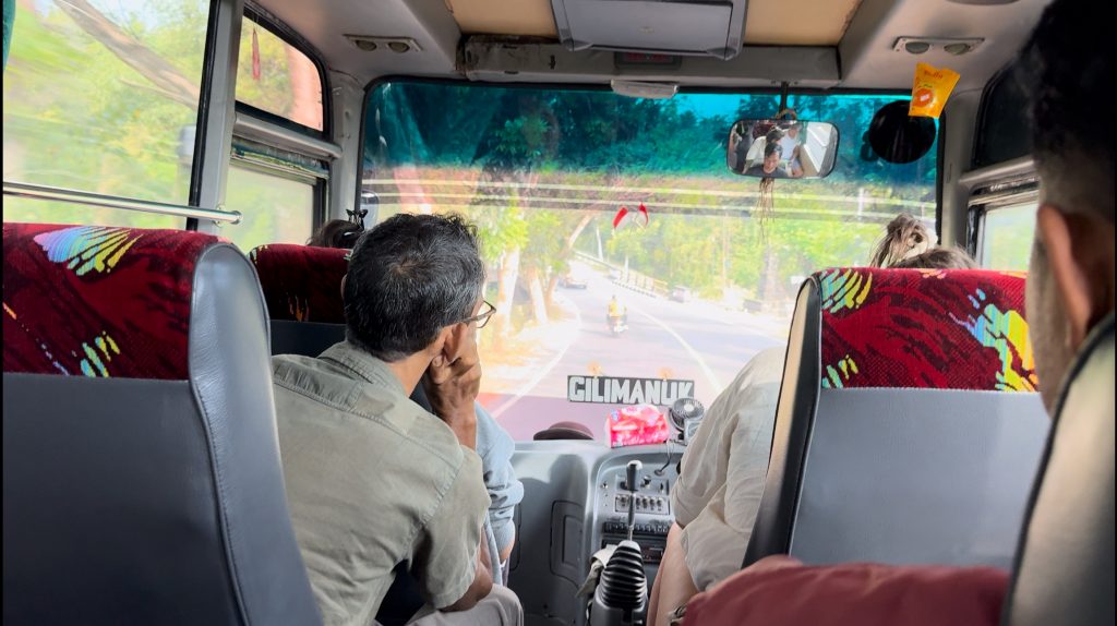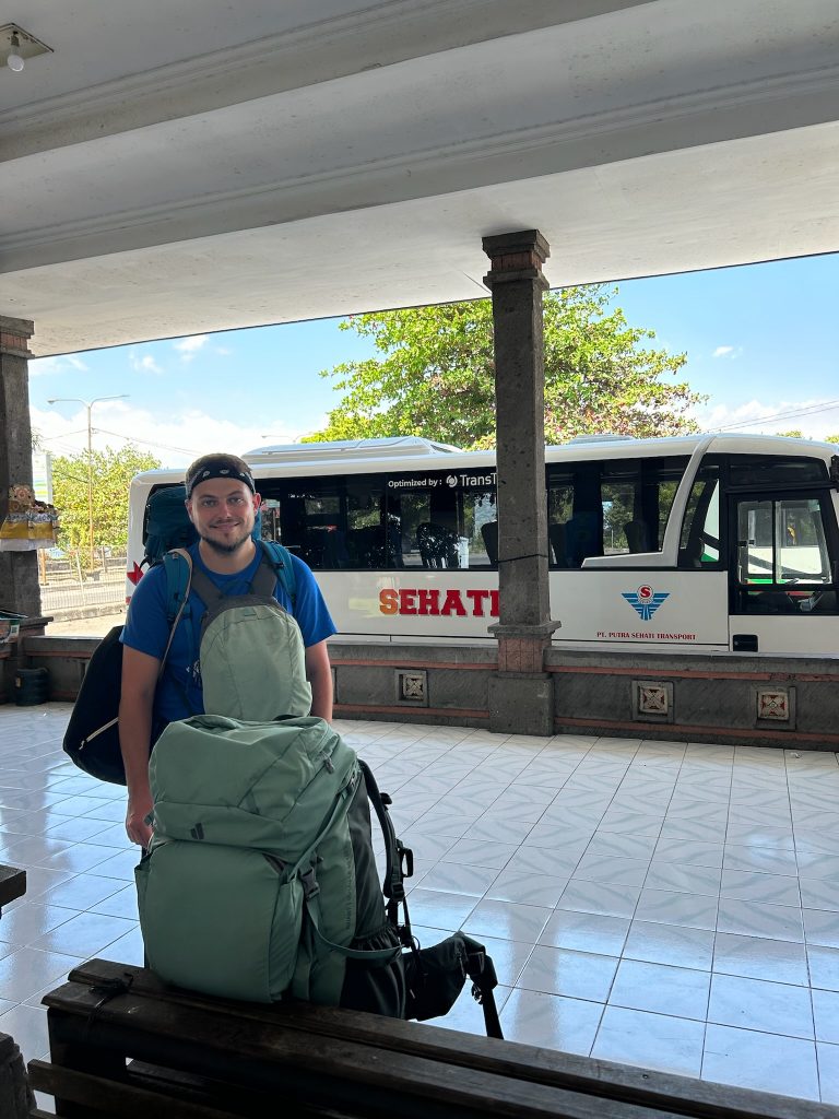 Direkt gegenüber vom Fähranleger war das Busterminal. Dort wurden wir wieder zich mal vom Taxi- und Busfahrern angesprochen, aber wir hatten ja ein Ticket und hielten nach dem Anbieter ausschau. Als wir den passenden Bus gefunden hatten, vergewisserten wir uns bei einem Fahrer ob er nach Ubung/Denpasar fährt. Plötzlich merkten wir, dass die Uhren 13:15 Uhr anzeigten. Was wir nicht wussten, auf Bali ist eine Stunde Zeitverschiebung nach vorne und wir hatten anscheinend den Bus für 12:45 Uhr gebucht :D. Den hatten wir also verpasst, aber da dieser für uns zusammen nur 6€ gekostet hat, ist es verkraftbar. Während wir online den Zeitplan checkten, wurden wir wieder angesprochen für einen Bus nach Denpasar, der in 20 Minuten abfahren sollte. Marco konnte den Fahrkartenpreis von 6€ auf 4€ pro Person runterhandeln, wir packten unsere Rucksäcke in den Laderaum und setzten uns rein.