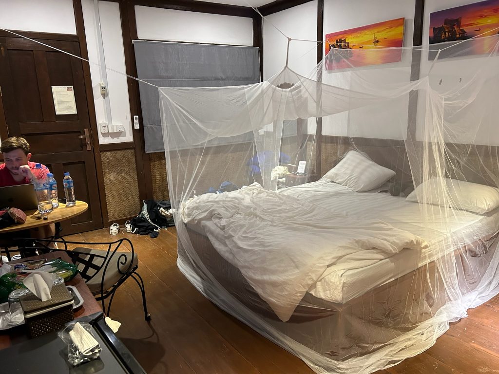 Gegen 13 Uhr kamen wir bei der Unterkunft an, ein kleiner Bungalow aus Holz, die wir über Airbnb für sechs Tage gebucht hatten. Die Bungalow-Anlage wird von Mr. Veng betreut, der kein Englisch kann aber unnormal nett und aufmerksam ist. Er hat uns empfangen und unser Haus gezeigt. Da alles noch ziemlich anstrengend war, chillten wir den Rest des Tages auf dem Zimmer und recherchierten. Mit Klimaanlage war es hier gut auszuhalten. Abends besorgte Marco uns Abendessen aber da wir noch nicht viel Hunger hatten, packten wir die Reste in unseren Kühlschrank. In dem Zimmer waren leider ziemlich viele Mücken. Deshalb kam zum ersten Mal unser Mosquito-Netz zum Einsatz, welches wir – zuerst nicht so erfolgreich – aufspannten.