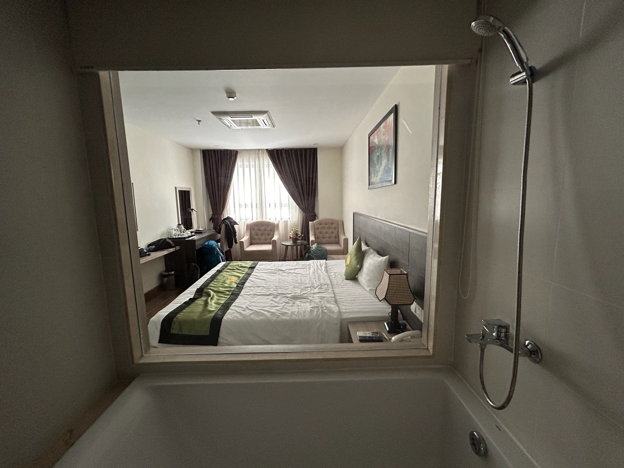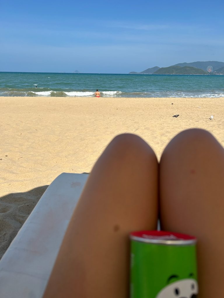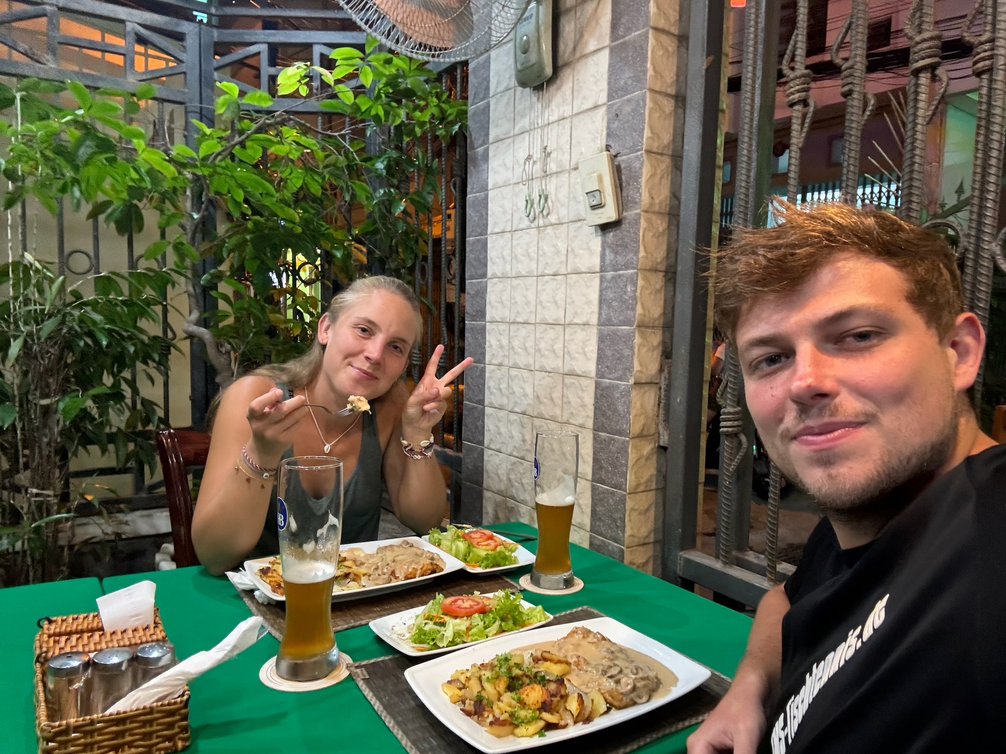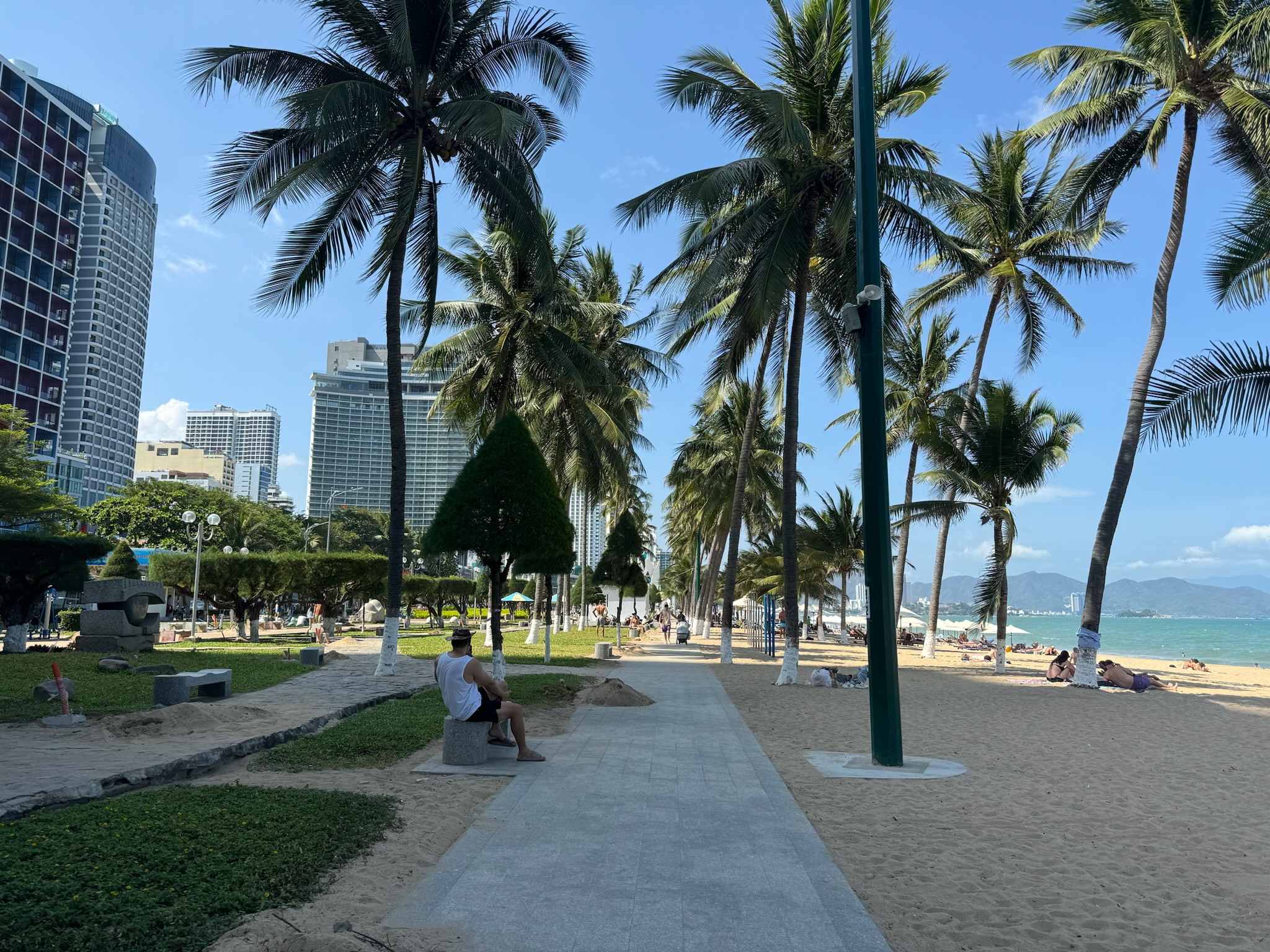 In Nha Trang angekommen, wurden wir an der Beachfront rausgelassen und mussten von dort nur 10 Minuten zu unserem Hotel laufen. Wir konnten uns ein 4-Sterne Hotel mit Pool für 12 € die Nacht gönnen und checkten um 12:30 Uhr für vier Nächte ein. Leider war das Internet im Zimmer mal wieder ziemlich schlecht. Schräg gegenüber konnten wir unsere Wäsche abgeben. Am frühen Nachmittag liefen wir zum Strand und ein Stück die Promenade entlang. Die Hochhäuser und Hotels sind bis an die Promenade gebaut, dazwischen verläuft eine Straße und die Promenade ist gesäumt von Palmen. Wir entschieden uns, uns auf zwei Liegen zu legen, da es auch recht windig war. Der Sand ist eher grobkörnig und die Wellen ziemlich stark. Vorher holten wir uns noch Snacks, Wasser und Früchte. Um 17 Uhr mussten wir von den Liegen runter, weil sie eingesammelt wurden. Da die Sonne schon hinter den Hochhäusern verschwunden war, wurde es langsam frisch und wir liefen zurück zum Hotel. Um die Uhrzeit konnten wir auch schon wieder unsere Wäsche abholen. Im Hotel hüpften wir noch in unseren Pool auf dem Dach. Um 19 Uhr gingen wir ins „Haus Bremen“, welches wir entdeckt hatten, und gönnten uns dort mal wieder ein Schnitzel. Dabei haben wir uns noch etwas mit dem deutschen Inhaber unterhalten. Danach liefen wir mit einem Eis noch ein bisschen durch die belebten Straßen.
