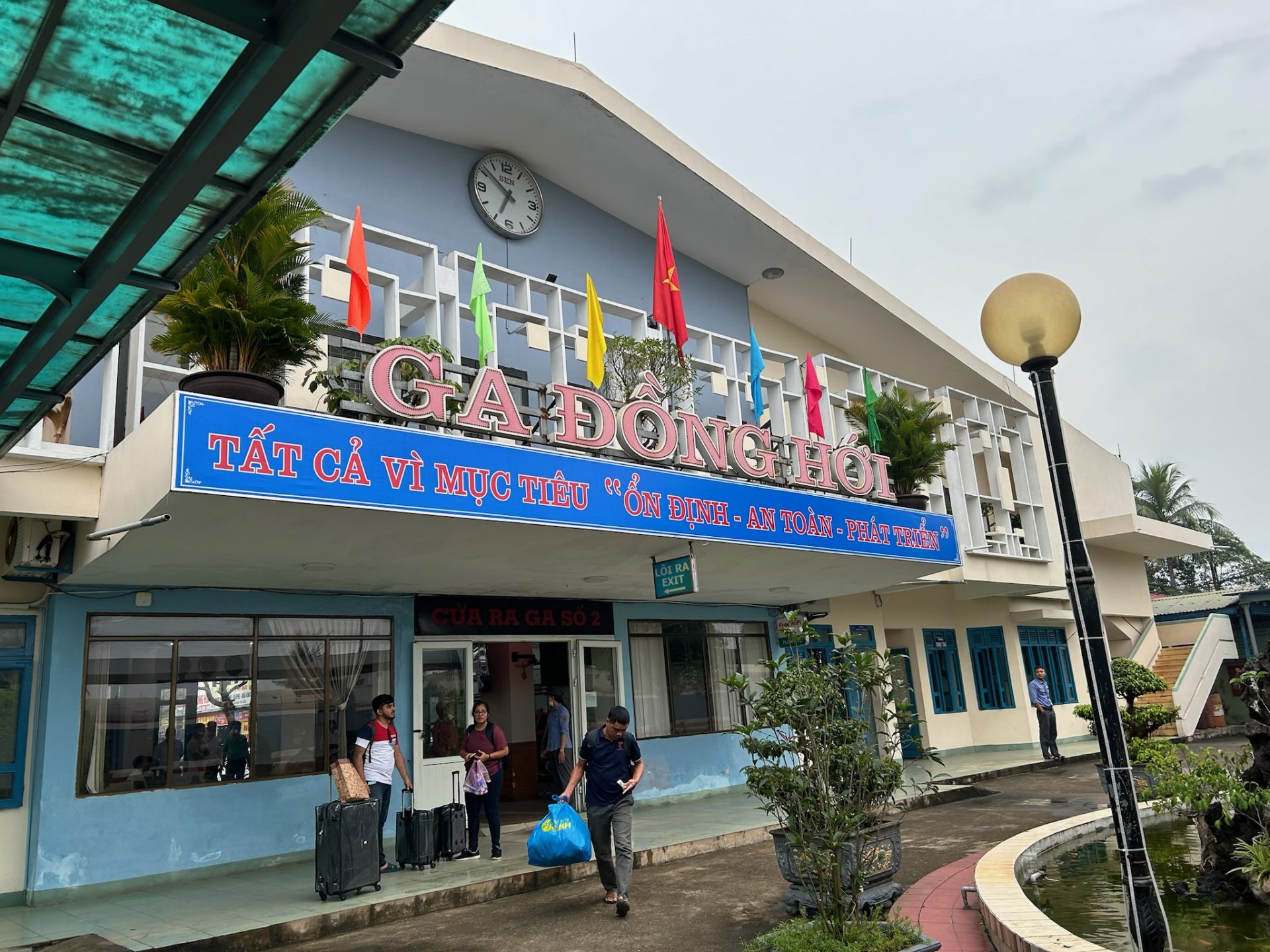 In der Nacht hat es wohl mal geregnet. Heute klingelte um 5 Uhr der Wecker, um 6 Uhr haben wir ausgecheckt und holten uns diesmal ein Grab zum Bahnhof. Vorm Bahnhof hatten wir ein gutes Lokal entdeckt, bei dem wir uns Frühstück to go (Banh Mi und Pancakes) bestellten und um 7 Uhr kam unser Zug nach Ninh Binh. Da in kurzer Zeit zwei Züge einfuhren, wussten wir nicht, welches unserer war. Als wir das Personal nochmal fragten, hatte der zweite Zug den ersten schon versperrt. Wir hätten über die Gleise gehen müssen, bevor der zweite Zug einfuhr. Also mussten wir mit Hilfe des Personals durch den Zug durch steigen. Wir hatten wieder Sitze auf der rechten Seite (Wasser-Seite) – jetzt hatten wir es raus mit der Sitzplatzreservierung! Nur leider fuhren wir nicht an der Küste lang. Es war anfangs auch sehr bedeckt und regnerisch aber die Aussicht war trotzdem schön. Wir hatten 9 Stunden Fahrt vor uns, haben viel geschlafen aber konnten die Zeit auch gut zum Arbeiten nutzen. Um ca. 16 Uhr sind wir in Ninh Binh angekommen und gingen 20 Minuten zu unserer Unterkunft, einem Bungalow in einer Sportanlage (mit Pool und Fitnessstudio). Wir checkten für drei Nächte ein und mieteten einen Roller für die zwei Tage. Wir chillten im Zimmer bis wir abends zum Essen in das eigene Restaurant gingen, danach testete Marco noch das Fitnessstudio.
