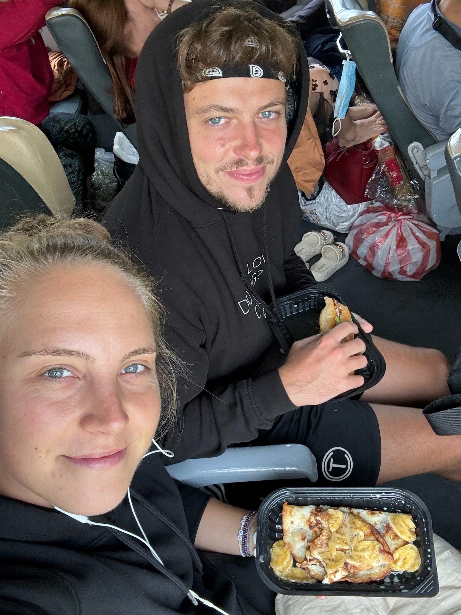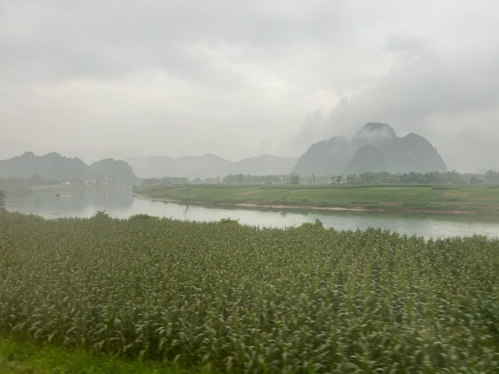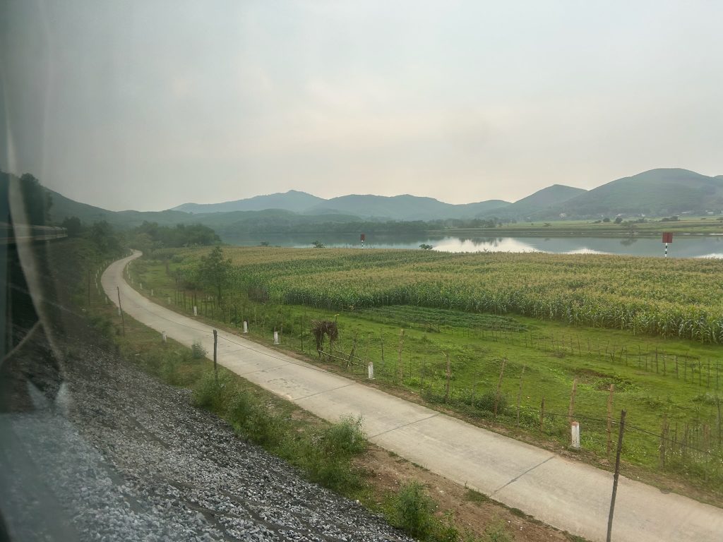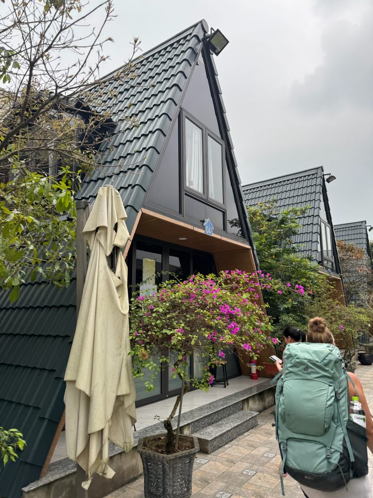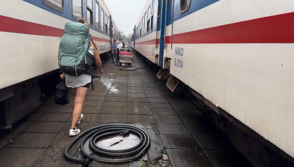 In der Nacht hat es wohl mal geregnet. Heute klingelte um 5 Uhr der Wecker, um 6 Uhr haben wir ausgecheckt und holten uns diesmal ein Grab zum Bahnhof. Vorm Bahnhof hatten wir ein gutes Lokal entdeckt, bei dem wir uns Frühstück to go (Banh Mi und Pancakes) bestellten und um 7 Uhr kam unser Zug nach Ninh Binh. Da in kurzer Zeit zwei Züge einfuhren, wussten wir nicht, welches unserer war. Als wir das Personal nochmal fragten, hatte der zweite Zug den ersten schon versperrt. Wir hätten über die Gleise gehen müssen, bevor der zweite Zug einfuhr. Also mussten wir mit Hilfe des Personals durch den Zug durch steigen. Wir hatten wieder Sitze auf der rechten Seite (Wasser-Seite) – jetzt hatten wir es raus mit der Sitzplatzreservierung! Nur leider fuhren wir nicht an der Küste lang. Es war anfangs auch sehr bedeckt und regnerisch aber die Aussicht war trotzdem schön. Wir hatten 9 Stunden Fahrt vor uns, haben viel geschlafen aber konnten die Zeit auch gut zum Arbeiten nutzen. Um ca. 16 Uhr sind wir in Ninh Binh angekommen und gingen 20 Minuten zu unserer Unterkunft, einem Bungalow in einer Sportanlage (mit Pool und Fitnessstudio). Wir checkten für drei Nächte ein und mieteten einen Roller für die zwei Tage. Wir chillten im Zimmer bis wir abends zum Essen in das eigene Restaurant gingen, danach testete Marco noch das Fitnessstudio.