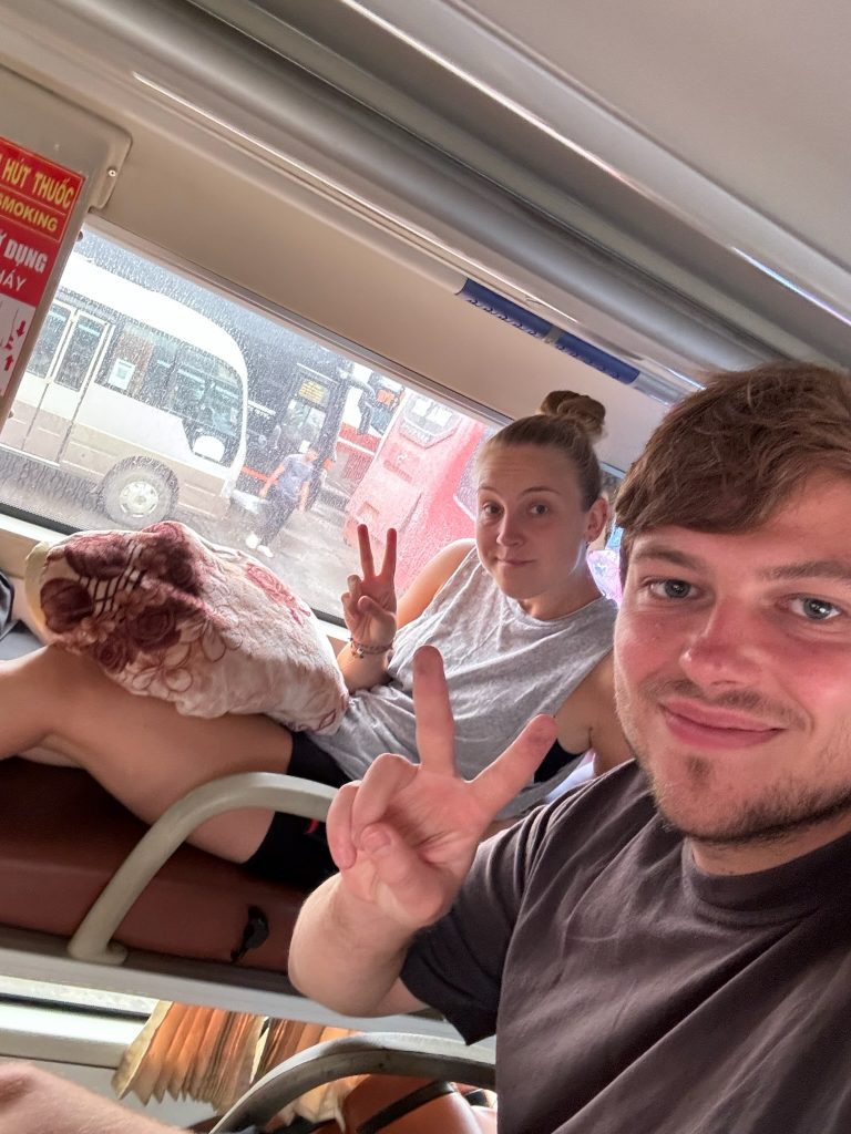 Wir sollten um 8:30 Uhr vor dem Hotel von einem Taxi abgeholt werden. Da kein passendes Café oder ähnliches Restaurant für ein Frühstück in der Nähe war, bestellten wir uns ausnahmsweise ein Banh Mi per Grab zum Hotel. Als nach 20 Minuten kein Taxi kam, kontaktierten wir das Booking Büro und wir sollten zur Hauptstraße gehen, wo ein Taxi stand. Mit 30 Minuten Verspätung fuhren wir dann los in die Innenstadt. Nachdem wir aussteigen sollten, kam ein Mann an und sagte, dass wir hier warten sollen. Wenig später kam er mit einem anderen Backpacker und setzte uns zusammen in ein neues Taxi. Wir fuhren ca. 30 Minuten durch die Stadt nach Westen raus zu einem großen Busterminal. Dort wartete ein Mann auf uns und wir folgten ihm zu unserem Bus. Wir waren anscheinend spät dran, denn er war ein wenig hektisch. Der andere Backpacker hatte ein anderes Ziel.