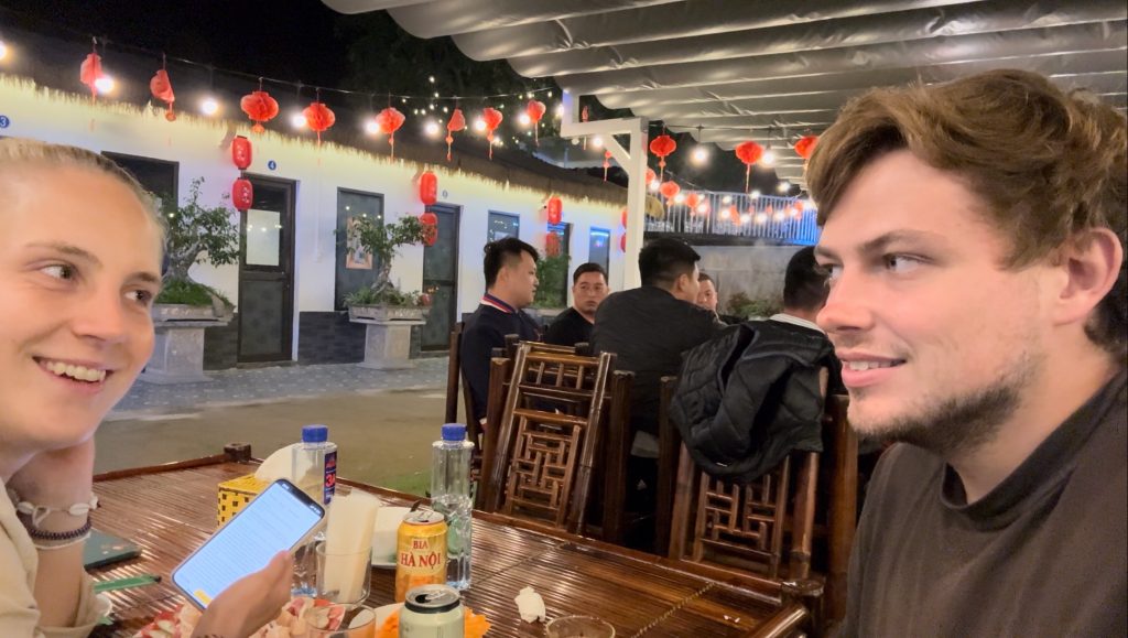 Um 10 Uhr fuhr der Sleeperbus los und anfangs hat es sogar geregnet – der perfekte Reisetag. Gegen 13:30 Uhr haben wir eine Mittagspause an einem Straßenrestaurant gemacht, wo auch wir uns wieder mal trauten, etwas zu essen. Von der kurvigen Fahrt wurden wir in den Schlaf geschaukelt, haben also leider nicht so viel von den Bergen gesehen. Gegen 17:30 Uhr kamen wir in Cao Bang an und wurden an einem Markt rausgelassen. Wir wollten ein Grab bestellen aber das gibt es hier wohl nicht. Als wir gerade loslaufen wollten (wären 30 Minuten gewesen), kam ein Taxifahrer auf uns zu und wir stiegen in sein Taxi. Als wir beim Homestay ankamen, haben wir zum ersten Mal etwas verloren – wir haben meinen Turnbeutel im Taxi vergessen, zum Glück war nur eine Wasserflasche drin. Nachdem wir eincheckten, skypten wir mit Marcos Familie zum Geburtstag seines Vaters. Wir fragten unsere Gastgeberin nach dem Local Bus zum Ban Gioc Detian Wasserfall (der Grund warum wir hier sind), von dem wir im Internet gelesen hatten, und sie zeigte uns die Abfahrtszeiten und wo wir die Busstation finden können. Danach liefen wir die Straße runter und setzten uns ins nächstbeste Restaurant für unser Abendessen. Hier hatten wir einfach super laute Tischnachbarn – das ist hier wohl auch üblich in der Kultur. Zurück im Homestay wollten wir über unsere Gastgeberin einen Bus nach Ha Giang buchen. Wir hatten gelesen, dass es für die Strecke nur einen Local Bus gibt. Man muss einmal umsteigen und die Fahrt dauert 9 Stunden. Sie hat uns sogar vorgewarnt, dass es anstrengend wird und ob wir das wirklich machen wollen, aber da es unsere einzige Möglichkeit ist, buchten wir den Bus.