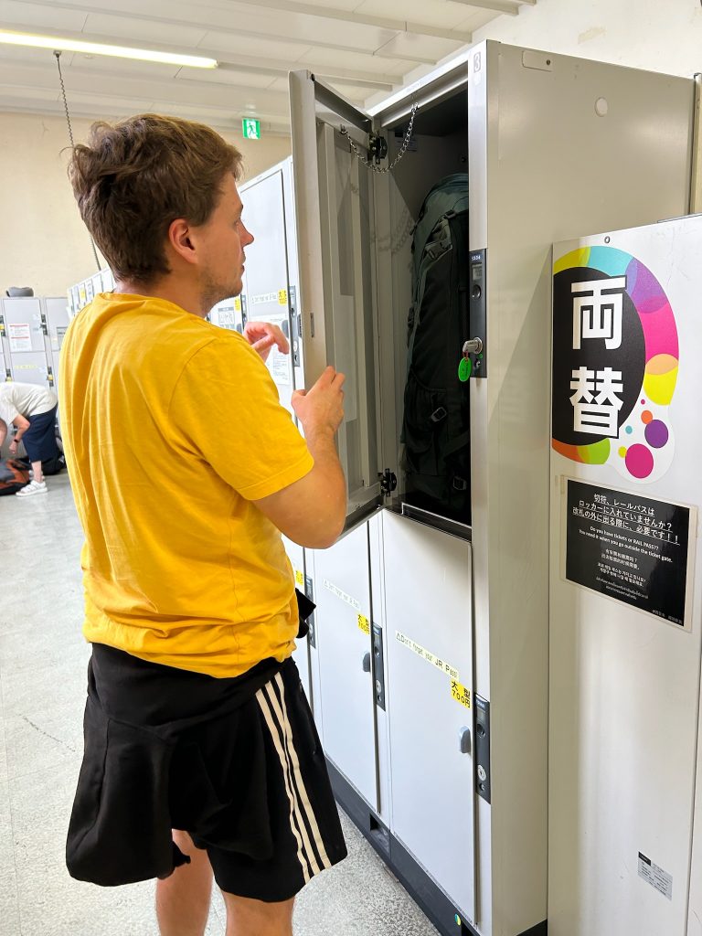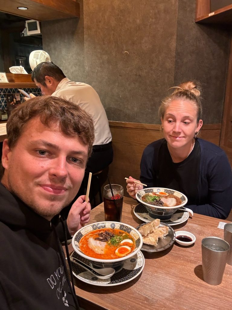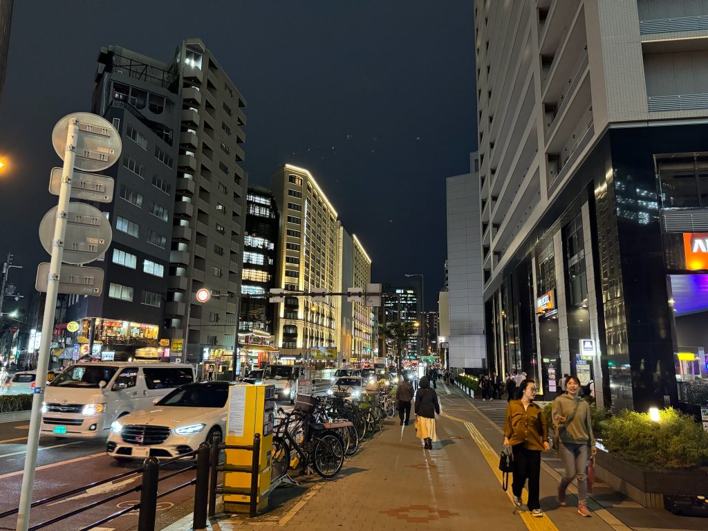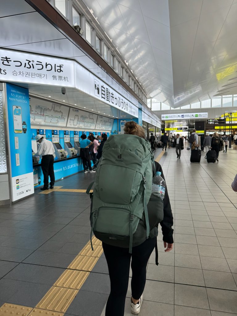 Nach einem schnellen Besuch des Gartens liefen wir die Straße entlang zurück zum Hauptbahnhof, holten uns noch einen Kaffee und kauften uns am Automaten Zugtickets (9€ p.P.) nach Osaka. Diesmal fuhren wir mit einem „normalen“ Zug, da die Fahrt nur ca. 1,5 Stunden dauerte. Gegen 16:30 Uhr kamen wir in Osaka am Hauptbahnhof an, liefen unterirdisch bis zur Metro-Station und fuhren noch eine Station bis zu unserem Hotel. Einer der Ausgänge lag einfach direkt vor unserem Hoteleingang. Wir checkten für sechs Nächte ein und ruhten uns im Zimmer aus. Später gingen wir zum Abendessen in ein kleines Rahmen-Lokal an der Straße gegenüber vom Hotel (was mir leider nicht so gut geschmeckt hat).