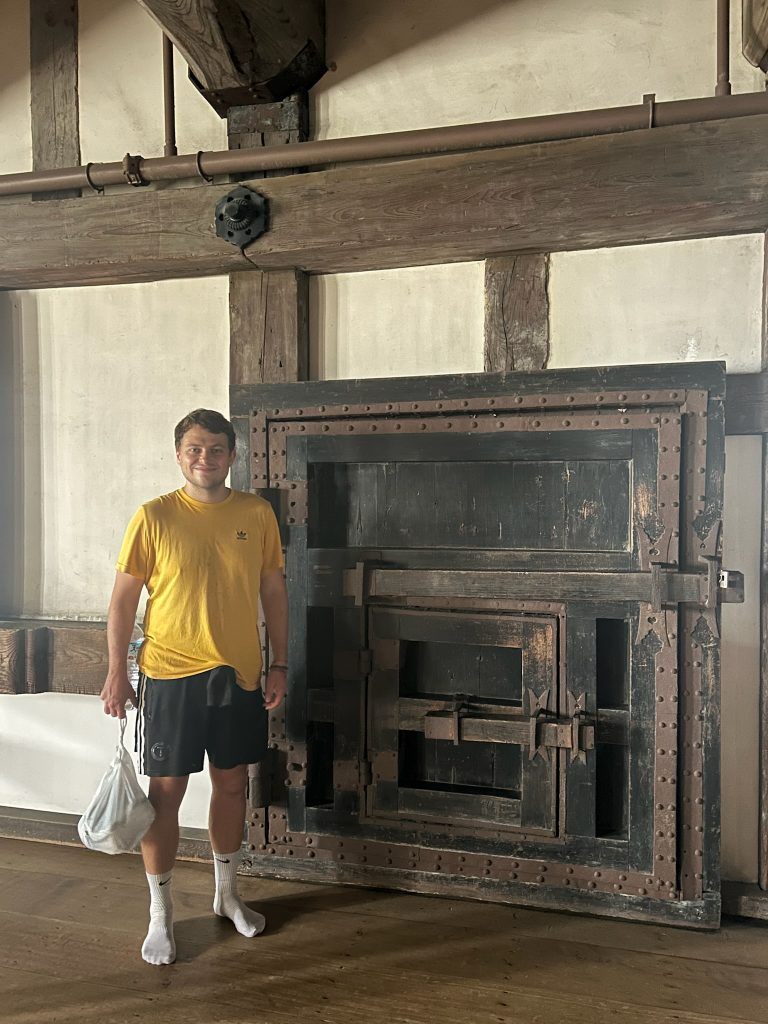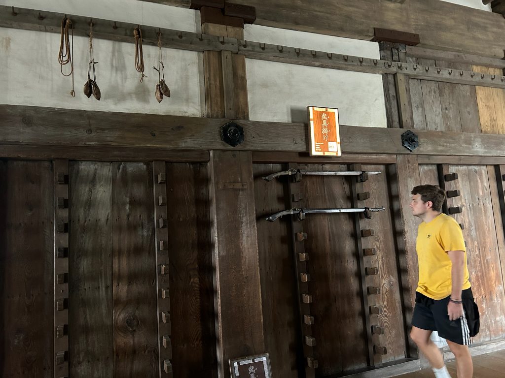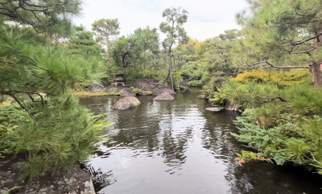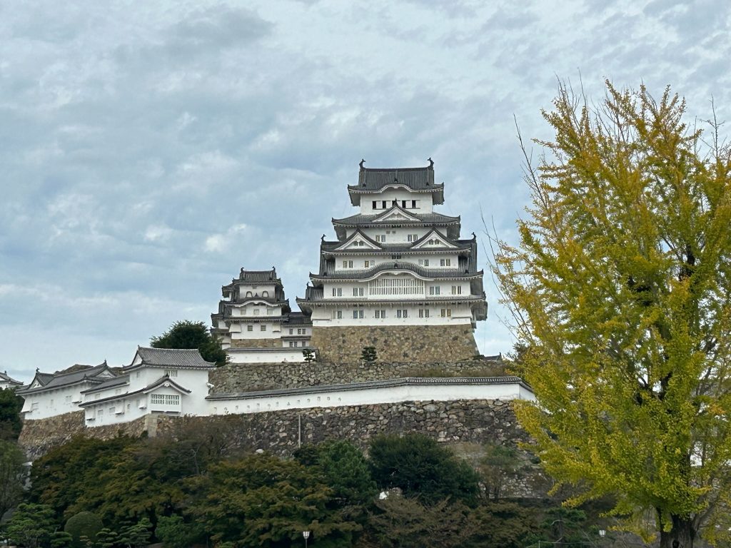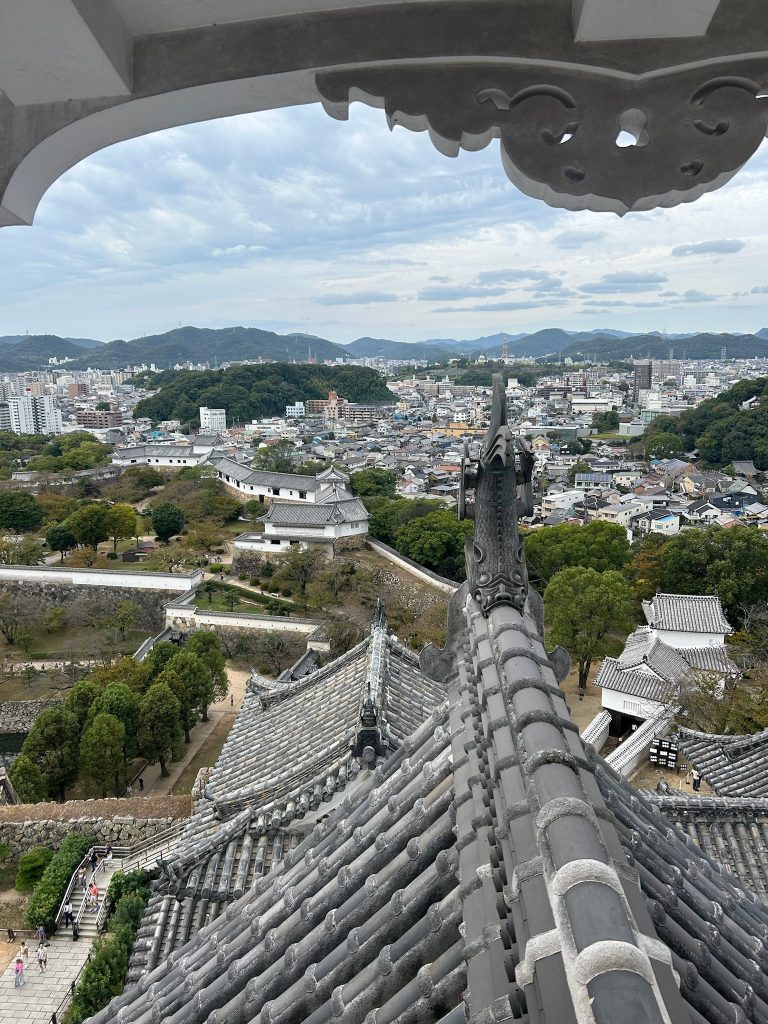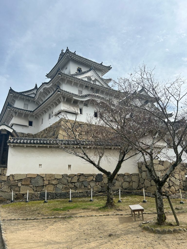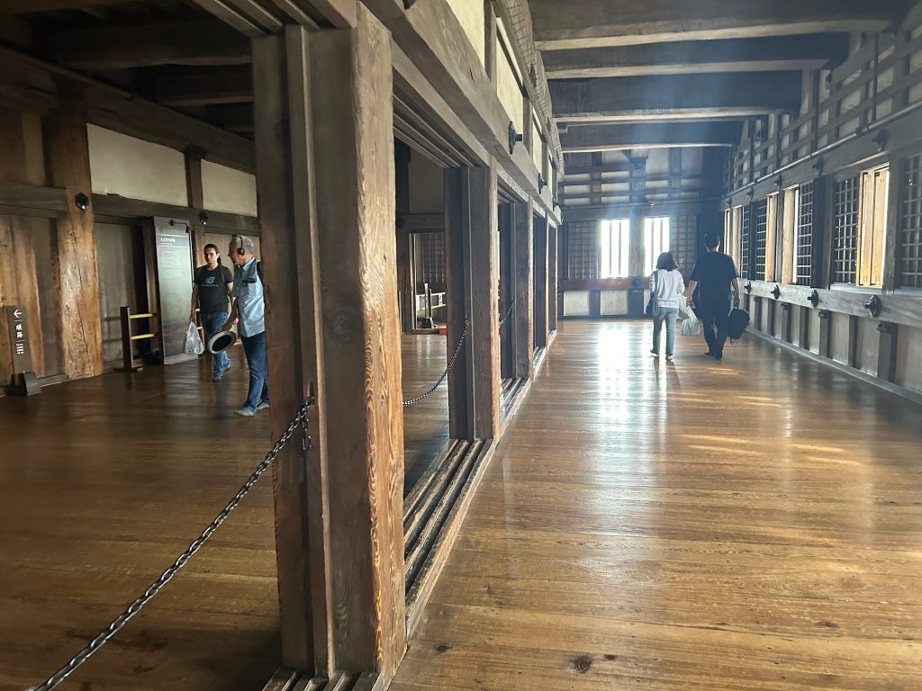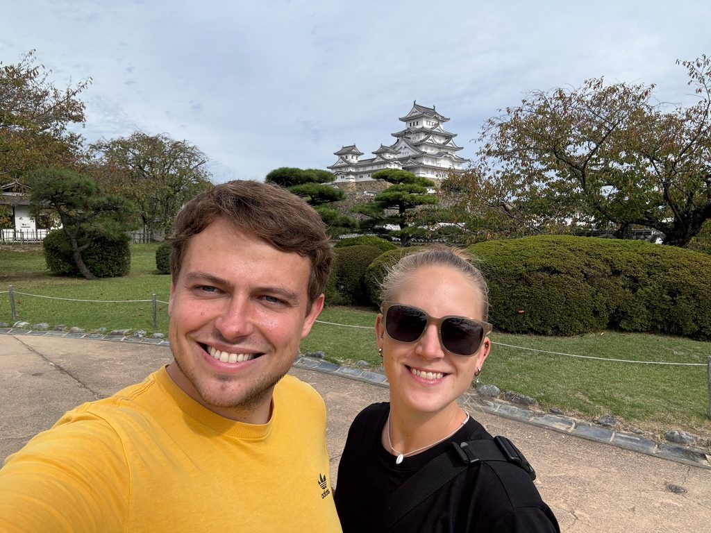 Um kurz nach 9 Uhr checkten wir aus und gingen in unser Stamm-Café zum Frühstücken. Danach liefen wir zu einer Bushaltestelle an der Kreuzung und fuhren mit einem Bus ca. 15 Minuten bis zum Bahnhof und kamen knappe 20 Minuten vor Abfahrt an. Um 11 Uhr ging unser Schnellzug nach Himeji, die Fahrt dauerte eine Stunde. Der Ort liegt auf halber Strecke nach Osaka, unserer letzten Destination in Japan. Hier wollten wir uns das bekannte Schloss Himeji anschauen. Im Bahnhof packten wir unsere Rucksäcke in ein Schließfach (4-5€) und liefen ca. 20 Minuten die lange Straße runter bis zum Schloss, das man vom Bahnhof schon sehen konnte. Wir kauften uns Tickets (6,50€ p.P.) und liefen über das Gelände durch die vielen Mauern zum Schlosseingang. Hier mussten wir unsere Schuhe ausziehen, um das Schloss zu betreten. Innen war alles aus dunklem Holz und über schmale Leitern liefen wir durch alle fünf Etagen. Nach dem Rundgang liefen wir noch einmal um das Schloss herum bis zum Koko-en Garten, weil der Eintritt im Ticket inklusive war.