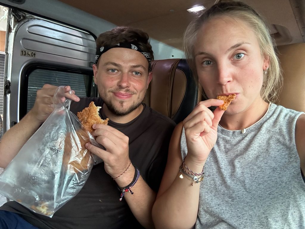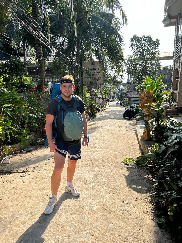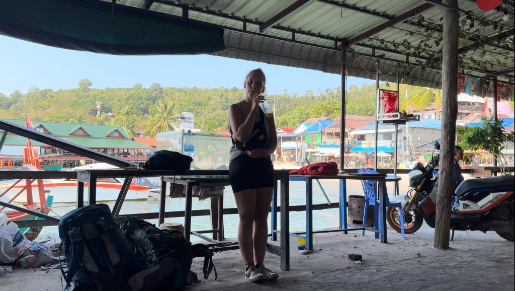 Um 7 Uhr standen wir auf und Marco holte uns Kaffee. Es dauerte ewig alle Stiche einzucremen. Nach dem Auschecken waren wir gegen halb Neun an der Straße und holten uns noch Frühstück bei einer Bäckerei, die mal ganz coole Sachen hatte. Dazu gabs noch Obst und einen Fruchtshake. Um 9 Uhr sollte die Fähre kommen aber sie hatte Verspätung. Als sie endlich kam, fuhren wir auch noch zur naheliegenden Insel Koh Rong Sanloem, um dort Fahrgäste einzusammeln, bevor wir ans Festland fuhren. Wir hatten Angst, dass wir zu spät ankommen und unseren Bus um 11 Uhr verpassen. Immerhin hatten wir ja die Handynummer und konnten Bescheid sagen. Wir sind aber noch rechtzeitig um 10:45 Uhr am Pier angekommen und haben dann erfahren, dass der Bus erst um 11:30 Uhr fährt. Also konnten wir noch in den 7-Eleven, um uns Wasser und Snacks für die Fahrt zu holen.