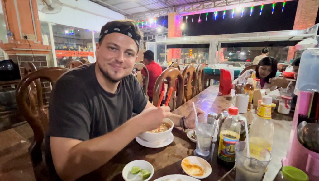 Um halb Zwölf ging also der Van Richtung Battambang. Da es leider keine Direktverbindung gab, mussten wir über Phnom Penh fahren. Nach 3 Stunden Fahrt hatten wir hier noch 30 Minuten Pause, in der Marco versucht hat, was essbares zu finden, bis wir um 15 Uhr mit einem Minibus weiter nach Battambang fuhren. Wir waren die einzigen Ausländer in dem Bus mit Einheimischen. Wir haben zich Mal angehalten, um Leute rein oder raus zu lassen. Zum Abendessen hielten wir in einem großen Restaurant an der Straße. Hier gab es für Marco eine scharfe Nudelsuppe und für mich, da mich nichts in den Töpfen angesprochen hat, einfach gebratenes Hähnchen mit Reis. Dazu gabs kalten Tee aufs Haus. Gegen 20:30 Uhr kamen wir in Battambang an und der Fahrer war so nett und fragte nach unserem Hotel. Er ließ uns an der Hauptstraße raus, in dessen Querstraße praktischerweise unser Hotel lag. Nach dem Einchecken liefen wir noch in den Supermarkt, um uns Wasser und Snacks zu holen.